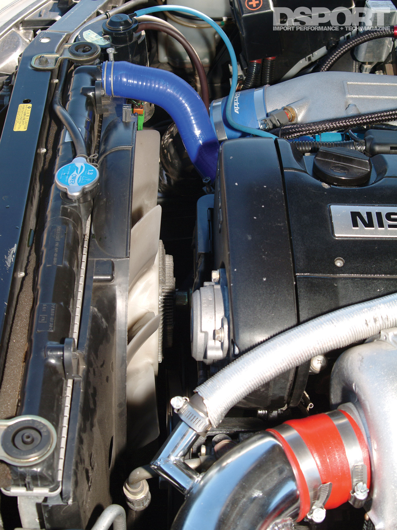 We had a number of options when it came to choosing a radiator and electric fan combination for our project GT-R. A number of Japanese companies produce high-performance radiators and there quite a few electric fan companies too. After establishing a good relationship with Fluidyne from all of the IDRC events that they support, we contacted Fluidyne to see if they had any interest in producing a direct-fit, high-performance replacement radiator for our Project GT-R. Even though there is a limited market for GT-R radiators in the states, Fluidyne was happy to become involved in hopes of expanding there overseas sales. One of the nice parts about the high-performance radiators from Fluidyne is that all of the original parts bolt directly in place.