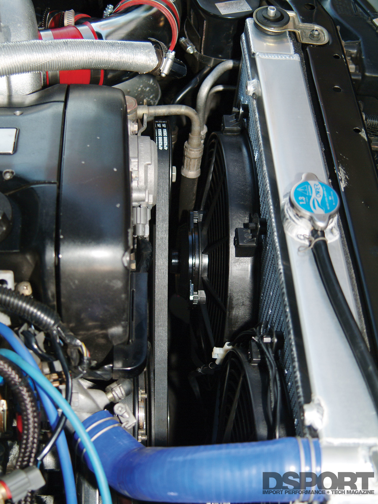 The purpose of the engine cooling fan is to induce airflow over the radiator. On the RB26DETT engine in our Skyline, a viscous clutch fan attaches to the water pump pulley and is driven by a V-belt from the crankshaft. It’s a simple and pretty effective design; however it has its drawback. For one, the factory fan is a bit on the noisy side when compared to electric fans. Additionally, the engine mounted fan takes horsepower to spin whereas an electric fan doesn’t tax the engine in the same way.