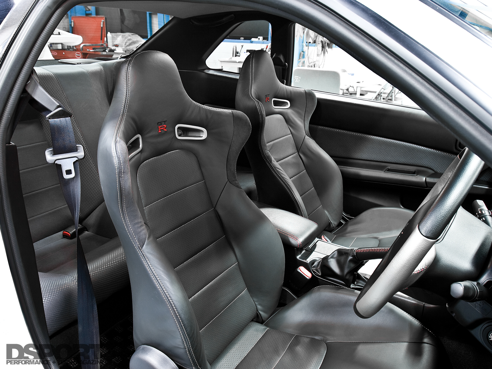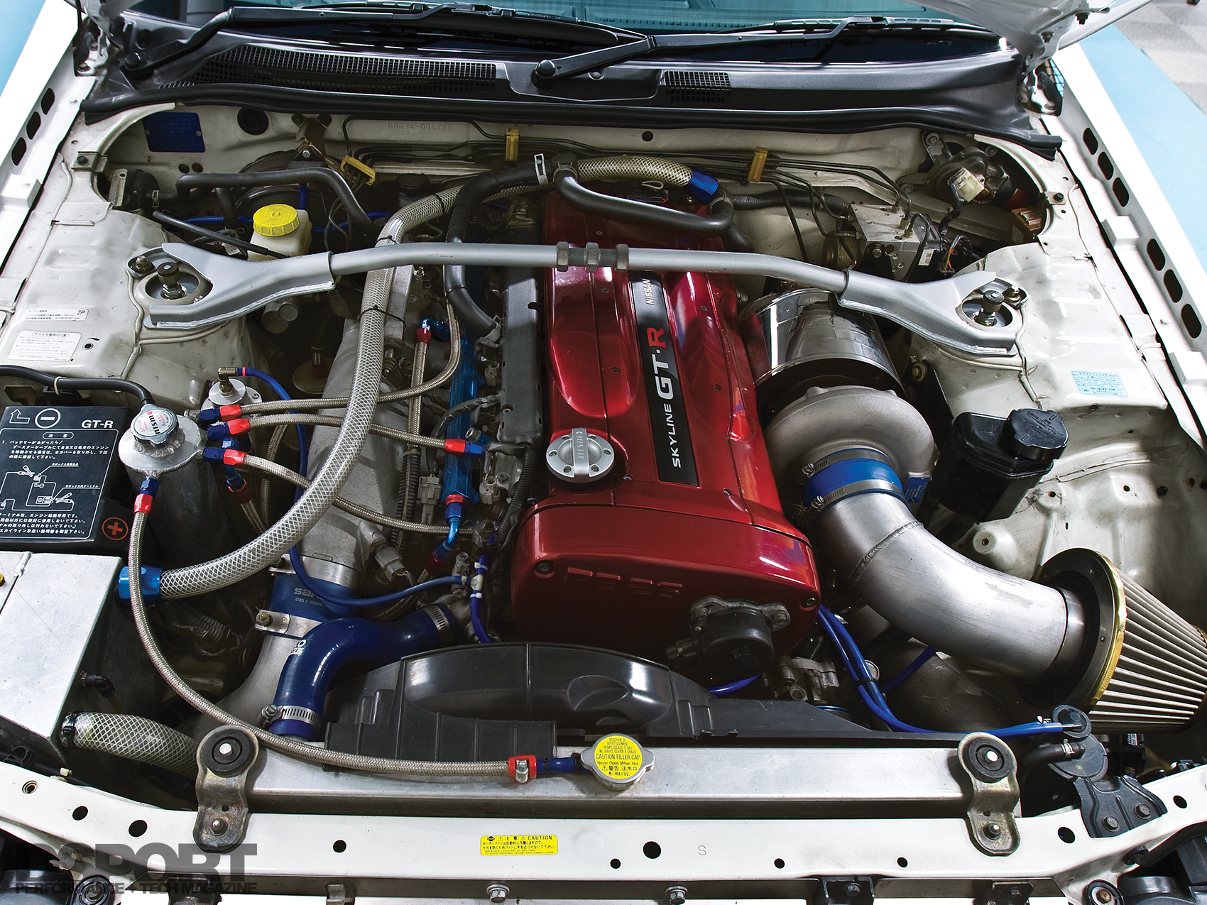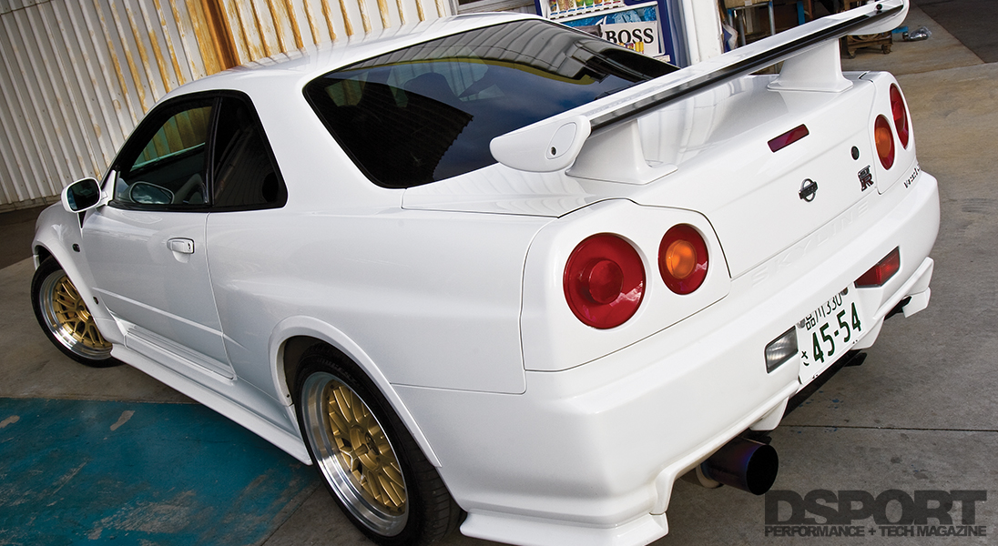The RB30 crankshaft has an OS Giken exclusive bolt pattern that requires the use of OS Giken’s R3C triple-plate racing clutch. With the clutch in place, the factory Getrag 6-speed transmission could be reinstalled. To best benefit from the incredible horsepower now on tap, upgrading the suspension became a priority. A set of Bilstein adjustable coilovers with 10 kgf/mm springs up front and 8 kgf/mm springs in the rear takes the place of the stock dampers and springs. The 12-way dampening, independent spring preload and independent ride-height adjustment give the GT-R improved road feel and a lower center of gravity. To further improve the GT-R’s road manners, lightweight BBS LM wheels with Bridgestone Potenza RE050 rubber fill the wheel wells. The 275/35R18 tires improve adhesion for better traction on and off the throttle. When off the throttle and on the brakes, stopping nearly two tons becomes an arduous task. Brembo 8-piston calipers clamp down on larger rotors up front, while 2-piston Brembo calipers handle braking duty in the rear. Stainless-steel braided brake lines improve brake response and pedal feel.