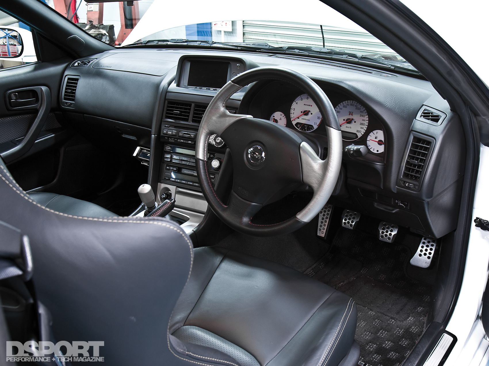 The interior of this GT-R remains largely unchanged. The HKS F-CON V Pro engine management is mounted to the bottom of the glove box, while the GReddy PRofec B boost controller is hidden away neatly out of sight. In the dash, a white-faced NISMO gauge cluster takes the place of the factory unit. On the outside, the light and strong NISMO Z-Tuned dry carbon-fiber fenders and hood replace the factory steel counterparts.
