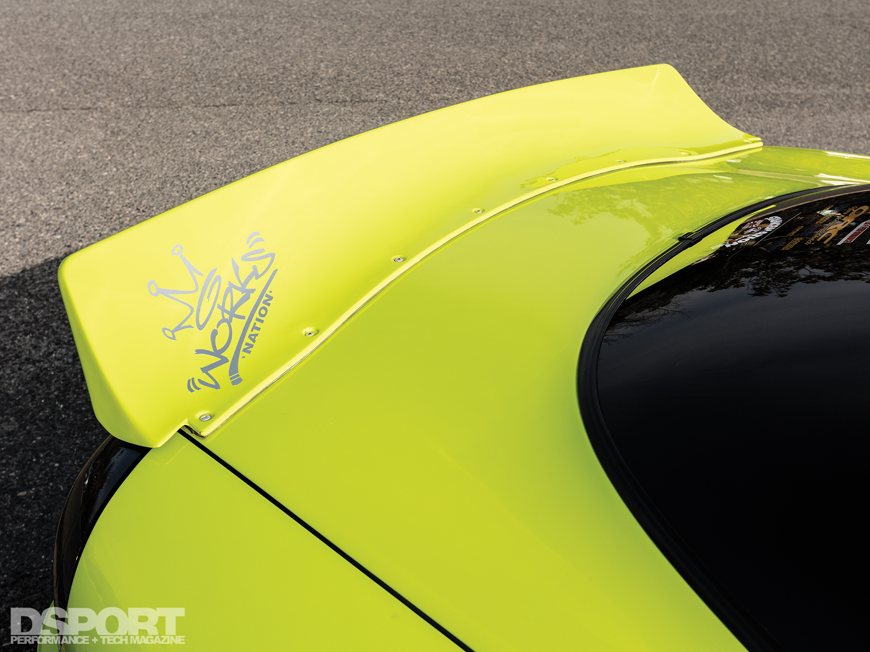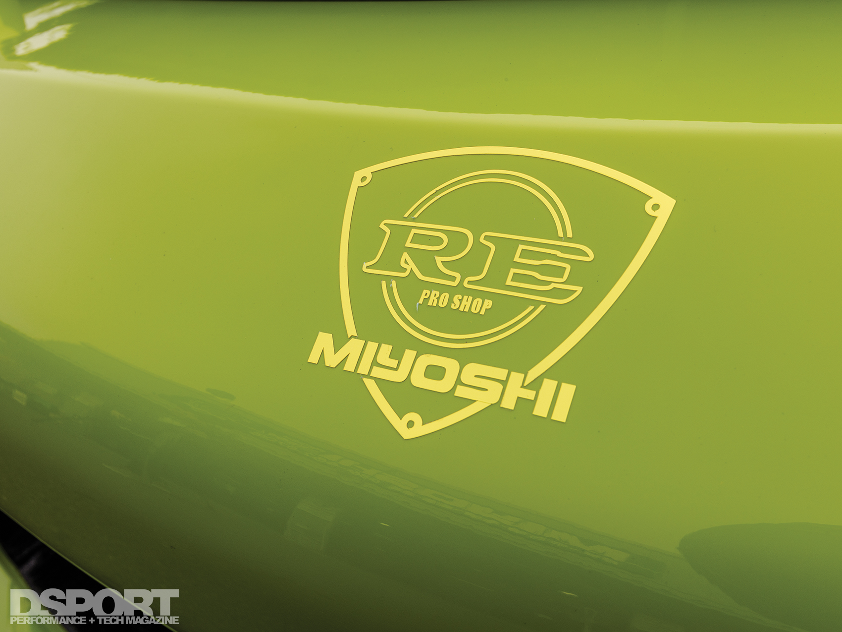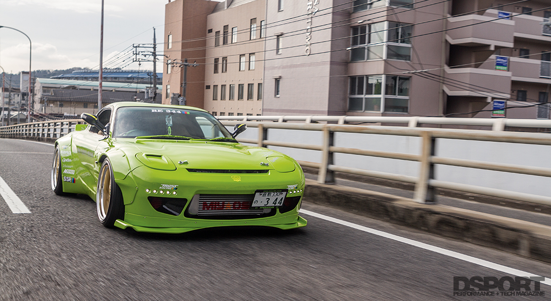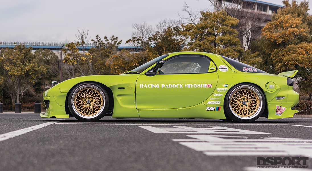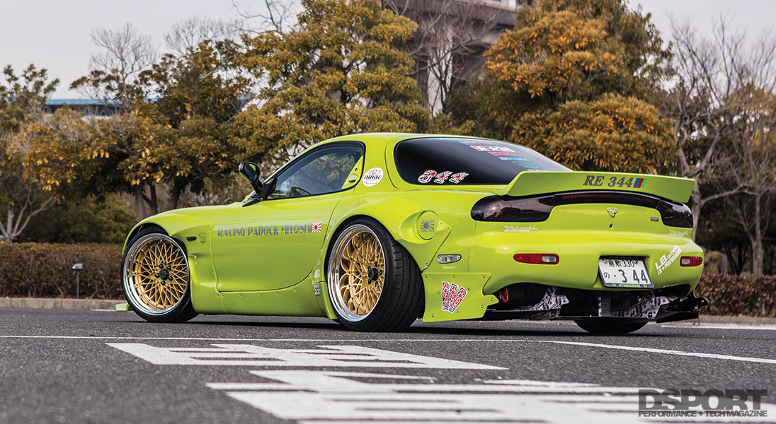 We took a closer look at RE344-01, the first of the series and the company’s current demo car. At first glance, the bright green hue of the exterior might seem over the top. Then, upon opening the hood, a mind-blowing number of US$100 stickers completely cover the engine bay and some of the ancillary components too. Despite this assault on the senses, a sizable GReddy T88-34D turbocharger can be seen just left of center toward the front of the engine, a reminder of the output potential of this 1.3-liter engine. To drive the turbine and generate boost, high enthalpy gasses collected at the exhaust ports flow into the turbine of the massive T88. From the turbine outlet, the downpipe feeds the spent gasses through an RE Amemiya Twin Dolphin Tail exhaust out to the rear of the chassis. Although this turbocharger is capable of supplying enough boost to develop over 600 horsepower, Miyoshi intended this demo vehicle to represent the roadgoing streetcar. Thus, the RE344-01 has been detuned to a modest 450 horsepower by way of an A’PEXi Power FC engine management system.