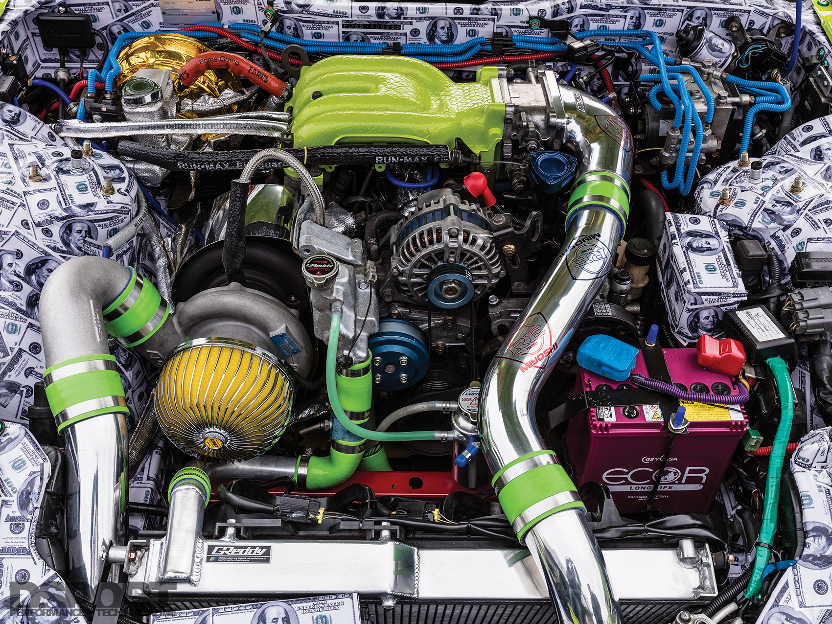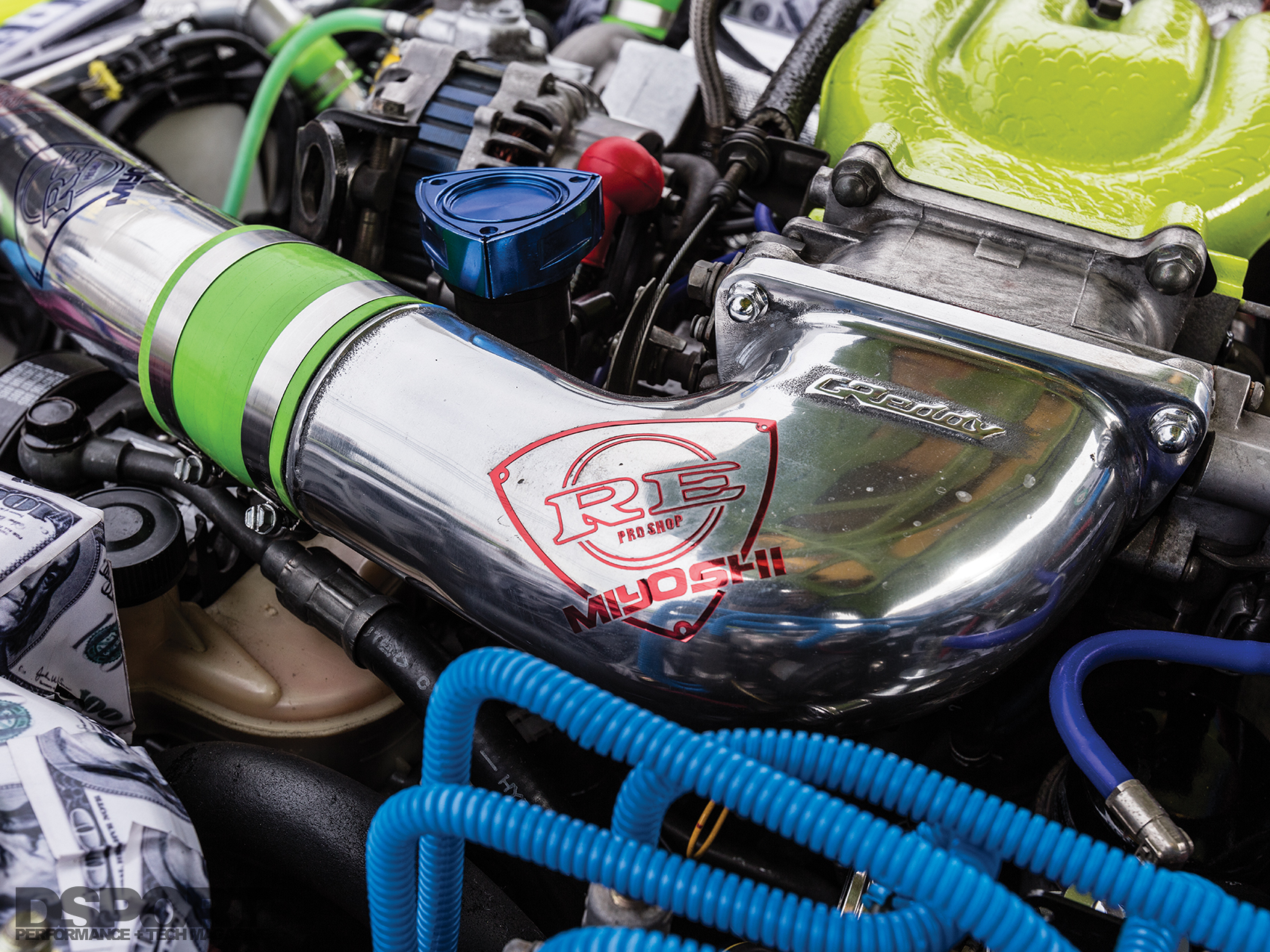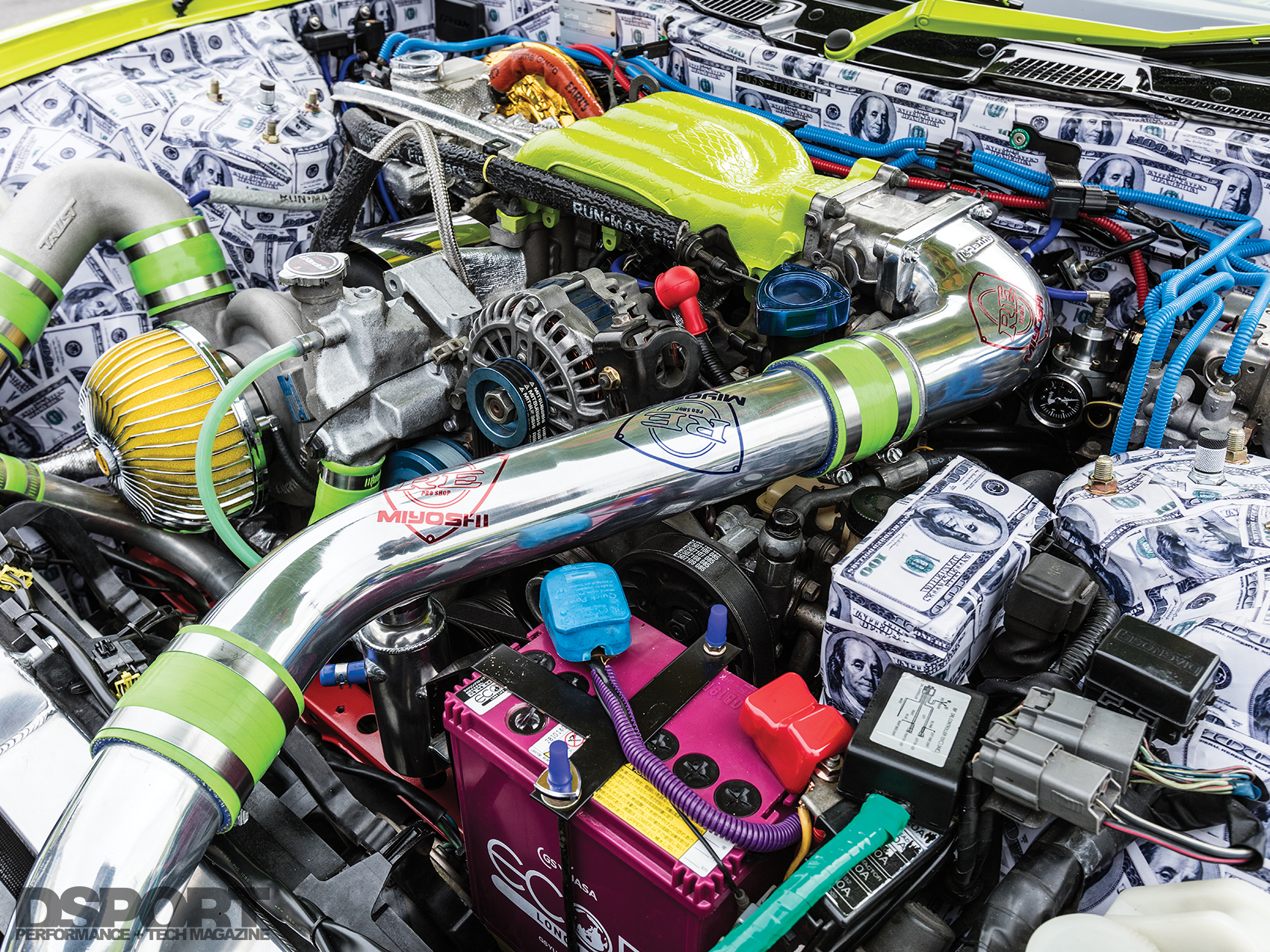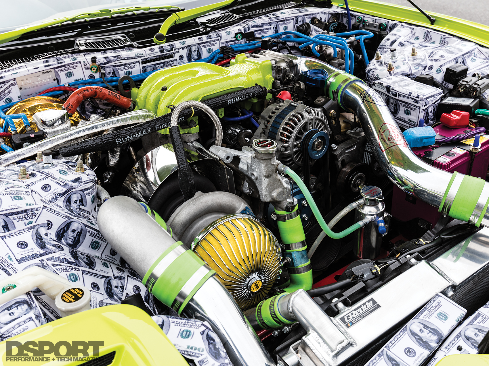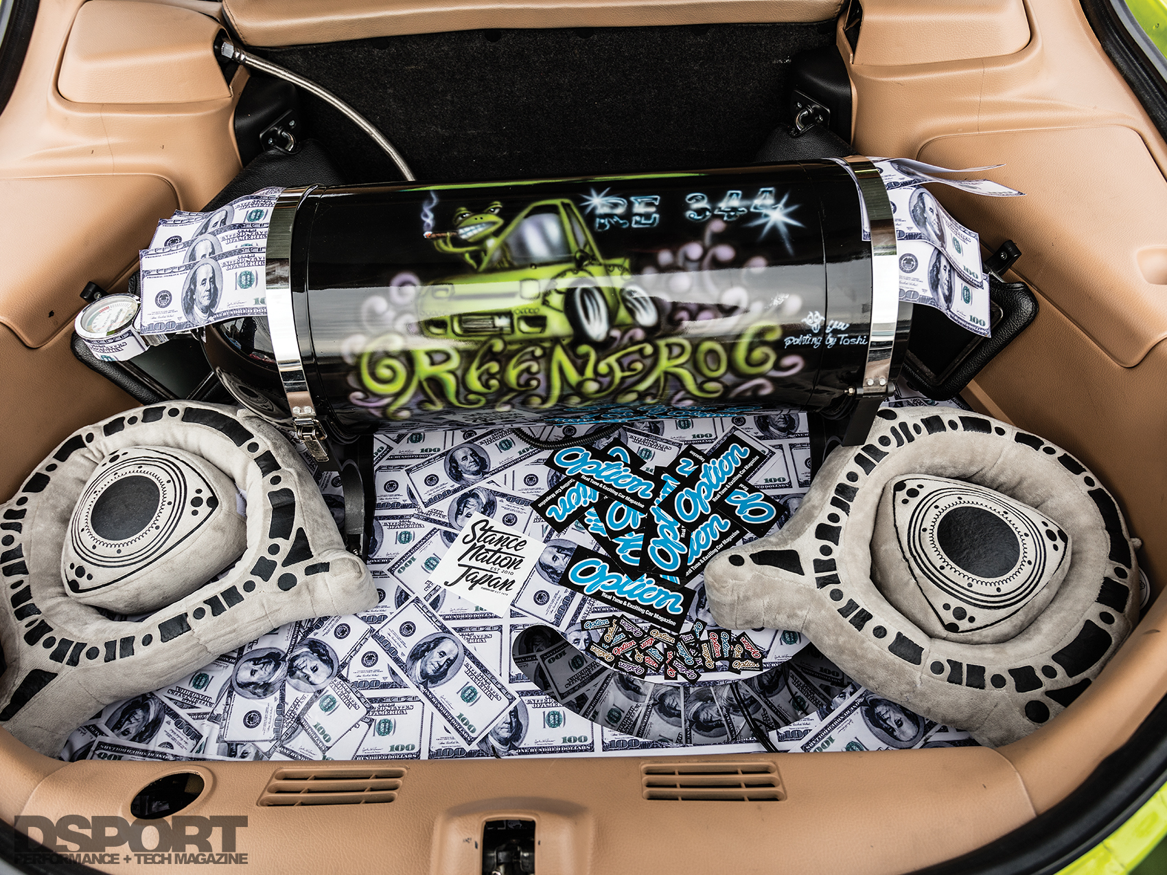 Inside the cabin of the RE344-01, Miyoshi implemented a makeover that continues the theme from the exterior. The dash trim, center console and door handles were painted the same green hue to match the shell of the RX7. The dash and the remaining interior components were covered in a tan shade to match the custom upholstered BRIDE Euro Star II reclining bucket seats. In the trunk area, an airbrushed subwoofer tube made to look like a nitrous oxide bottle shares the space with more one hundred dollar bill stickers, carried over from the engine bay.