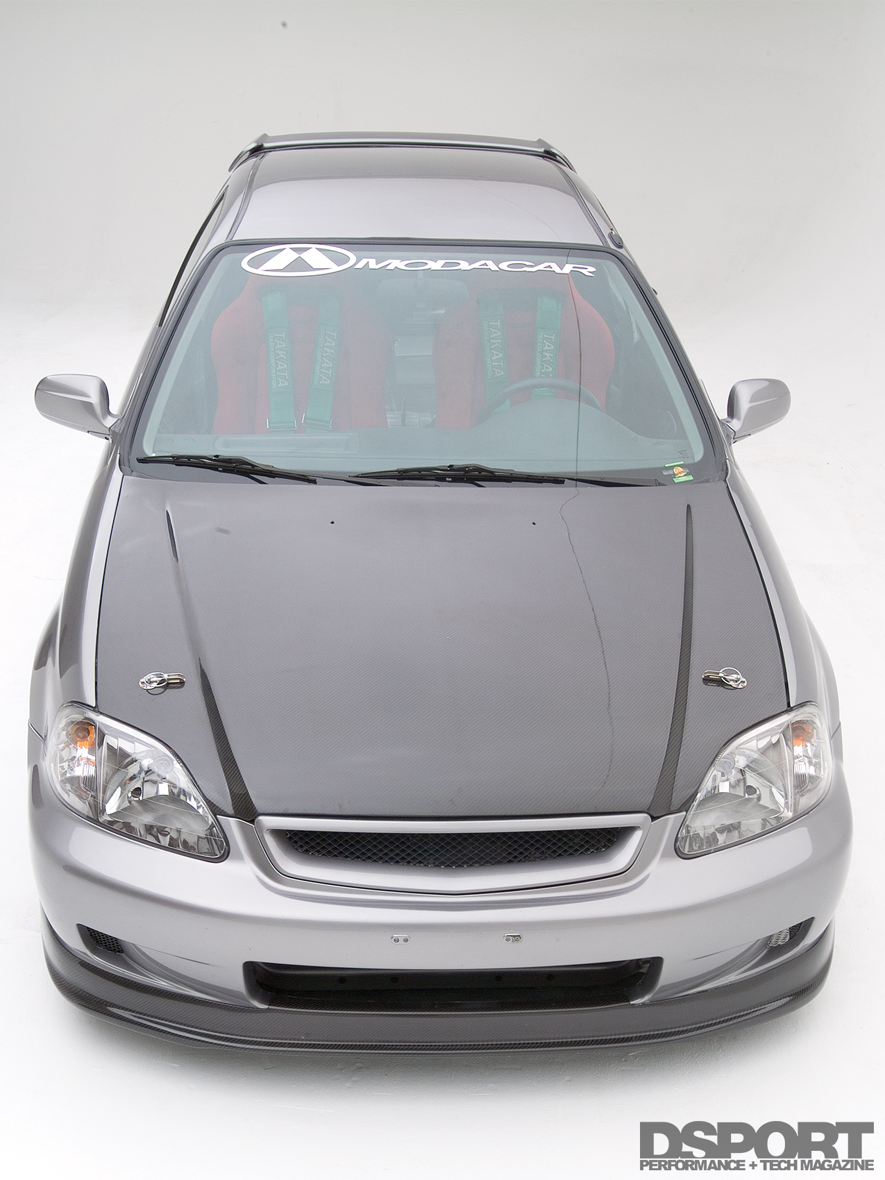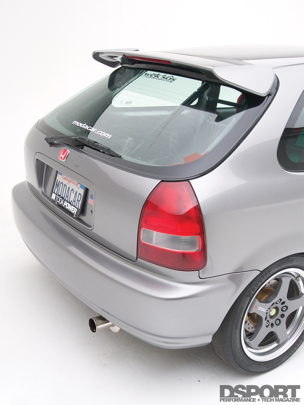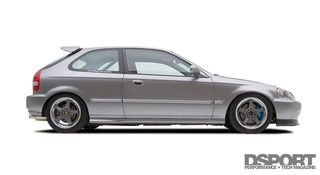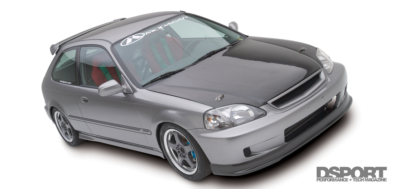 A number of remaining usable parts were also scavenged from the Type R. The 5-Lug knuckles, brakes and suspension components were bolted onto the EK. Tein RA coilovers set the ride height on all four corners. Wheel gap was eliminated with a set of Work Super Wheels’ RSZ-Rs 16 inch. The Works were wrapped with Toyo RA-1 tires. Power Slot rotors teamed with Hawk Performance HPT brake pads work in unison with Spoon Sports brake calipers. At this point, the car ran but was still missing the majority of the body panels. Locating the body panels took about two months to complete. The Civic’s body received a carbon-fiber hood and carbon-fiber front lip from Vision. Japanese Civic Type R headlights, taillights, mirrors and wing were also fitted onto the Civic body, transforming the car into a Civic Type R look-alike. After fitting the EK with the new body panels, the Civic was sprayed a factory Honda S2000 silverstone metallic hue.