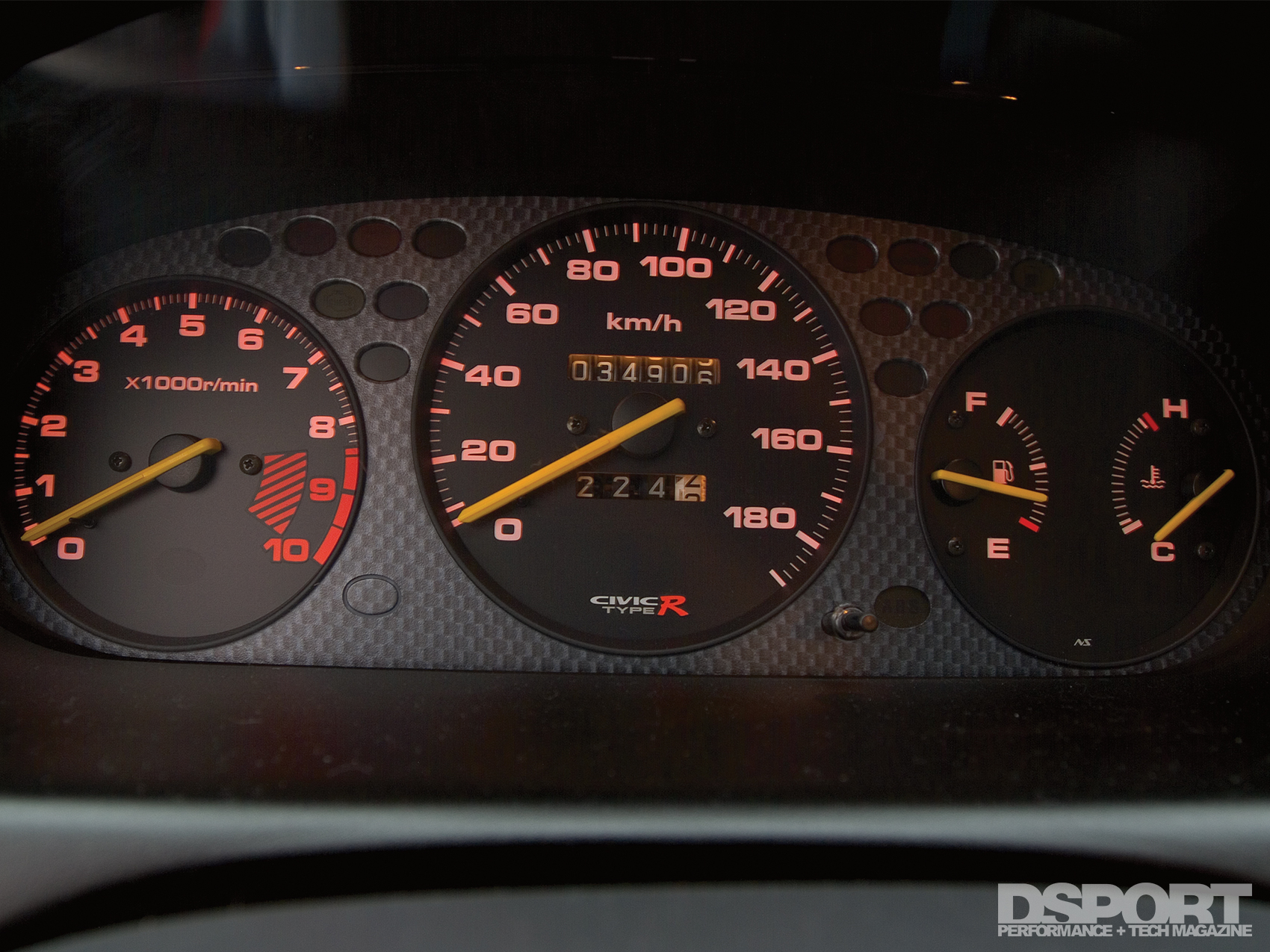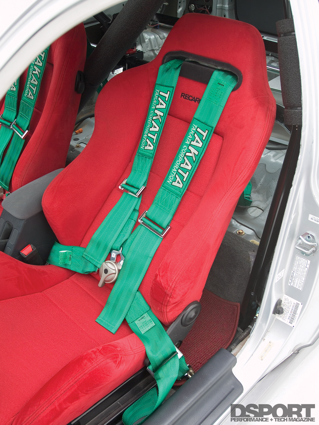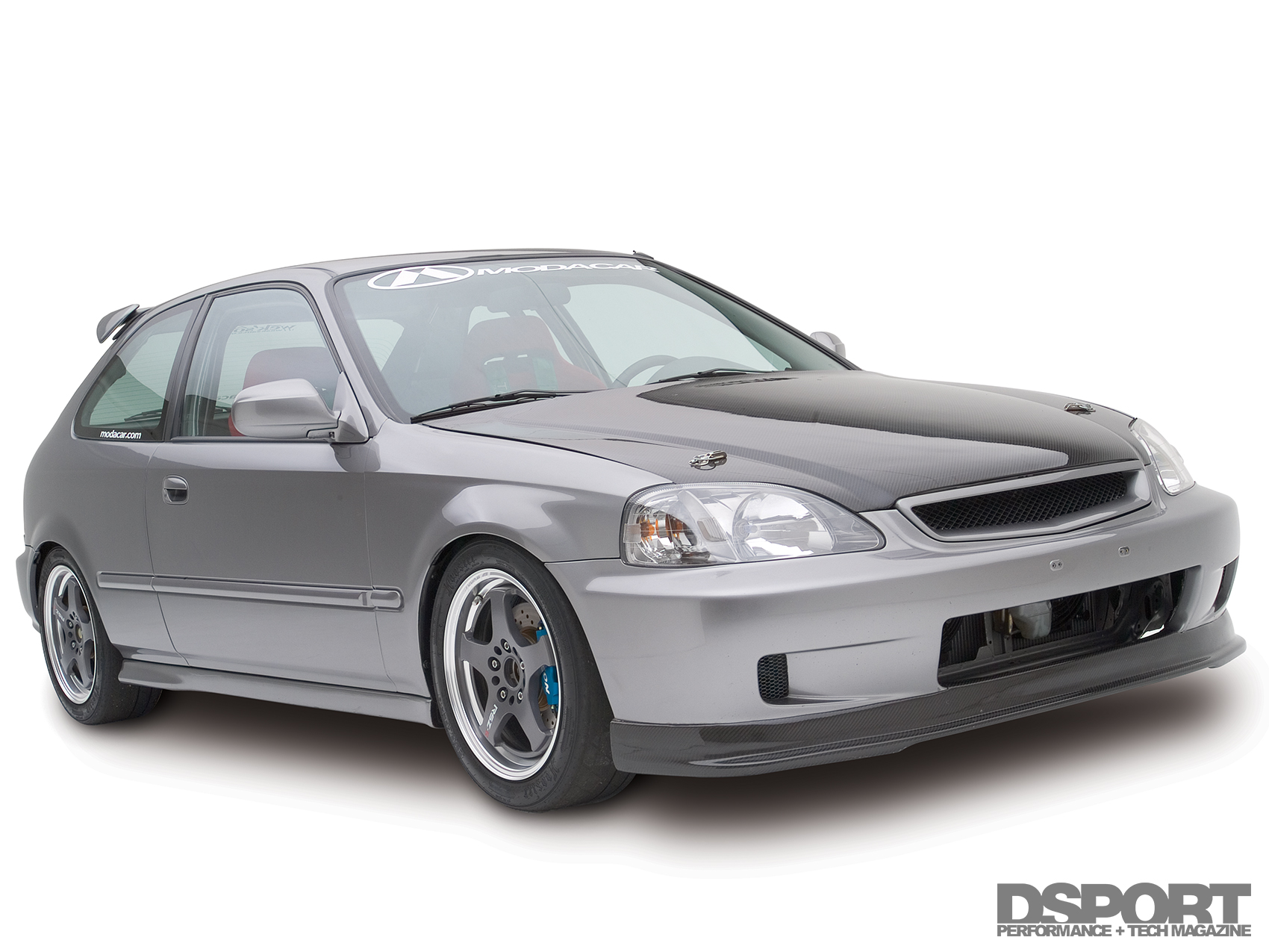 A number of remaining usable parts were also scavenged from the Type R. The 5-Lug knuckles, brakes and suspension components were bolted onto the EK. Tein RA coilovers set the ride height on all four corners. Wheel gap was eliminated with a set of Work Super Wheels’ RSZ-Rs 16 inch. The Works were wrapped with Toyo RA-1 tires. Power Slot rotors teamed with Hawk Performance HPT brake pads work in unison with Spoon Sports brake calipers. At this point, the car ran but was still missing the majority of the body panels. Locating the body panels took about two months to complete. The Civic’s body received a carbon-fiber hood and carbon-fiber front lip from Vision. Japanese Civic Type R headlights, taillights, mirrors and wing were also fitted onto the Civic body, transforming the car into a Civic Type R look-alike. After fitting the EK with the new body panels, the Civic was sprayed a factory Honda S2000 silverstone metallic hue.