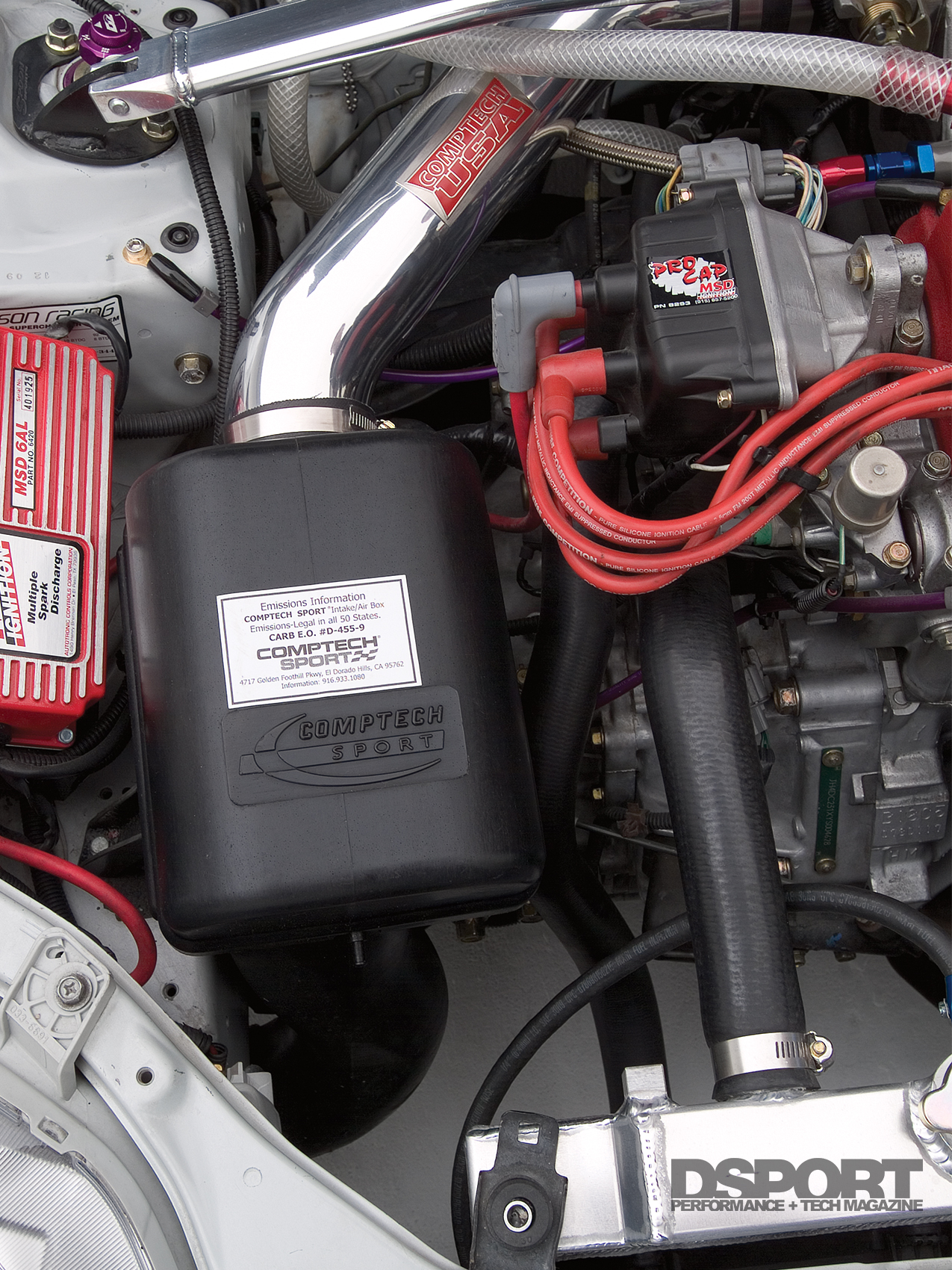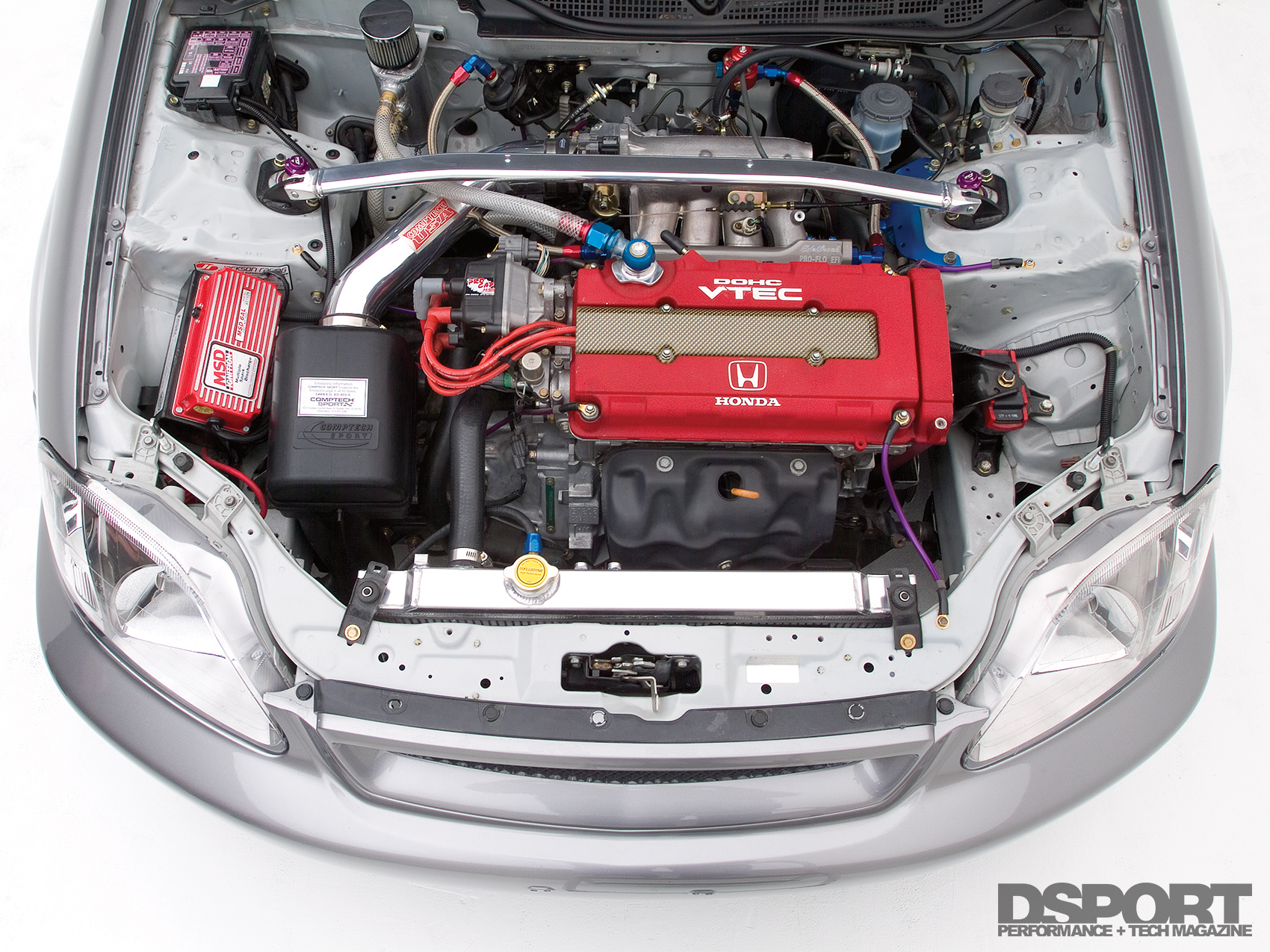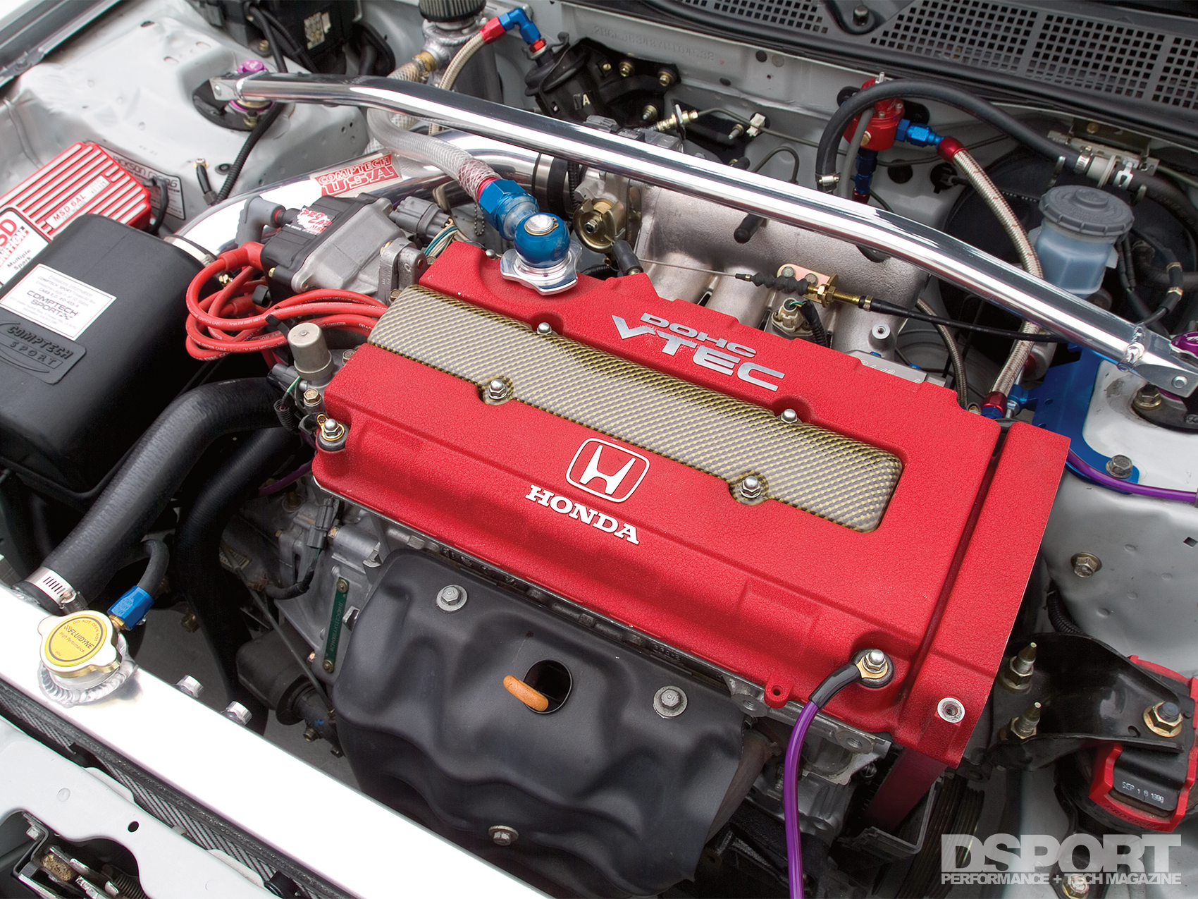 Fuel supply came in the form of a Walbro 255 LPH in-tank fuel pump. The Walbro pump feeds a quartet of RC Engineering 310cc/min fuel injectors. The air/fuel mixture is ignited by NGK spark plugs assisted by an MSD Ignition 6AL ignition system. With Casey Horner behind the computer screen, tuning was accomplished with a Hondata S200 engine management system. Revving up to 9200 RPM, the Civic laid down a solid 210 horsepower to the wheels and 158 Lb/Ft of torque as recorded on a Dynojet 248 dynamometer.