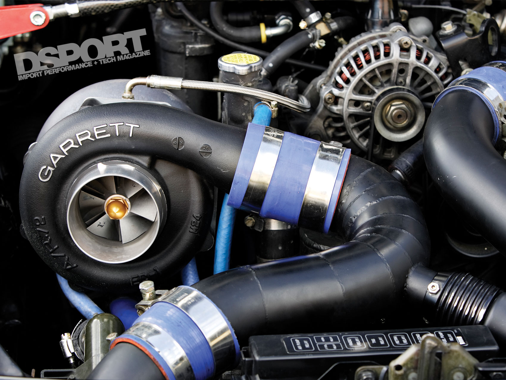 Revs Rotary fabricated a custom exhaust manifold to channel exhaust gases into the turbine housing of the Garrett GT4502R turbocharger. A custom 4-inch stainless down pipe and exhaust with dual N1 canisters direct spent gases to the atmosphere. From the compressor, custom intercooler piping forces the intake air charge through a 100mm thick intercooler core that sits front and center behind the front bumper cover. From the intercooler, the compressed air makes its way to a port-matched throttle body and the Extrude Honed intake manifold.
