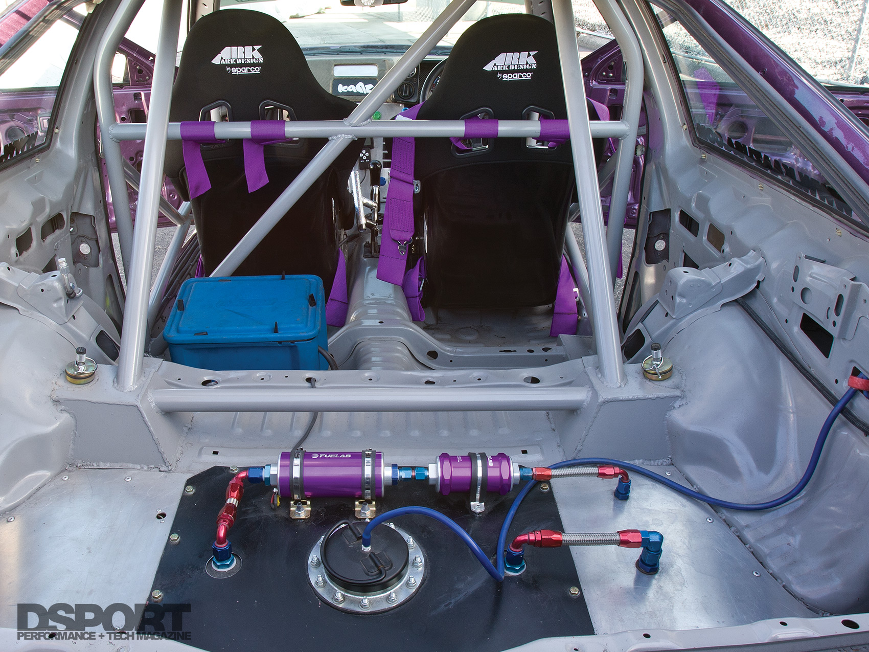The chassis was stripped down to remove every ounce of extraneous weight before a custom 8-point cage by Amerikajin Fabrication reinforced the frame and created a protective barrier for driver Yasu Kondo. The chassis was also converted to right-hand drive to suit Kondo’s preference. A complete DMAX wide-body aero kit, vented hood and taillights enhanced the exterior appearance, as a FRP hatch lid with a Lexan window helped to further lighten up the shell. The body then went to K&W Autobody to receive a few coats of custom “Barney” metallic purple pigment.
