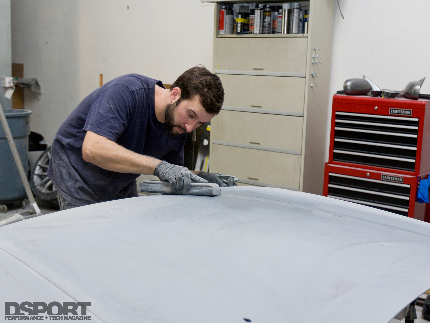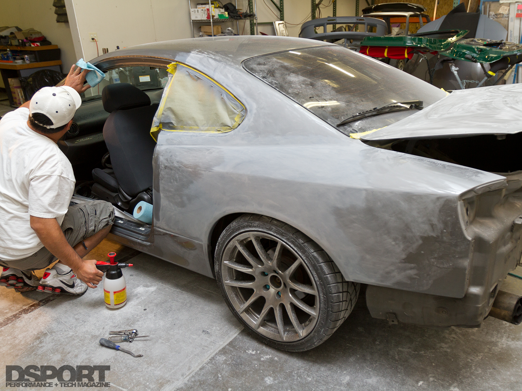 The art and science of painting a car is labor intensive and tedious. The Silvia was cleaned then treated with a wax and grease removing solvent. Next, the existing dents were repaired and smoothed. The repaired areas were then feathered with the current layer of paint before being spot primed. The body was then blocked with 320-grit sandpaper followed by a 600-grit wet sandpaper. A DA sander with a soft interface pad and 320-grit sandpaper expedited the preparation of other components undamaged in the Silvia’s previous accident. The 320-grit was followed by a 600-grit wet sand for optimal adhesion. Because of the color change, the Silvia’s jambs and door edges were also prepared for painting using 3M red scuff pads.