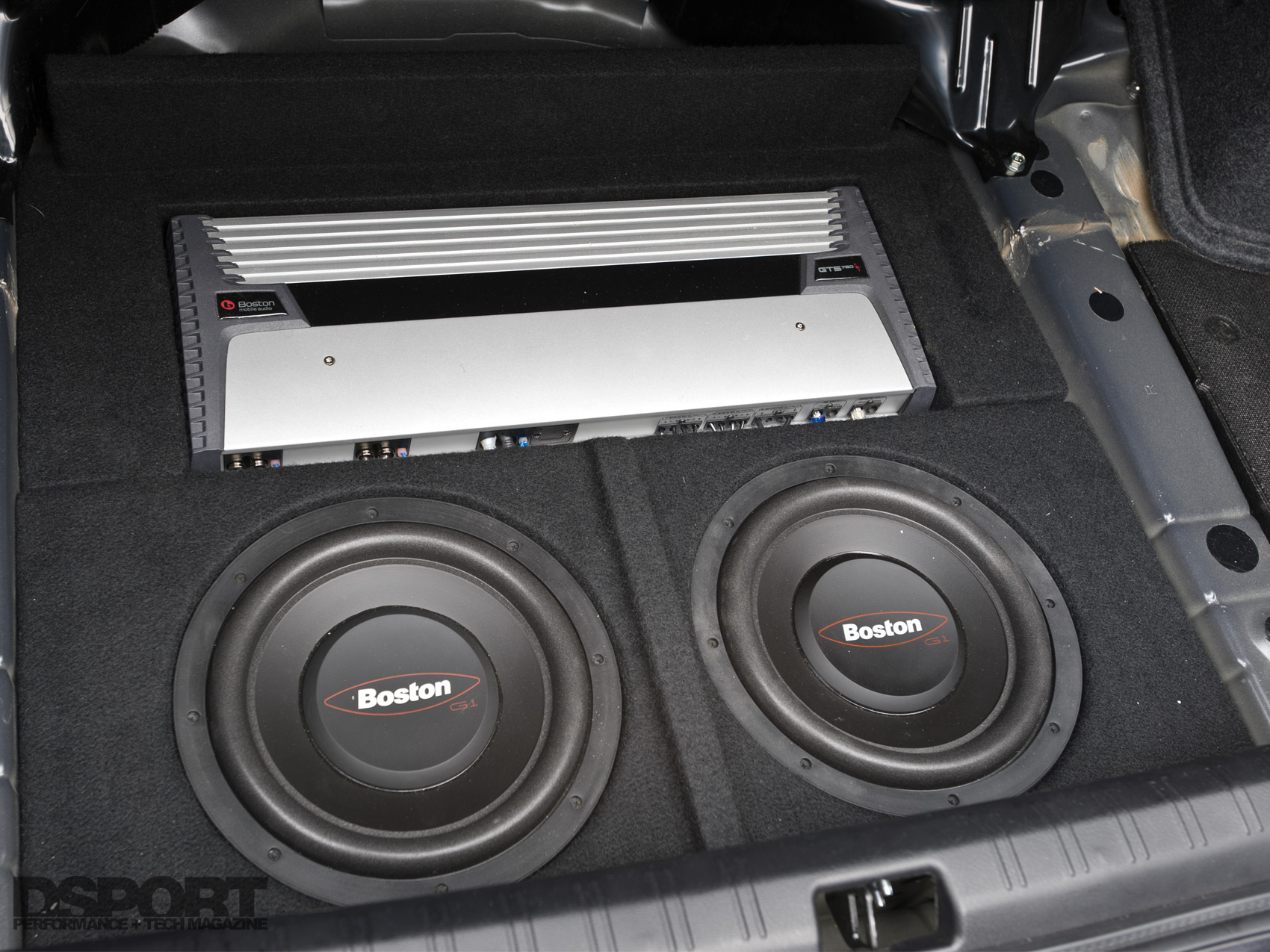 The Boston Acoustics subwoofers andamplifier are hidden from view in the STI’spare tire