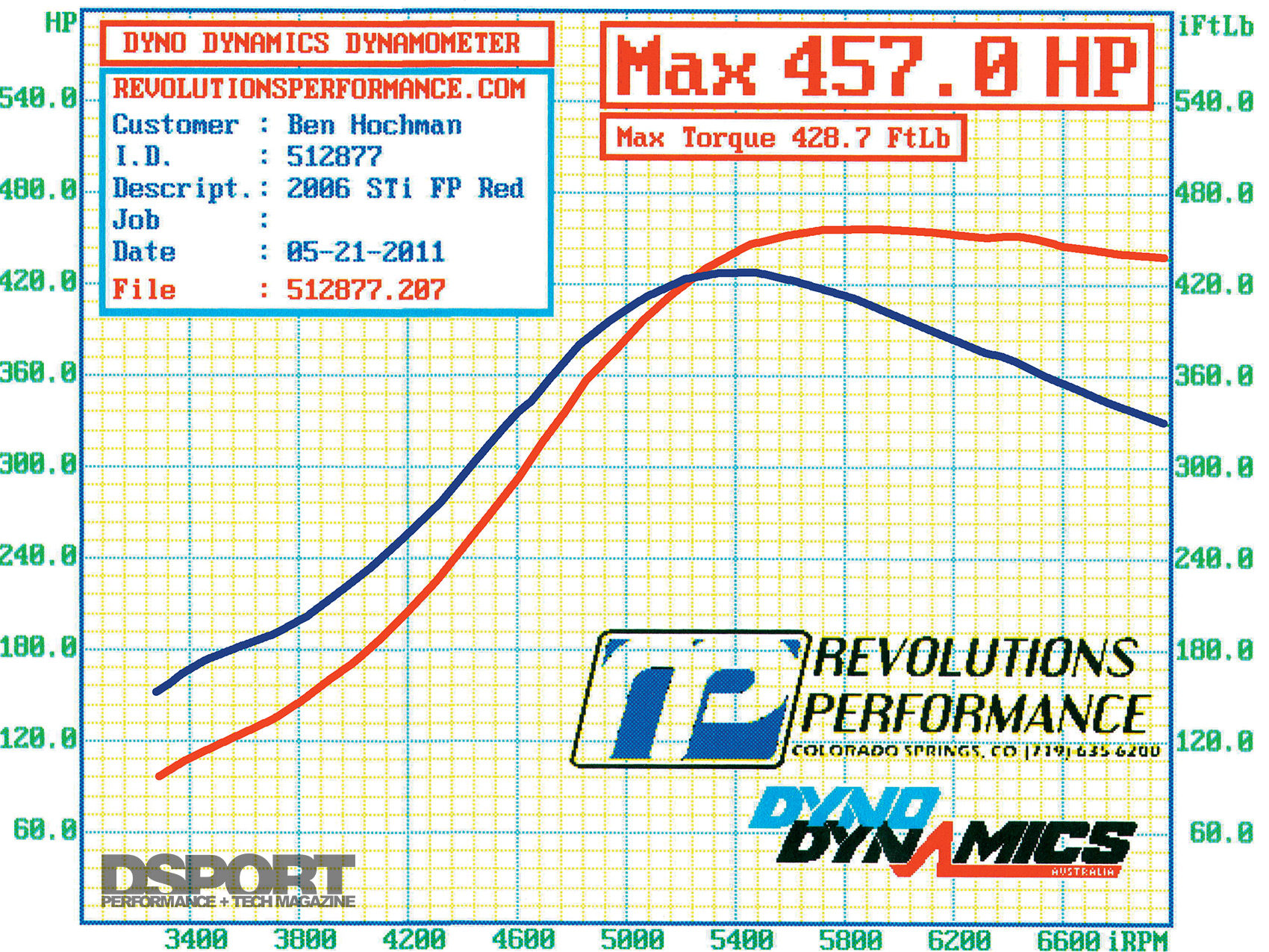 With the engine and chassis prepped, Servion Tuning refined the fuel and ignition tables of the AEM EMS for maximum power and drivability. On Revolutions Performance’s Dyno Dynamics all-wheel drive dynamometer, the STi spun the rollers to the tune of 470 horsepower and 428.7 lb-ft torque. Compared to the 220 WHP typically expected of stock EJ257s tested on that dyno in Colorado’s high-altitude environment, the current build represents an over 113-percent increase in power production.