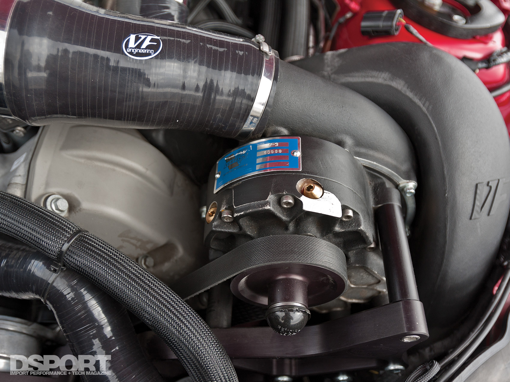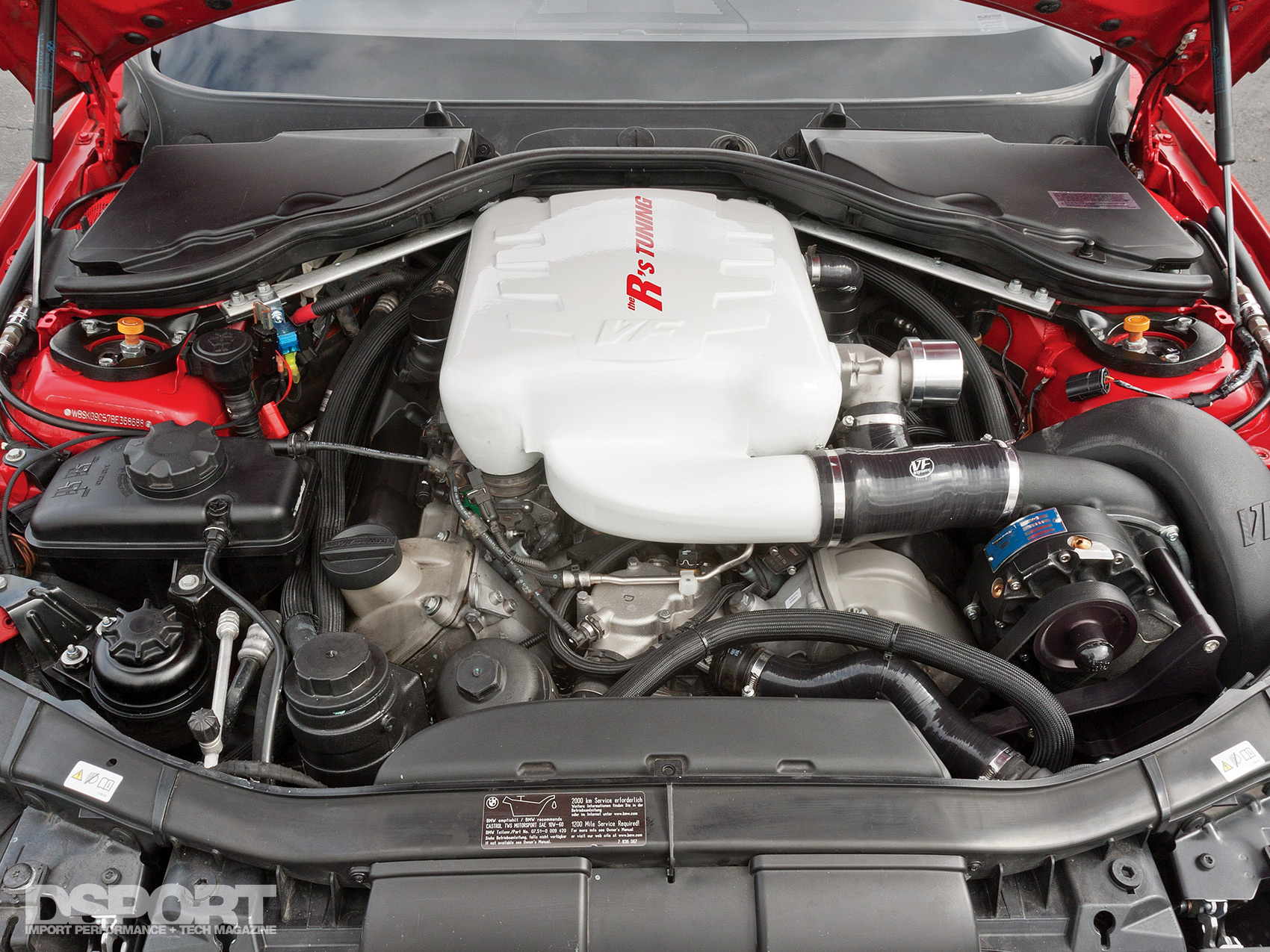 In stock form, the 350 (414 brake) horsepower S65 V8 that powers the M3 makes it a formidable performer from the factory. But the tuning spirit moved Ricky to seek a power adding solution that would make track outings more fun, leading him to forced induction by way of a VF Engineering VF650 supercharger kit to give his V8 a boost in power. Based on a centrifugal Vortech V3 supercharger, this kit delivered a linear power curve that was less complex, easier to manage and less violent than a twin turbocharged set up would have been. Complete with a new intake plenum to feed the eight individual throttle bodies, the bolt-on kit included all the necessary components including a solid mounting plate to position the supercharger on the engine. To maintain some semblance of street compliance, the factory catalytic converters remained in place while an R’s Tuning custom GT1 exhaust suppresses some of the V8’s growl.
