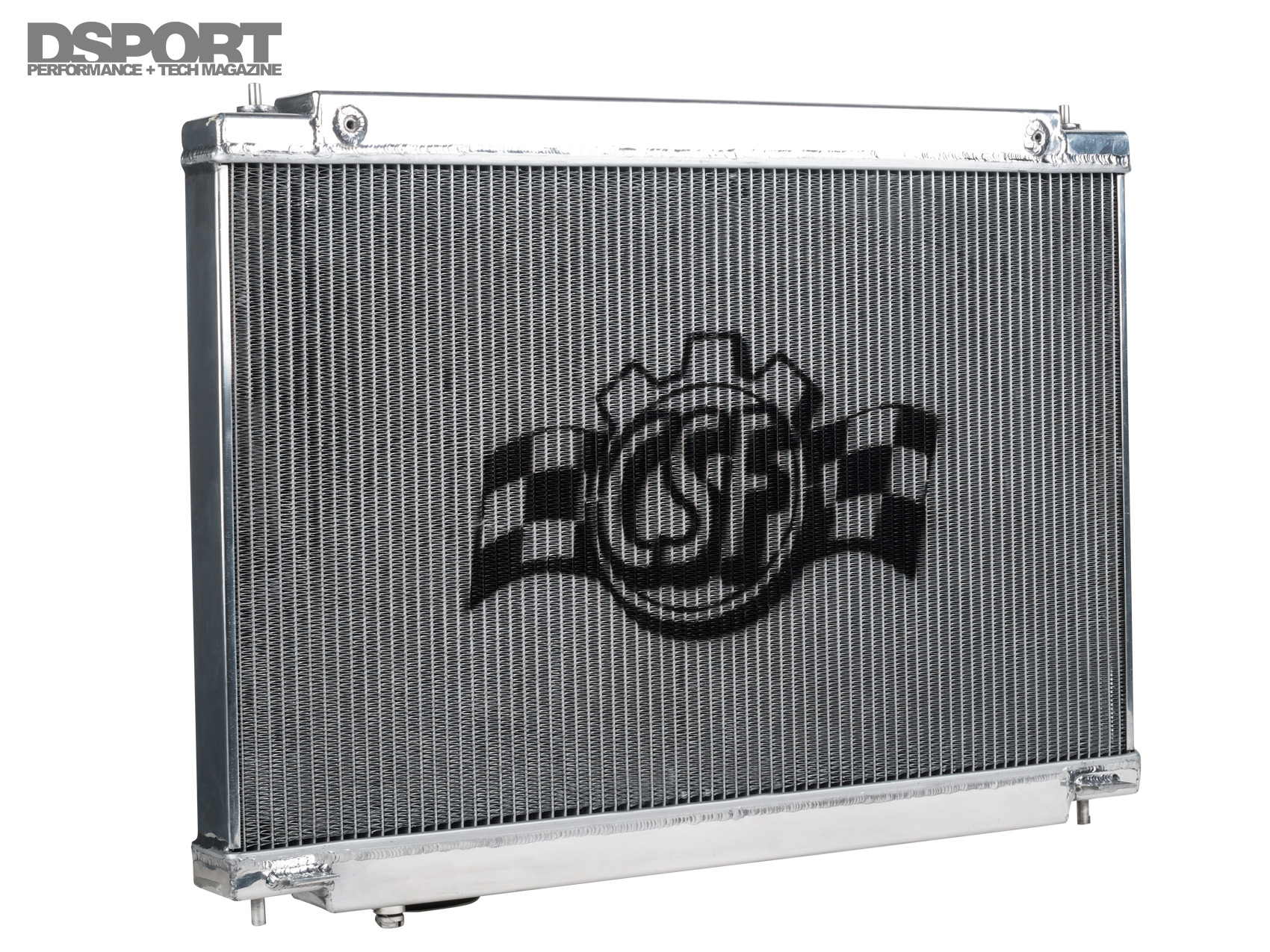 The CSF Race all-aluminum radiator utilizes a twin-core design and uses all factory mounting points and hardware.