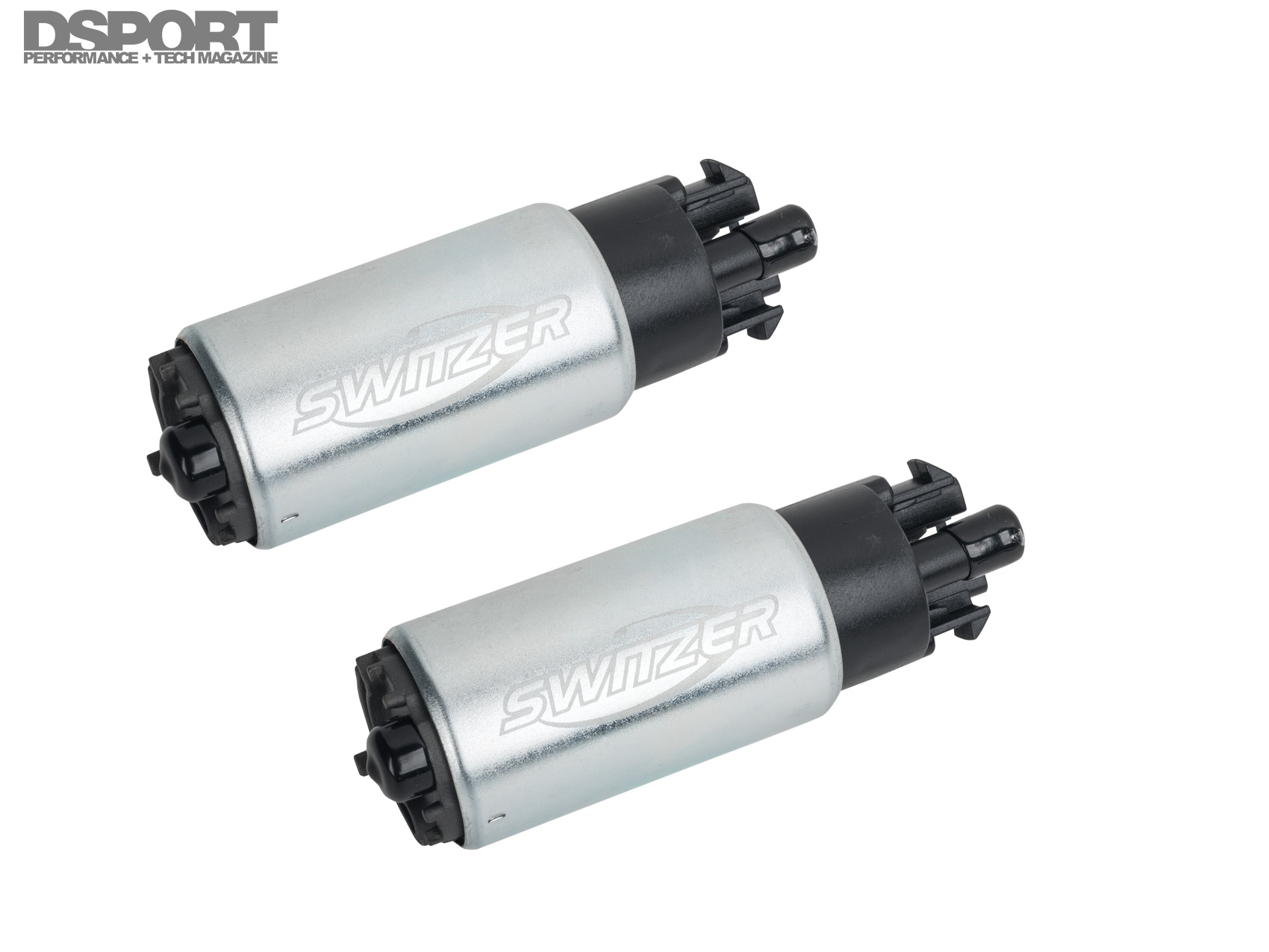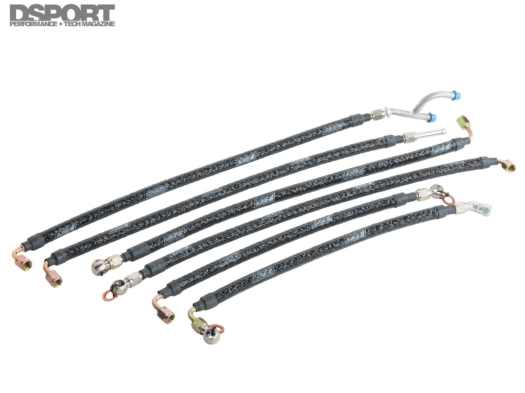 (L)The P800 kit includes new coolant and oil lines for the turbochargers, sheathed in DEI fi re sleeve for insulation and protection from heat and abrasion.(M)Switzer includes high-flow fuel pumps and a set of 1,050 cc/min injectors. (R)The pumps are a drop-in affair, while the injectors come with pigtails to plug directly into the factory harness.