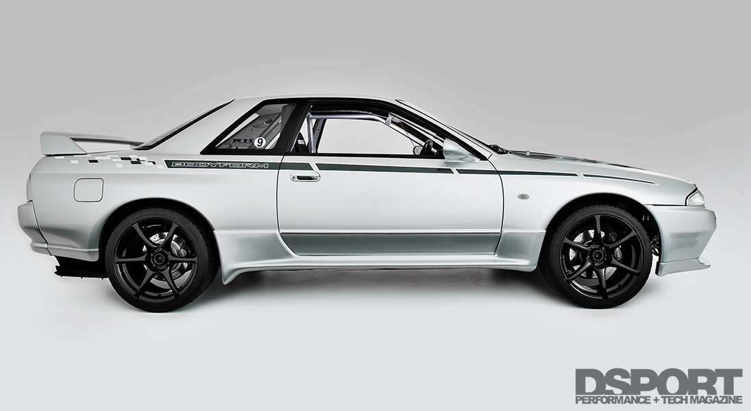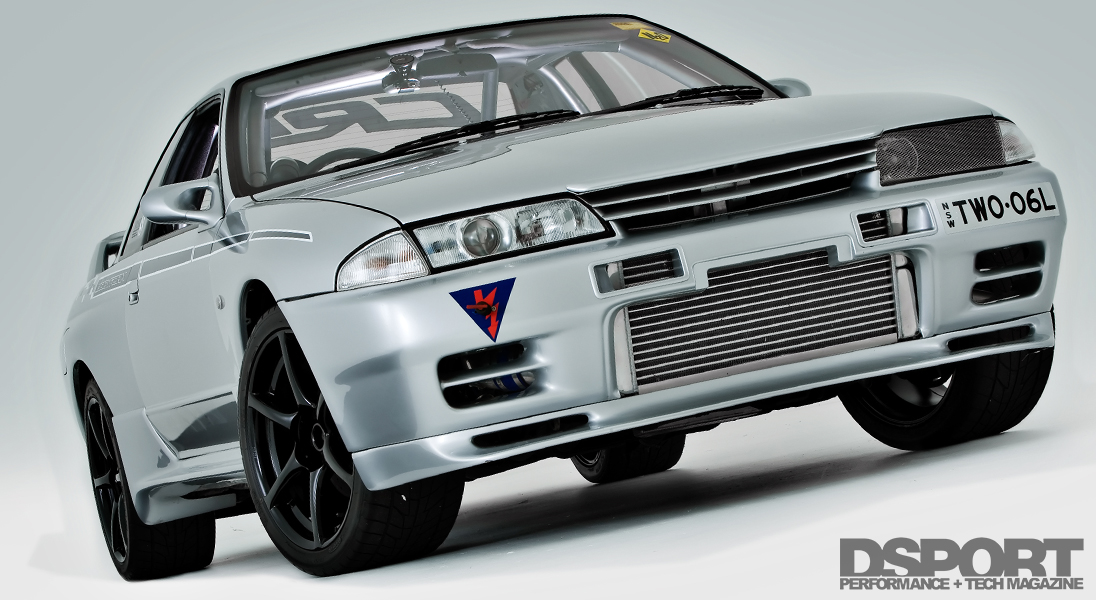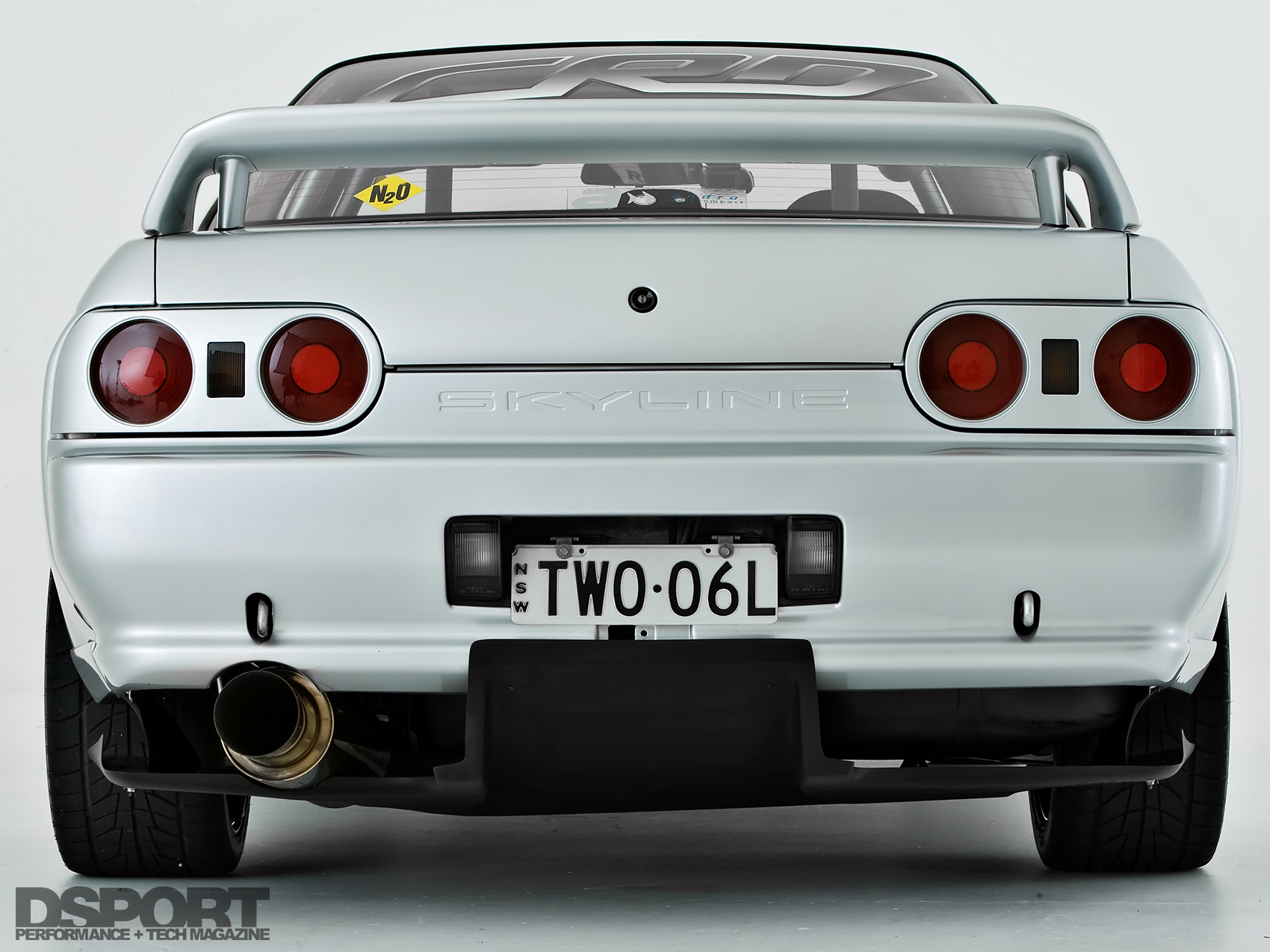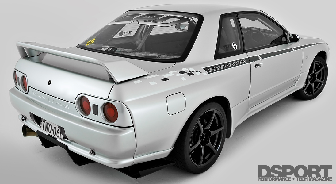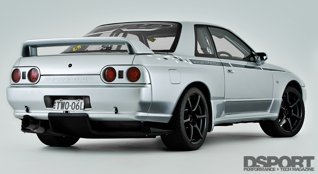 A set of powder-coated factory wheels from a R34 Skyline GT-R wrapped with Mickey Thompson drag radials translates the engine torque into the R32’s forward movement.