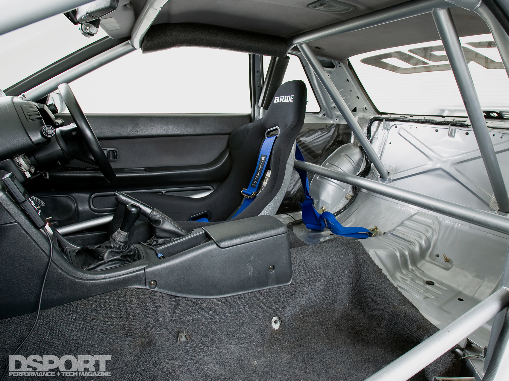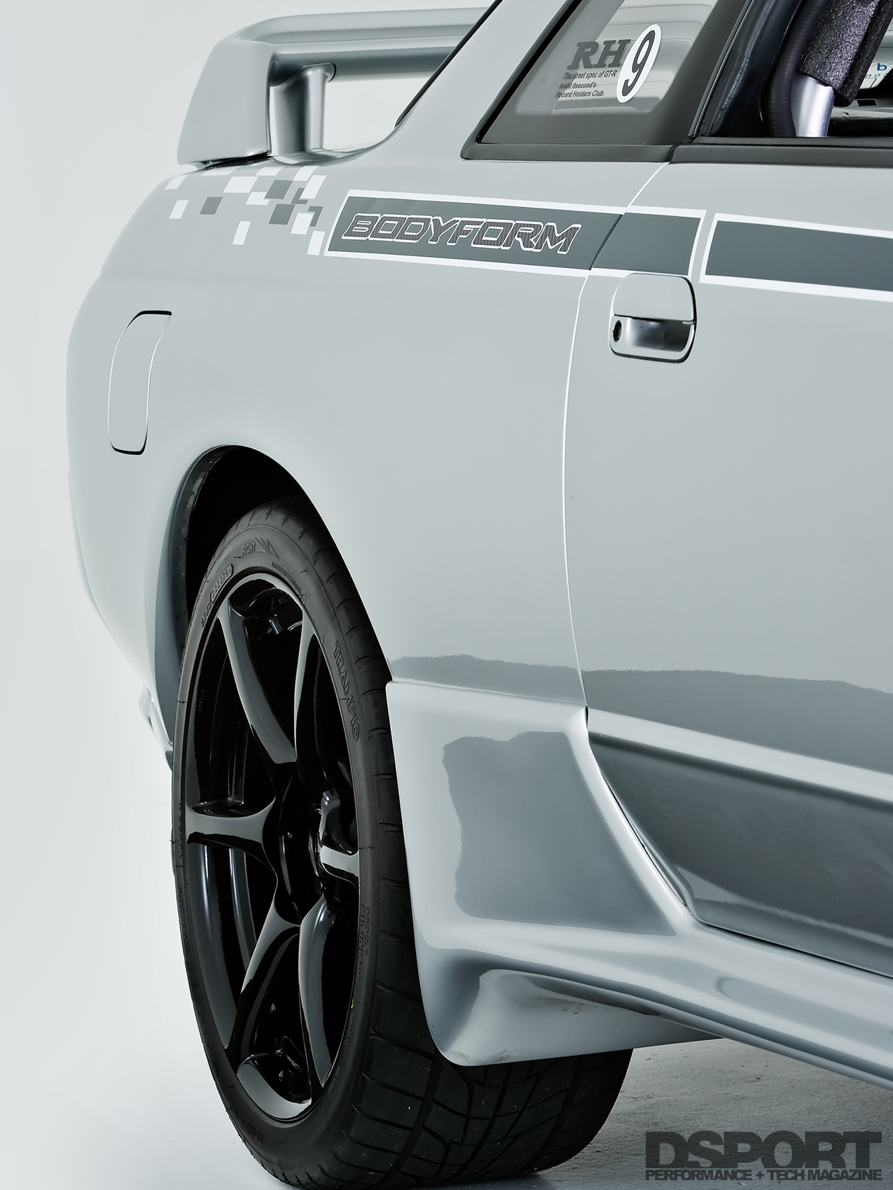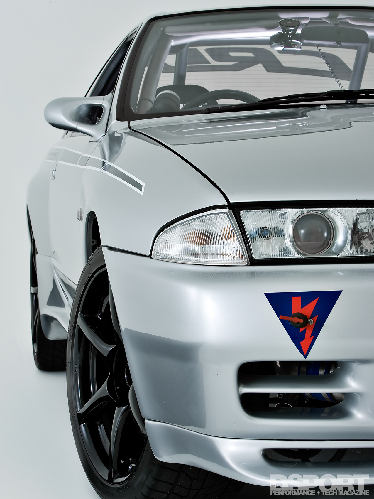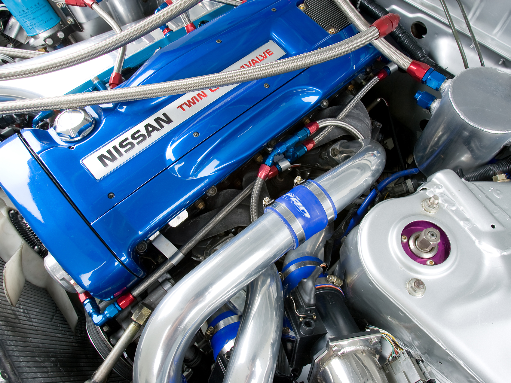 A set of powder-coated factory wheels from a R34 Skyline GT-R wrapped with Mickey Thompson drag radials translates the engine torque into the R32’s forward movement.
