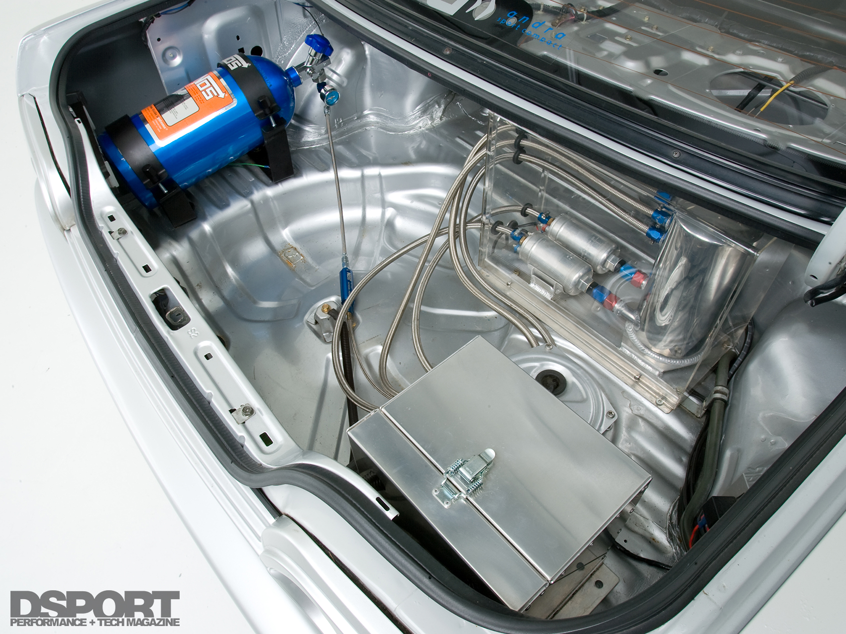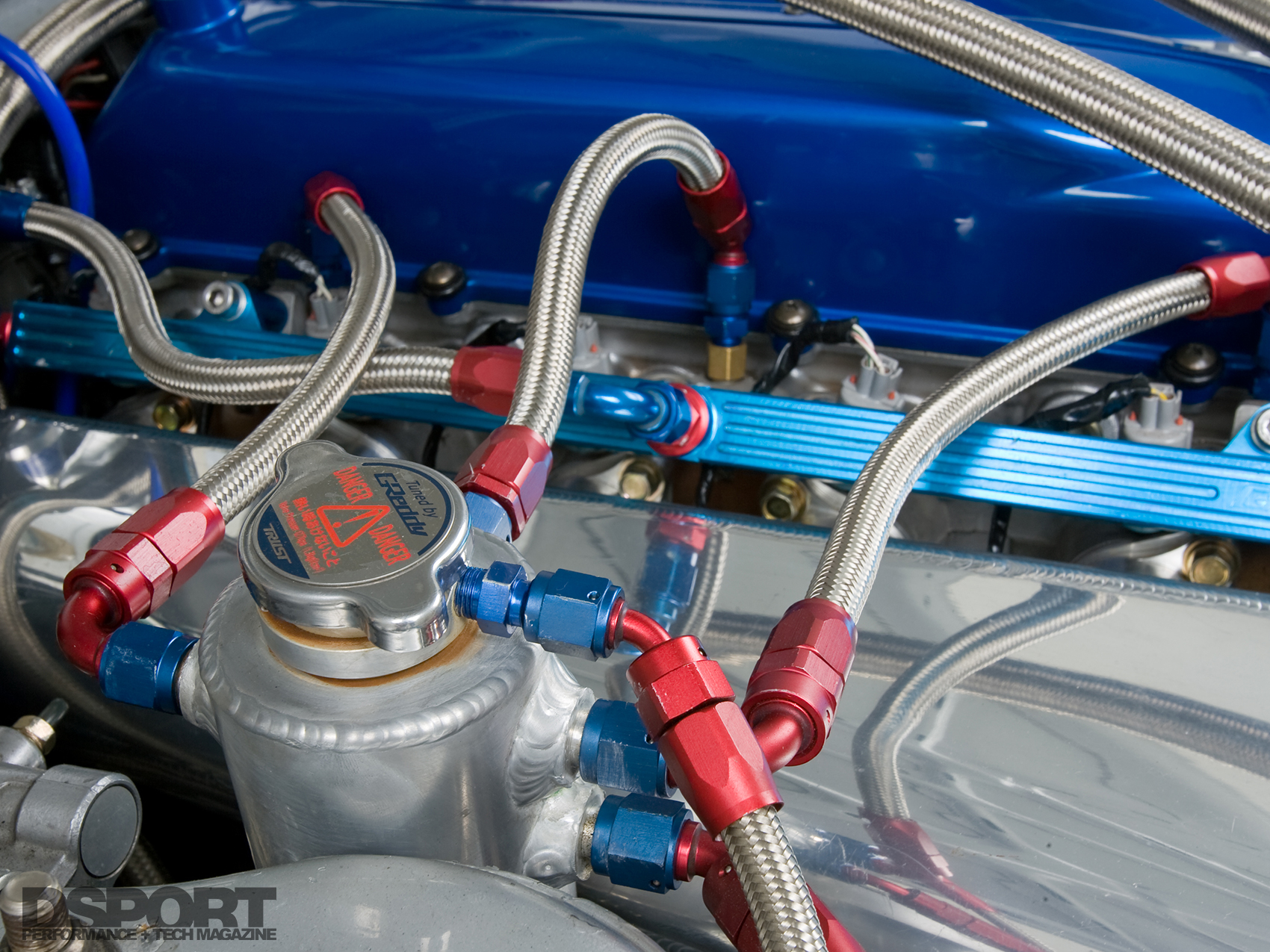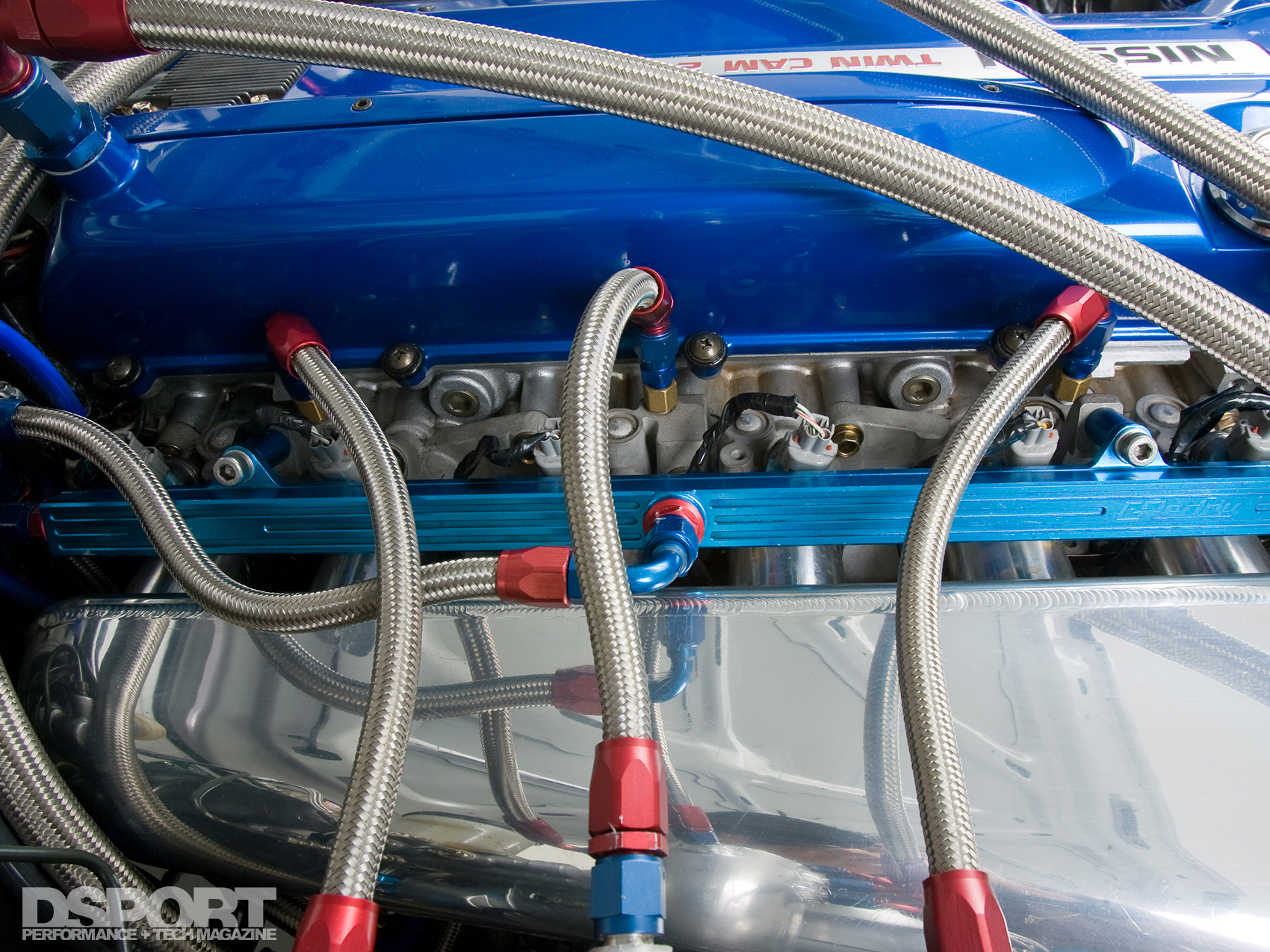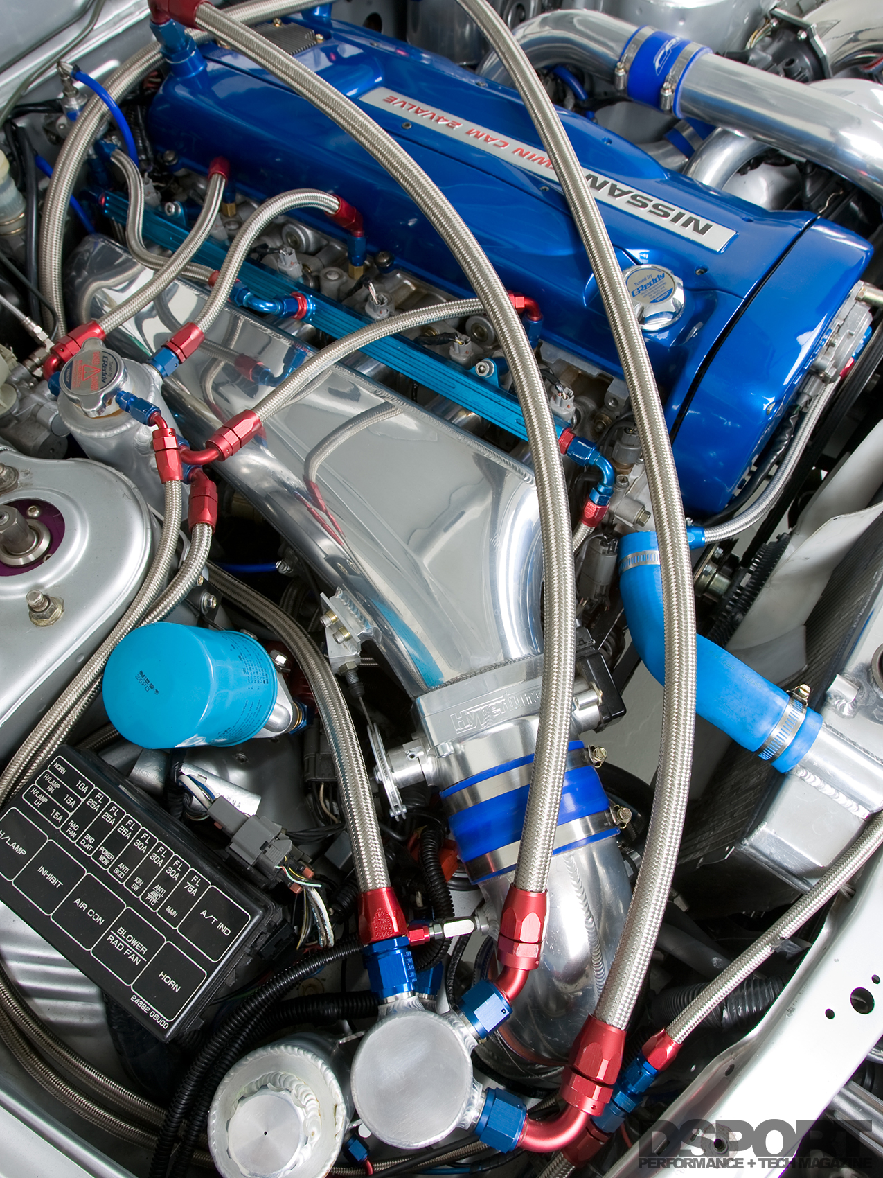 While Nissan engineers favored the responsiveness that individual throttle bodies delivered, aiming for peak power figures required optimizing the induction system for wide-open-throttle operation. Thus, the factory individual throttle bodies were scrapped in favor of an aluminum Hypertune manifold with a monstrous 102mm throttle body. The enlarged plenum and straight runners of the manifold distribute the incoming air charge chilled by a GReddy 5-row intercooler to the intake ports. As the charge reaches the ports, a six- pack of Blitz 1,000 cc/min injectors spray atomized race fuel into air stream on the way to the combustion chambers.