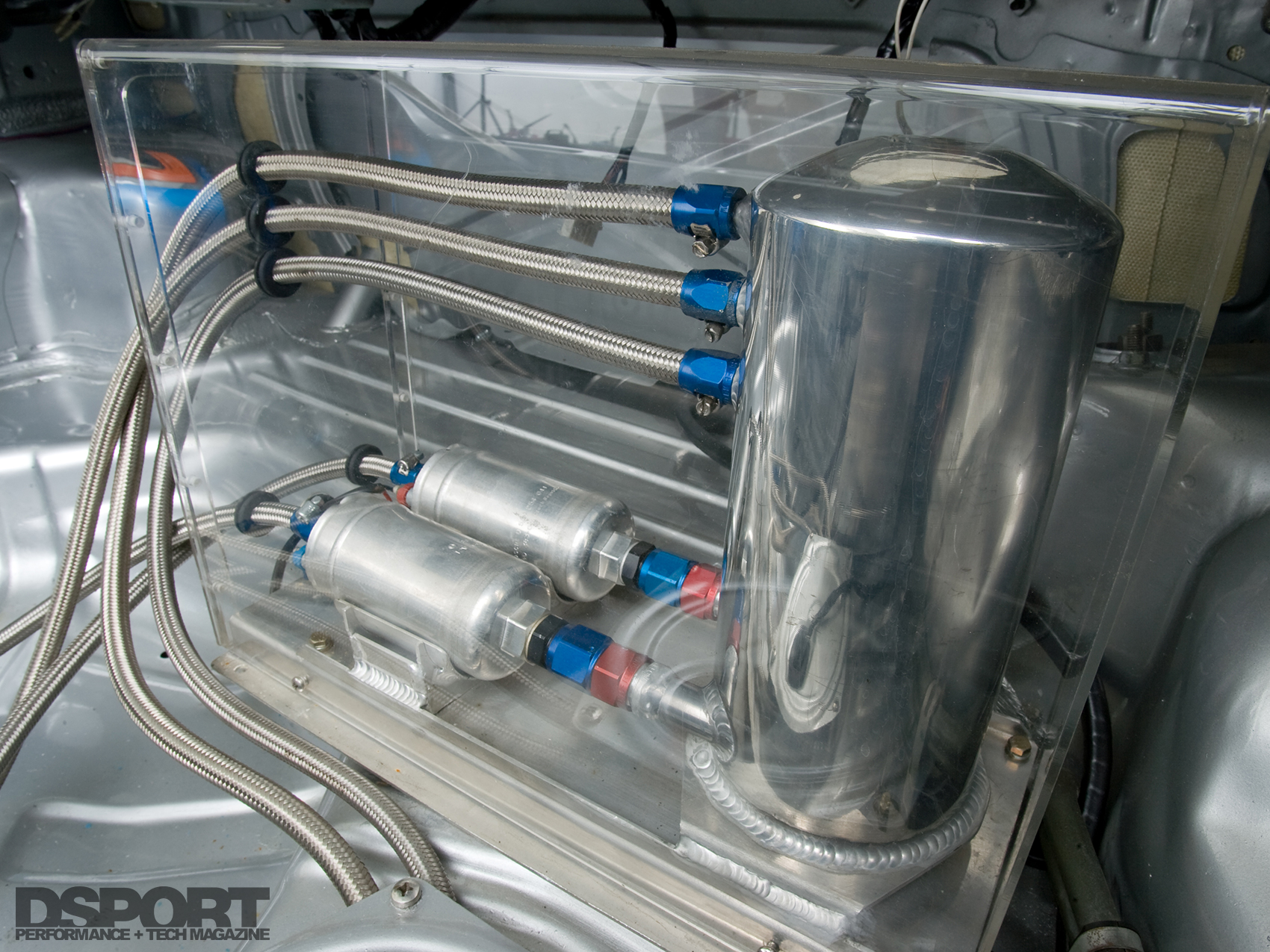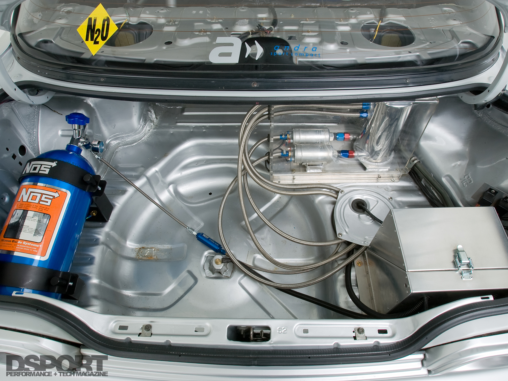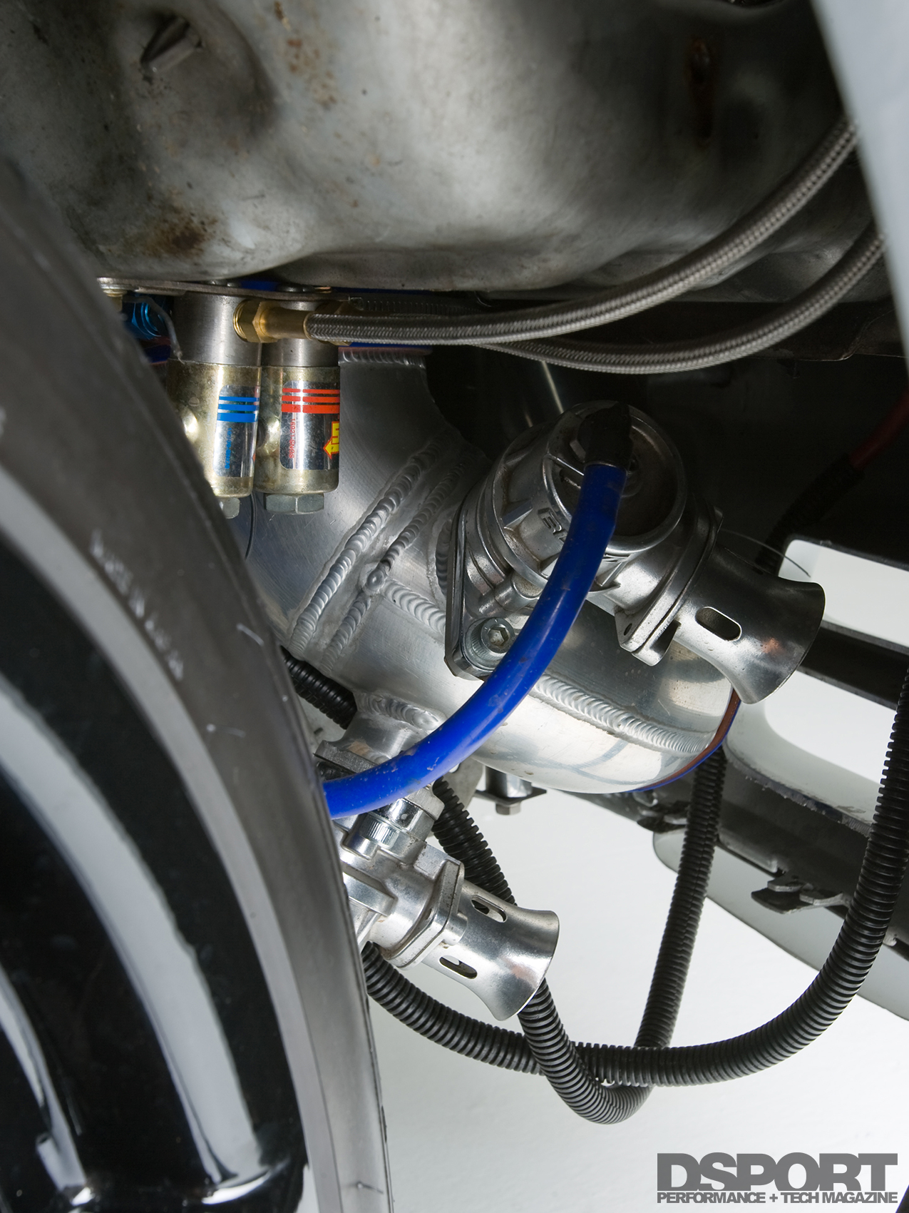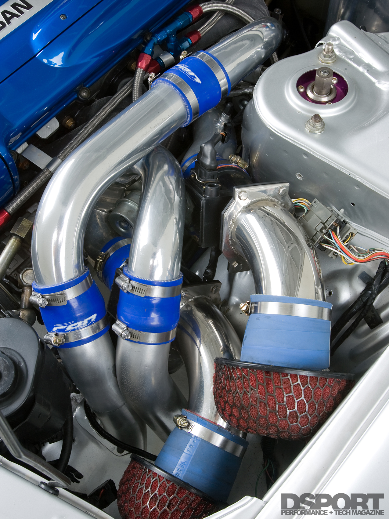 Diemar had already achieved mid-to-low 10-second passes with this setup and a pair of HKS GT2540 turbochargers hanging from the exhaust manifold so he knew that breaking into the 9-second club would require more. A pair of HKS GT-RS turbochargers mated to low-mount stainless-steel manifolds were used to supply more boost pressure and more efficiently satisfy the aspiration demands of the rebuilt RB26 engine. With an A’PEXi Power FC regulating the fuel and ignition timing, the built RB26 turned the dyno’s rollers to the tune of 673 horsepower at 25 psi boost pressure.