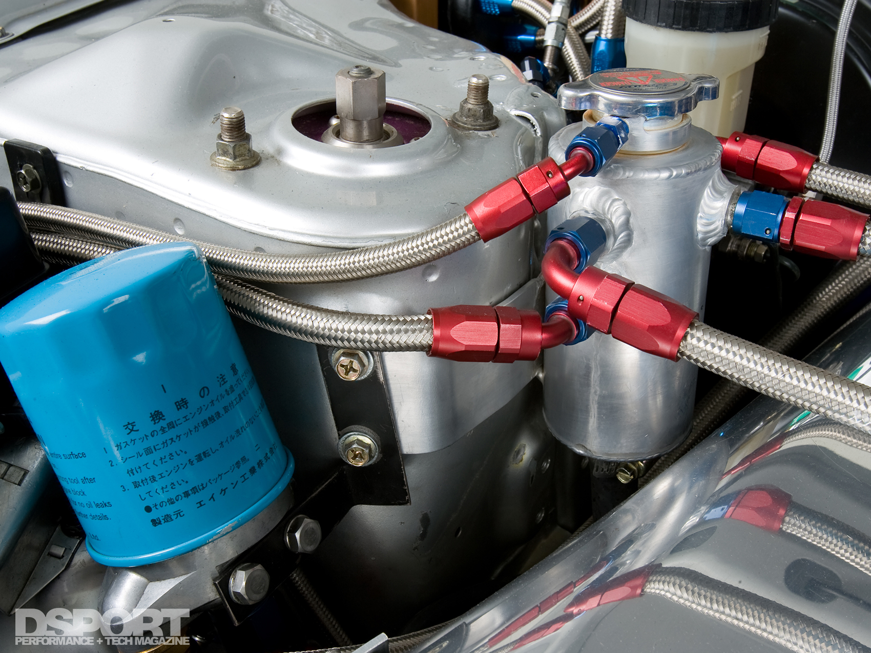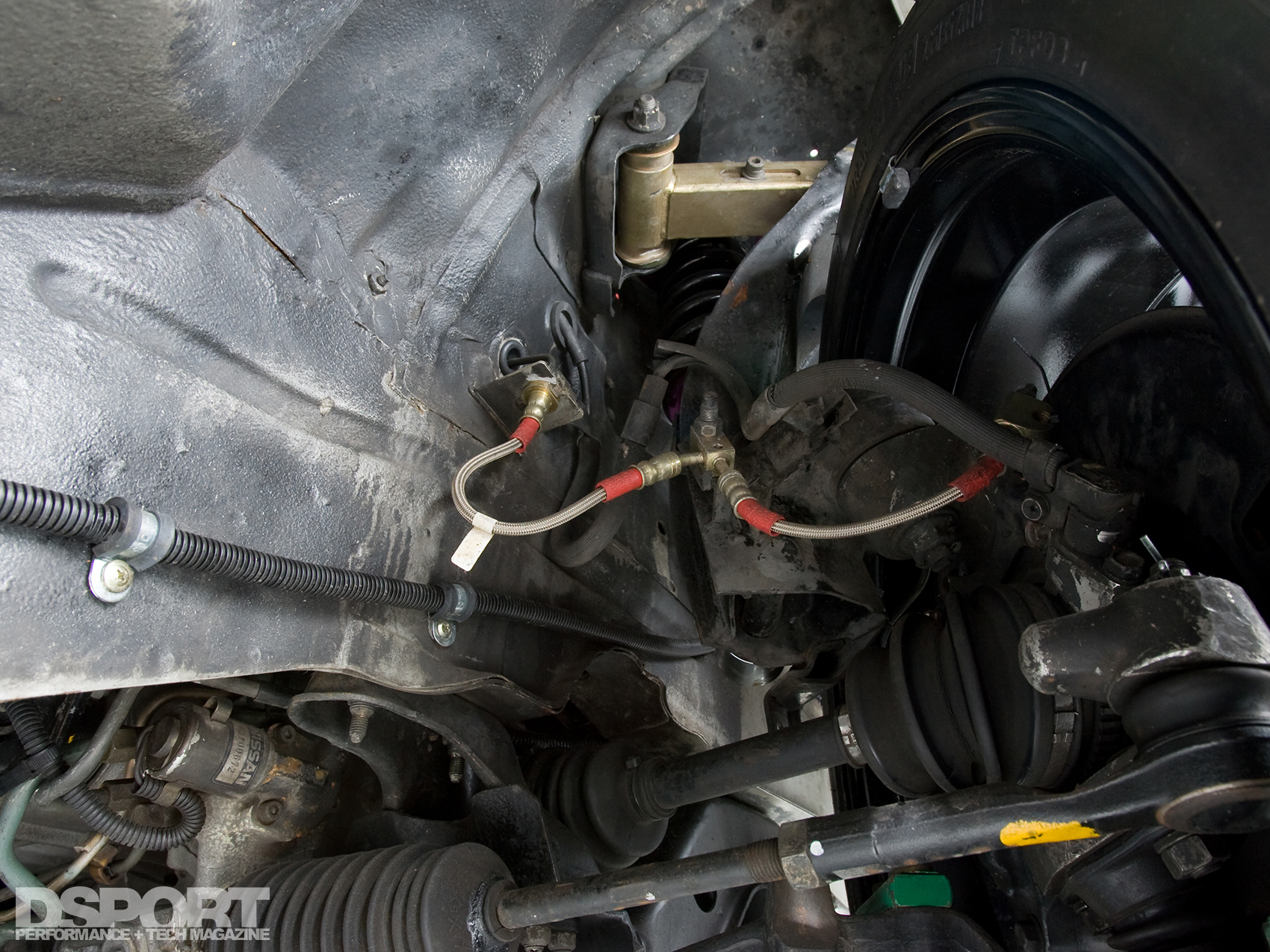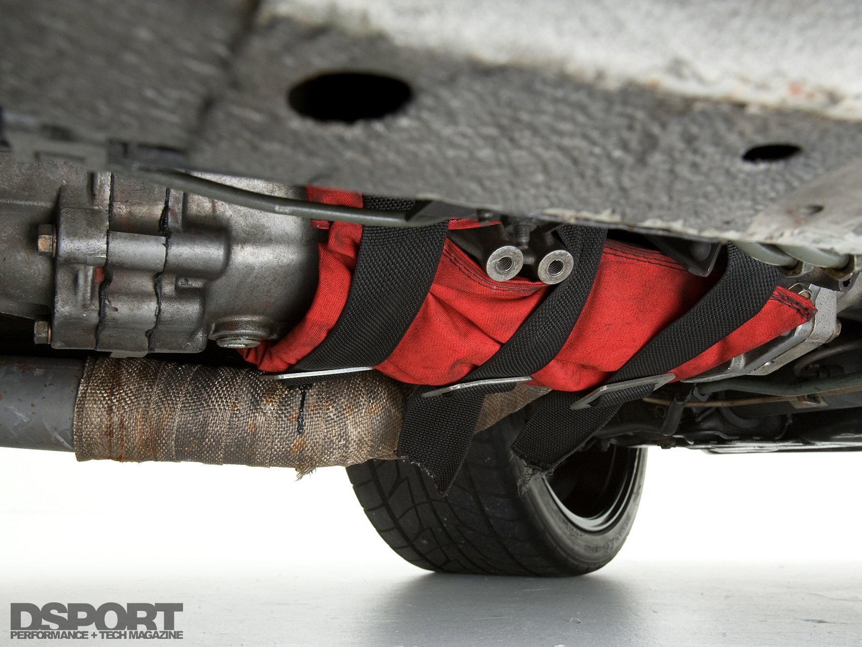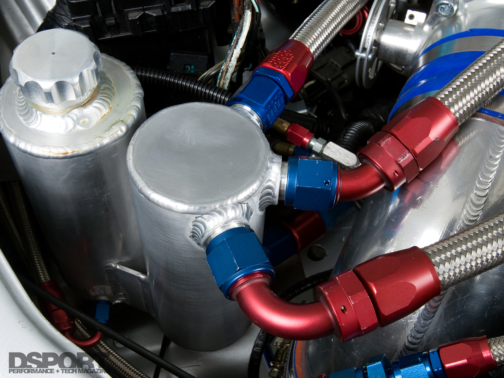 Diemar had already achieved mid-to-low 10-second passes with this setup and a pair of HKS GT2540 turbochargers hanging from the exhaust manifold so he knew that breaking into the 9-second club would require more. A pair of HKS GT-RS turbochargers mated to low-mount stainless-steel manifolds were used to supply more boost pressure and more efficiently satisfy the aspiration demands of the rebuilt RB26 engine. With an A’PEXi Power FC regulating the fuel and ignition timing, the built RB26 turned the dyno’s rollers to the tune of 673 horsepower at 25 psi boost pressure.