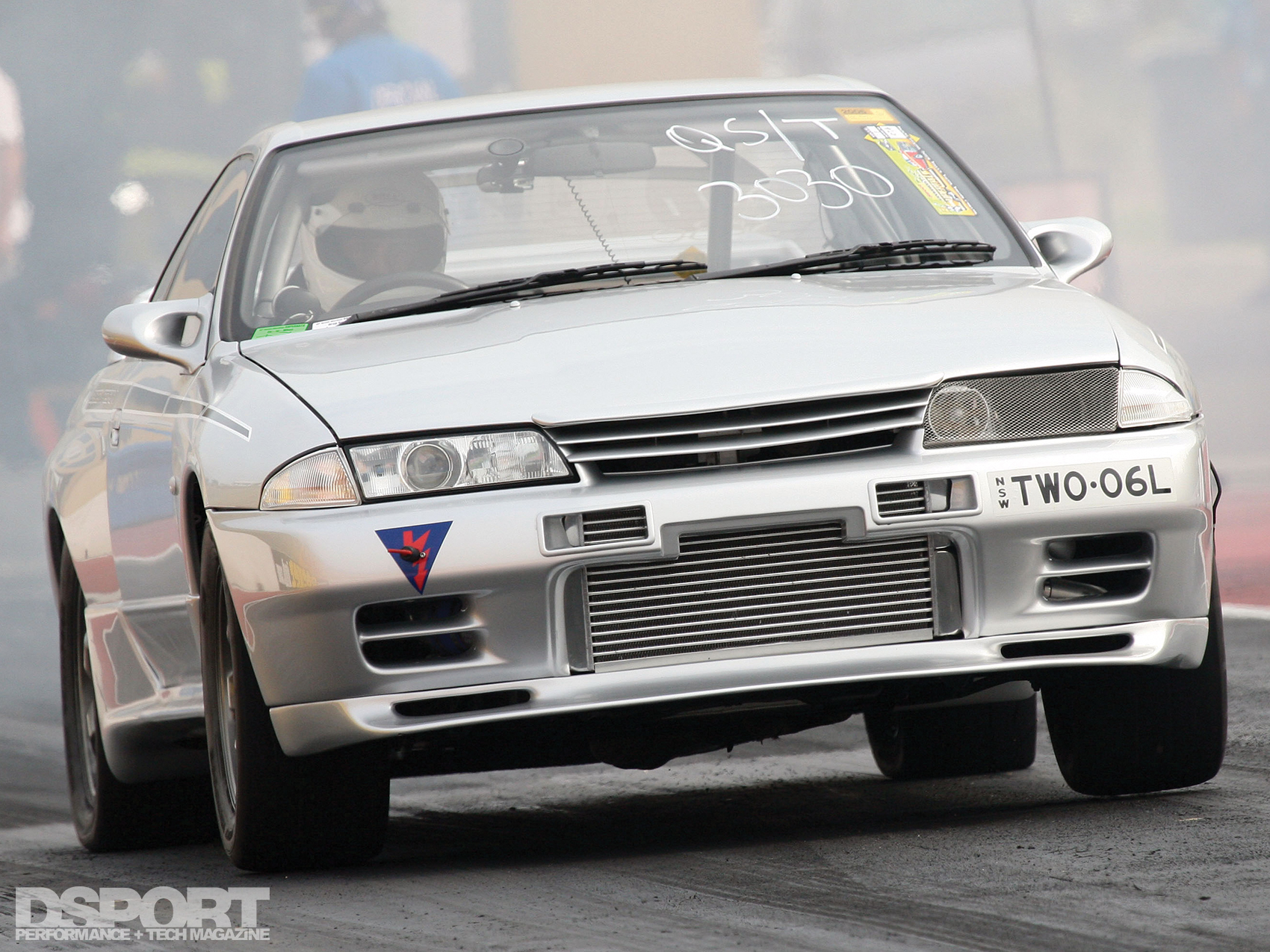 Since Diemar’s Skyline didn’t produce outrageous 4-digit horsepower, further modifications in the name of efficiency had to be uncovered and exploited to reach the single-digit goal. Losing traction or spinning tires would have been an incredible waste of resources and a preventable loss so the R32s suspension system was upgraded with a set of HKS coil-over dampers. These work in conjunction with a host of suspension links that ensure proper squat and launch geometry, ensuring the largest tire contact patch during each launch. Working on the other end of the power-to-weight ratio, Diemar removed as much weight out of the chassis as could be spared. The interior features the bare essentials for racing in the street class only, including a six-point cage that satisfies the Australian National Drag Racing Association’s requirements for safety and a FIA-certified BRIDE Zeta III race bucket coupled with Willans Harnesses. These modifications, in addition to Diemar’s incessant practice and long hours of seat time, have allowed him to achieve consistent 1.4-second 60-foot times at the strip and completed the final piece of the puzzle that was required for entry into the elusive Club RH9.