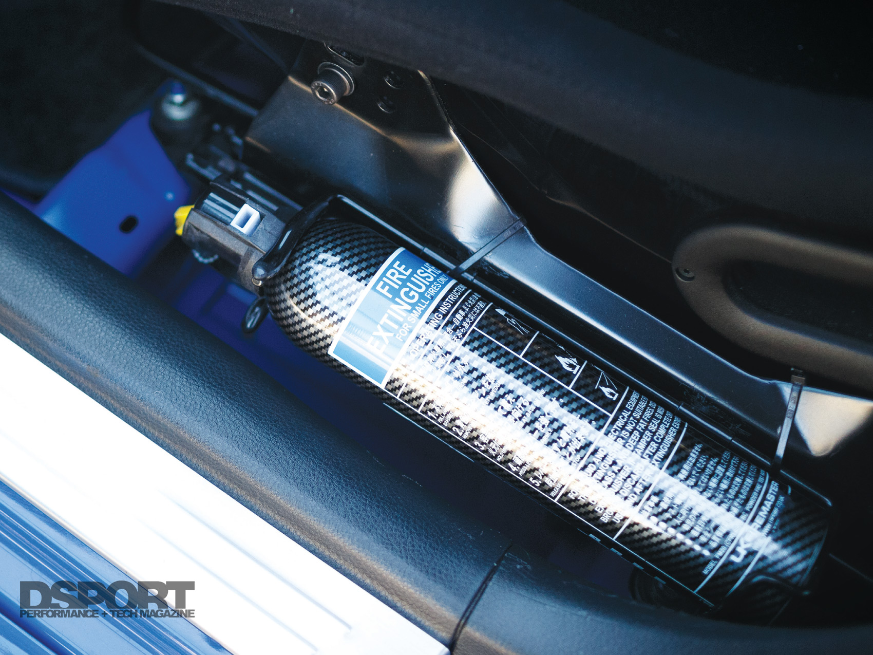 (L) A SARD fuel surge tank mounted between the shock towers ensures uninterrupted fuel delivery while helping to maintain vehicle balance. (M) Four-piston AP Racing brakes and two-piece\ slotted rotors work together to help cut speed. (R) While integrated fire suppression is ideal, an extinguisher within easy reach certainly helps