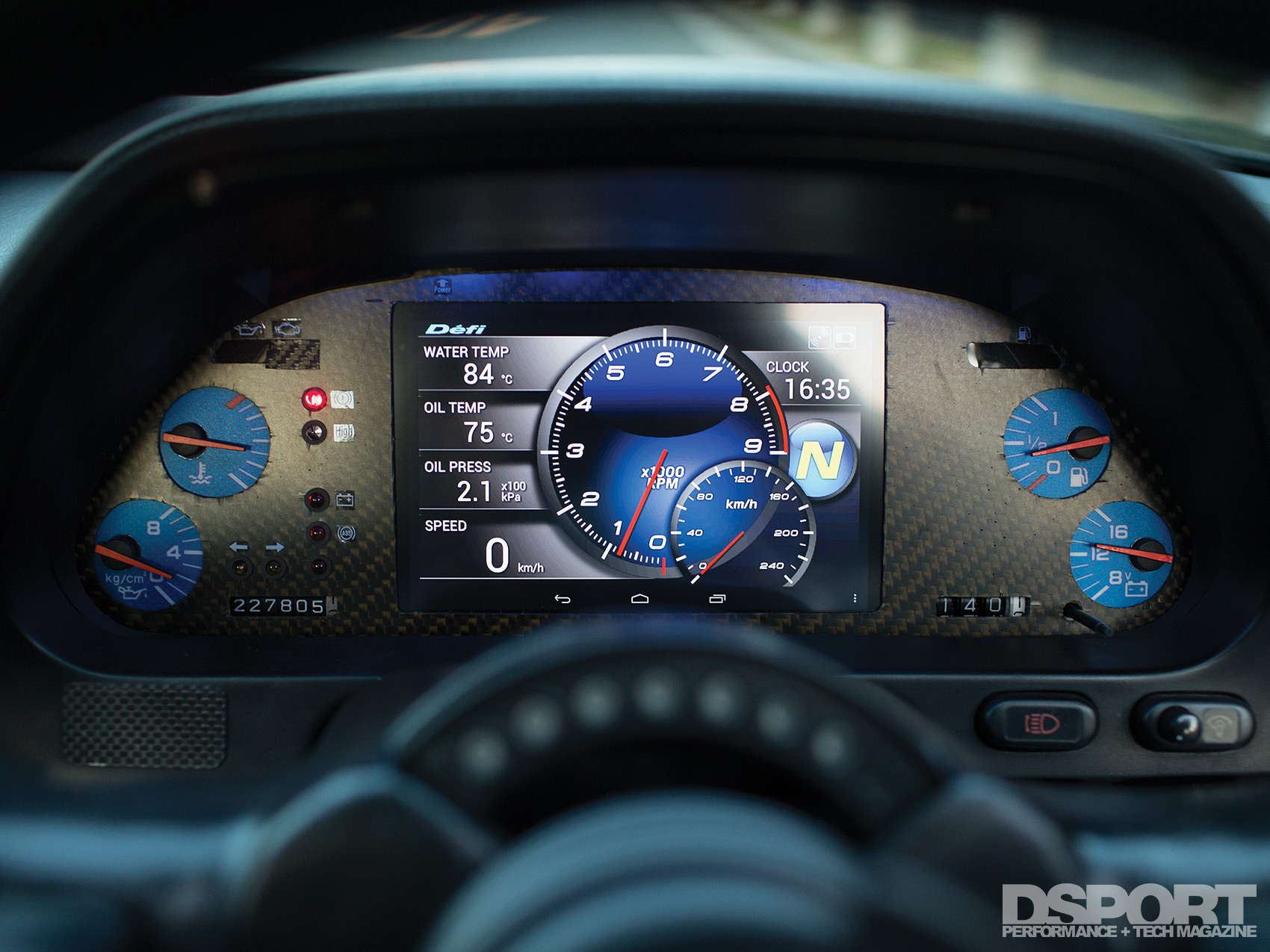 Between the daily commute and trips to the track, Mr. J started getting into the local show scene. He hated having the same parts as every other NSX, but differentiating himself from everyone else would prove a challenge, given the limited aftermarket resources that focused on the NSX. Thus, he had to resort to custom upgrades that would give his NA1 a unique presence. Doing much of the work himself, he made pieces from fiberglass and dry carbon fiber, and reupholstered some of the interior pieces with leather. He takes great pride in the custom gauge cluster that he made. Based on an Android OS Nexus tablet, he cut a piece of carbon fiber to fit in place of the factory gauge cluster while positioning the tablet in the process. He wired in the touch screen device along with the speedometer, odometer, essential alert lights and analog gauges. He programmed the tablet to serve as a multi-function display that also provides internet connectivity.