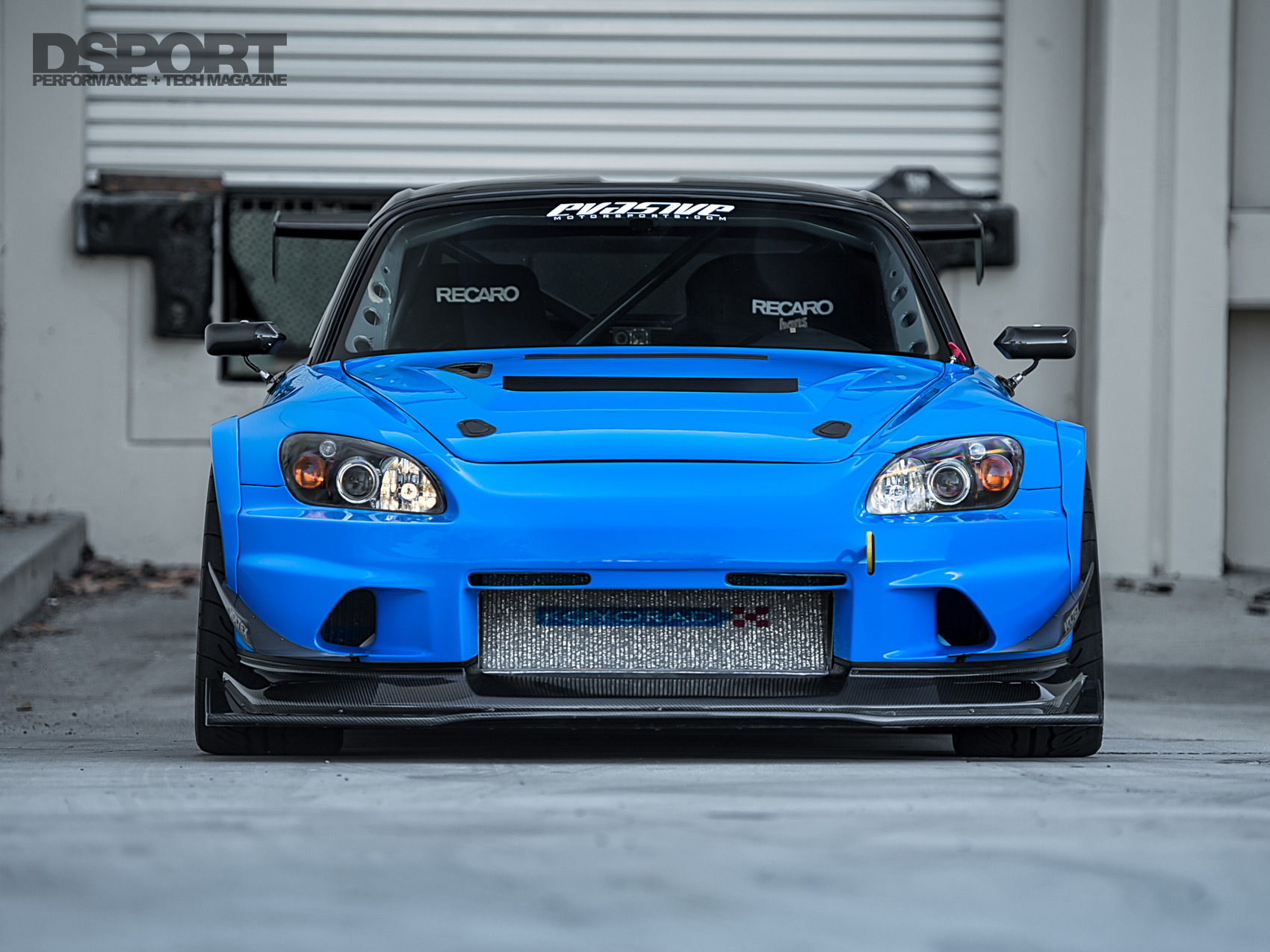 This AP2 Honda S2000 was delivered to Evasive Motorsports in April 2015 with a practically blank check and instructions to build it to be a track star. Drawing on its extensive experience tuning the S2000, the team at Evasive drew up a plan to reach this objective. The F22C engine was plucked from its home as work began on the chassis. Fabrication started with a V-mounted intercooler and radiator for optimum cooling. The radiator core support was modified to accommodate an HKS intercooler and Koyo radiator, while custom ducting directs airflow through the intercooler and out through ports cut out of the hood. A protective barrier in the form of a custom cage was then welded into the cockpit, shrouding the occupants within tubular steel. To further stiffen the chassis, the fabrication team stitch welded the shock towers. At the rear, the trunk floor was cut out before being fitted with custom chassis mounts for the Voltex Racing Type 7 carbon-fiber wing.