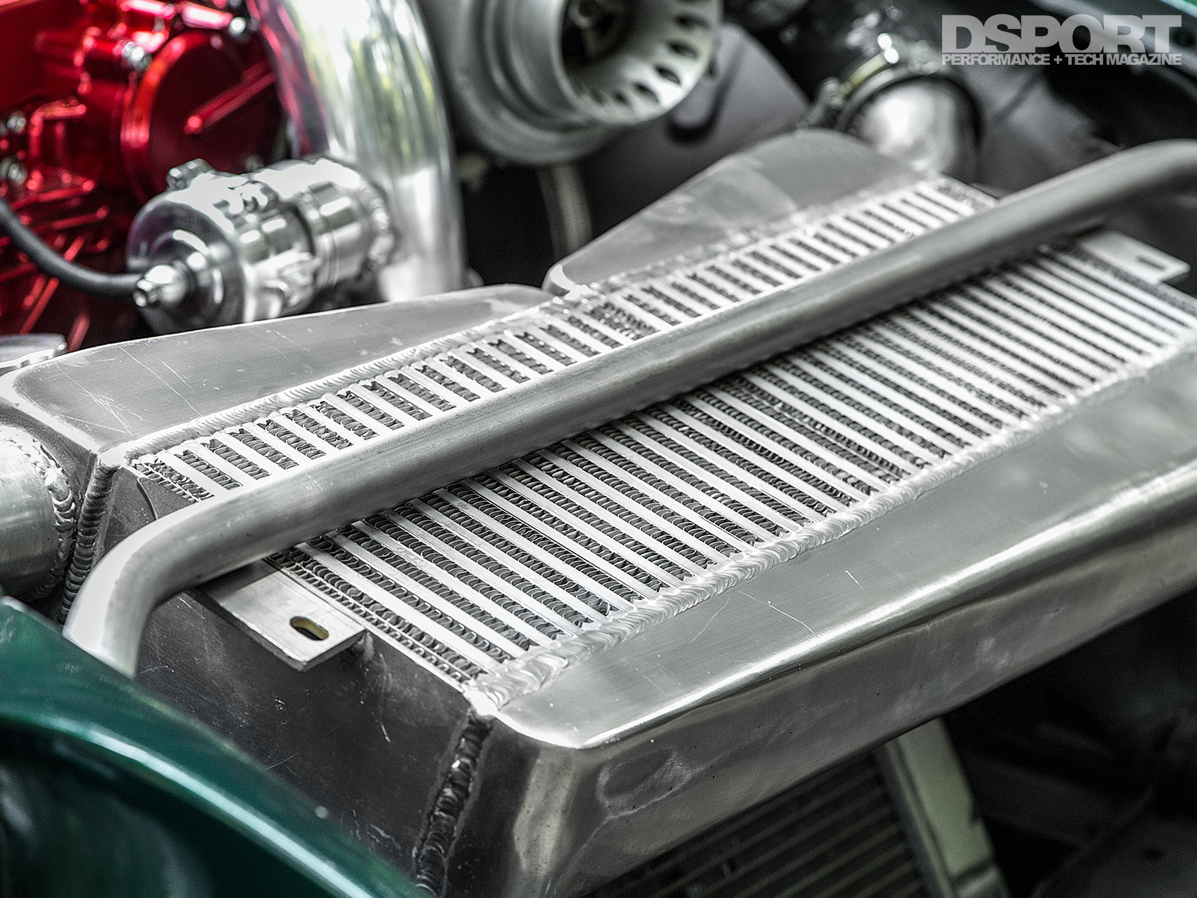Edgar enjoyed the reliability of his modernized S30, and soon after he came across a supercharger kit for the VQ. The boost was infectious and prompted him to start looking for a solution that would further set the S30 apart from the rest. He decided to twin-turbocharge the V6 engine. A pair of custom exhaust manifolds positioned a pair of CXRacing GT35 turbochargers just forward of the engine. Symmetrical exhaust tubes exit through each fender, simplifying the exhaust solution and keeping the weight down. Making use of the vast space still available in the engine bay, Edgar V-mounted the radiator and the dual inlet intercooler to permit direct airflow to both heat exchangers.