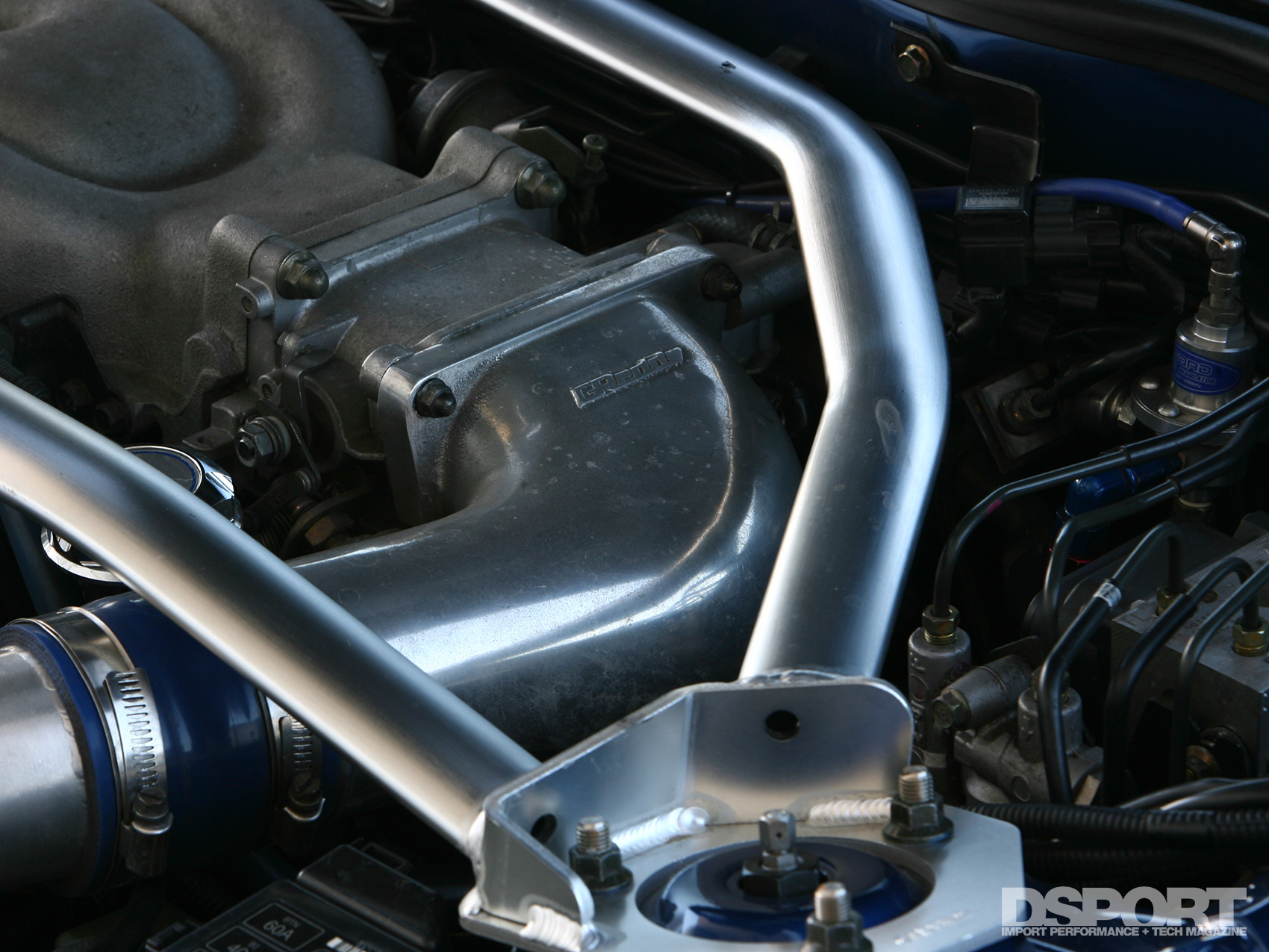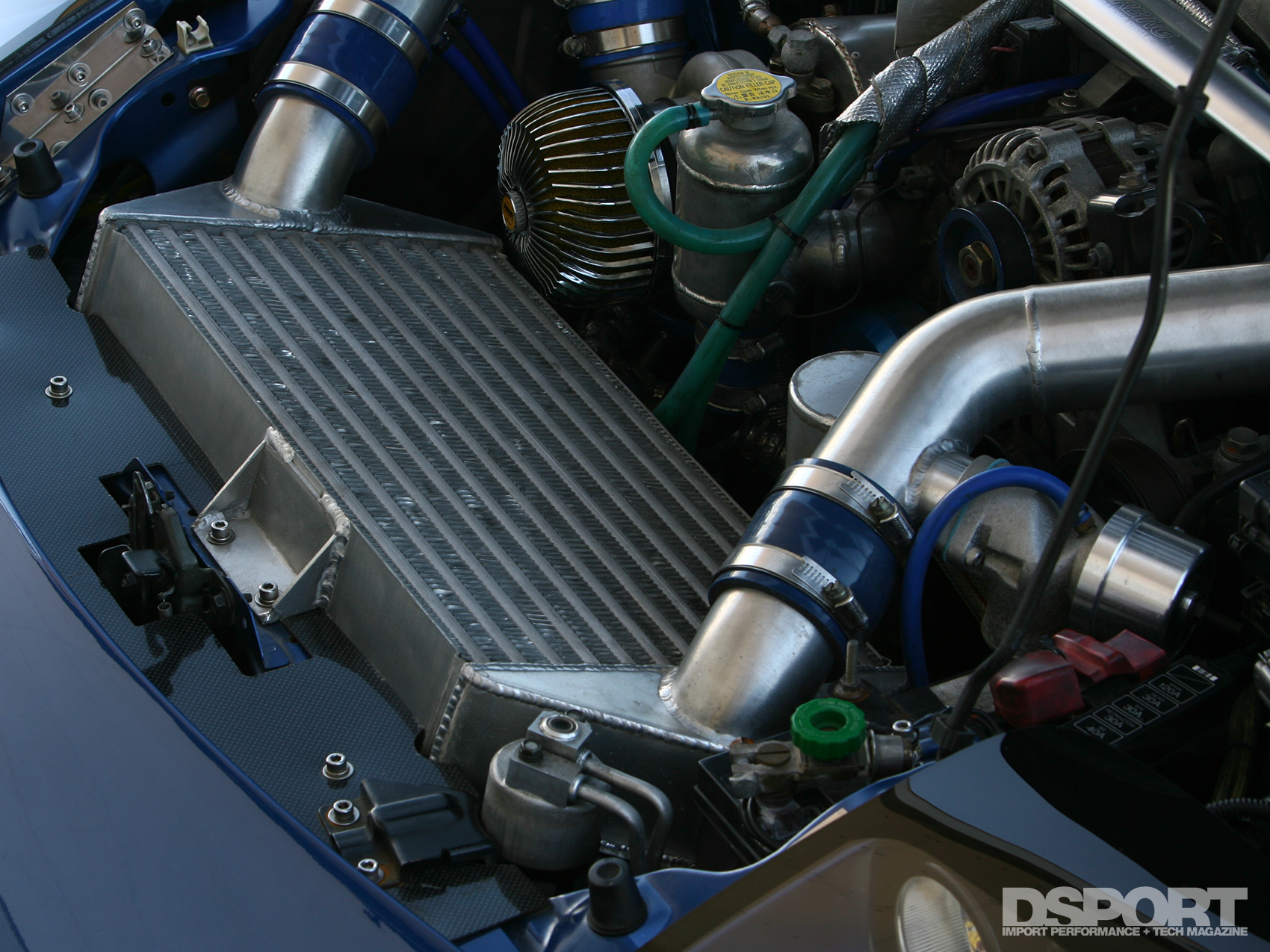 Once the feather-weight carbon bonnet is opened, a fully-rebuilt Zimax special 13B rotary engine is revealed. The single Trust TD06SH turbine, although not the biggest turbo to be used on a 13B, is a very good choice when shooting for good all-around power and drivability. To keep the under-bonnet temperatures in check, the turbine side of the TD06 has been covered with a custom heat shield. To prepare the engine for increased power levels, Zimax took the 13B apart and added a nice dose of side porting. The seals on the rotors were replaced with WPC items, which offer better performance and durability under heavy loads. Taking the compressed air charge from the compressor to the engine’s intake are custom-built intercooler pipes, which have been kept short, thanks to the horizontally mounted Zimax custom intercooler. Further helping response is the Trust throttle chamber.