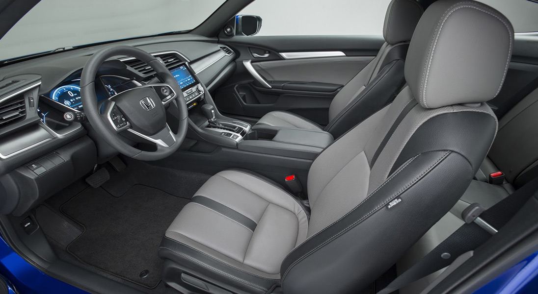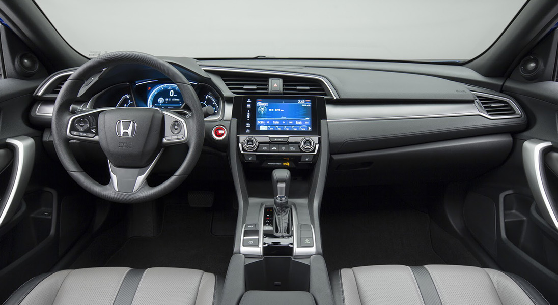 All new Civic Coupes, from the well-equipped LX to the new line-topping Touring, feature upgraded interiors and an expanded list of standard and available technologies and features. New standard equipment includes auto on/off headlights, LED daytime running lights, LED taillights, acoustic glass windshield, automatic climate control (dual-zone in upper trims), Electric Parking Brake with Brake Hold and Walk-Away auto door locks. New available features include Honda LED headlights, Remote engine start, heated front seats and side mirrors, rain-sensing wipers, full-color TFT center meter and seven-inch Display Audio touchscreen.