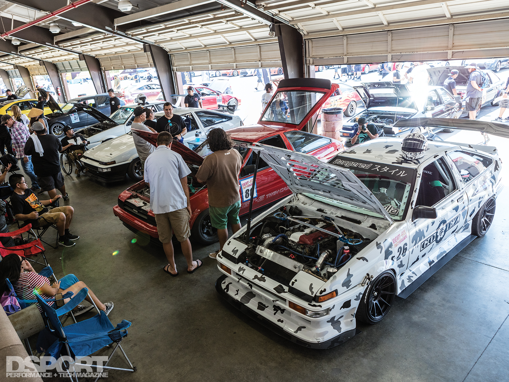 While the gates didn’t open to the public until 11am, the line for the roughly 300 registered show cars already consumed a good length of road leading into the venue. When the gates opened, 86FEST estimates that 4,500 attendees flooded the show area. Between the paddock garages, 86Fest positioned nearly 60 vendor booths supporting the event among the numerous rows of 86 chassis ranging from the ZN6/ZC6 (FR-S and BRZ) back to the original car that garnered such a cult following, the AE86 Corolla.