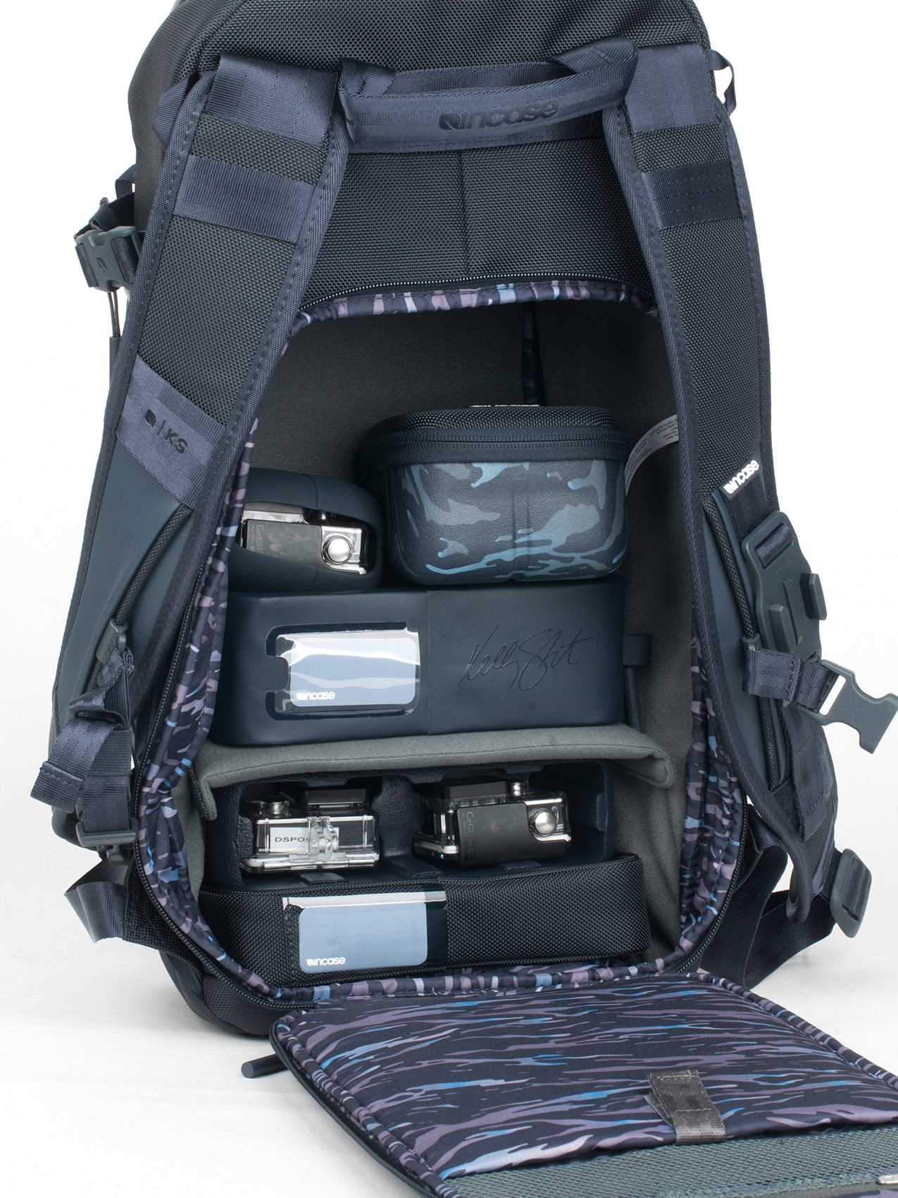 The Kelly Slater Pro Pack is the ideal solution for carrying, storing and protecting gear and accessories during shoots with GoPro® cameras. The Pro Pack’s large volume main compartment includes a customizable divider and can house multiple GoPro® cameras and additional accessories. An integrated GoPro® Hero mount on the Pro Pack’s left strap ensures the wearer never misses a shot. The included Tensaerlite™ Canister nest fits two GoPro® Hero cameras for maximum protection in a lightweight design. A removable rainfly with a custom Aqua Tiger print exclusive to the Incase x Kelly Slater collection protects the Pro Pack and its contents in wet weather conditions.