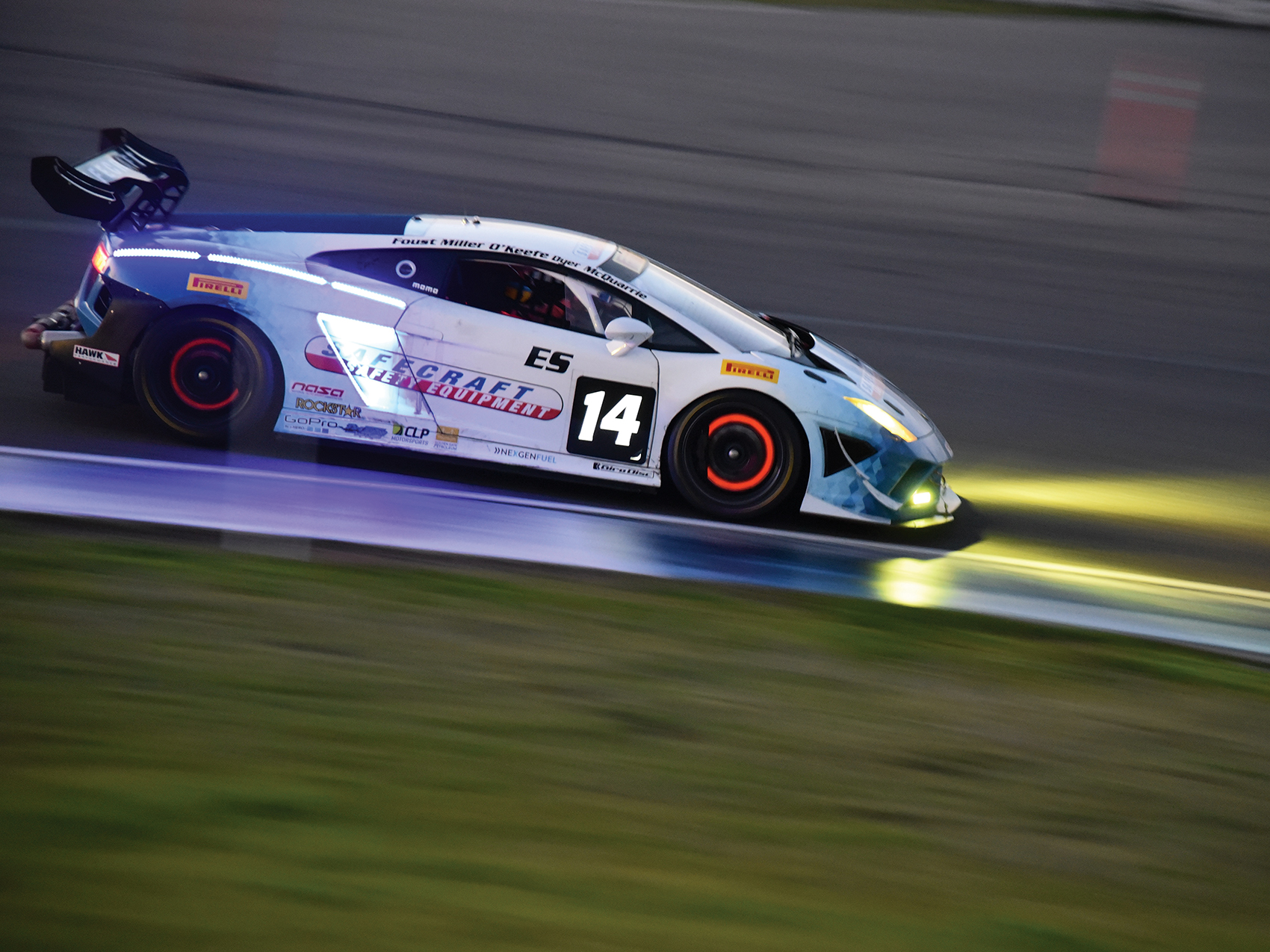 The battle of attrition took its toll on numerous teams throughout the night and, despite the extreme length of the race, some of the class podiums weren’t clear until the very end. Flying Lizard took both the overall and ES class wins in the Audi R8 LMS car with 751 laps completed, followed by its Porsche RSR teammate at 730 laps. The Ryno Racing Team Ginetta G57 prototype car won the RSR class and although it turned quicker lap times than the Flying Lizard entrants, it was six laps away from capturing the overall title.