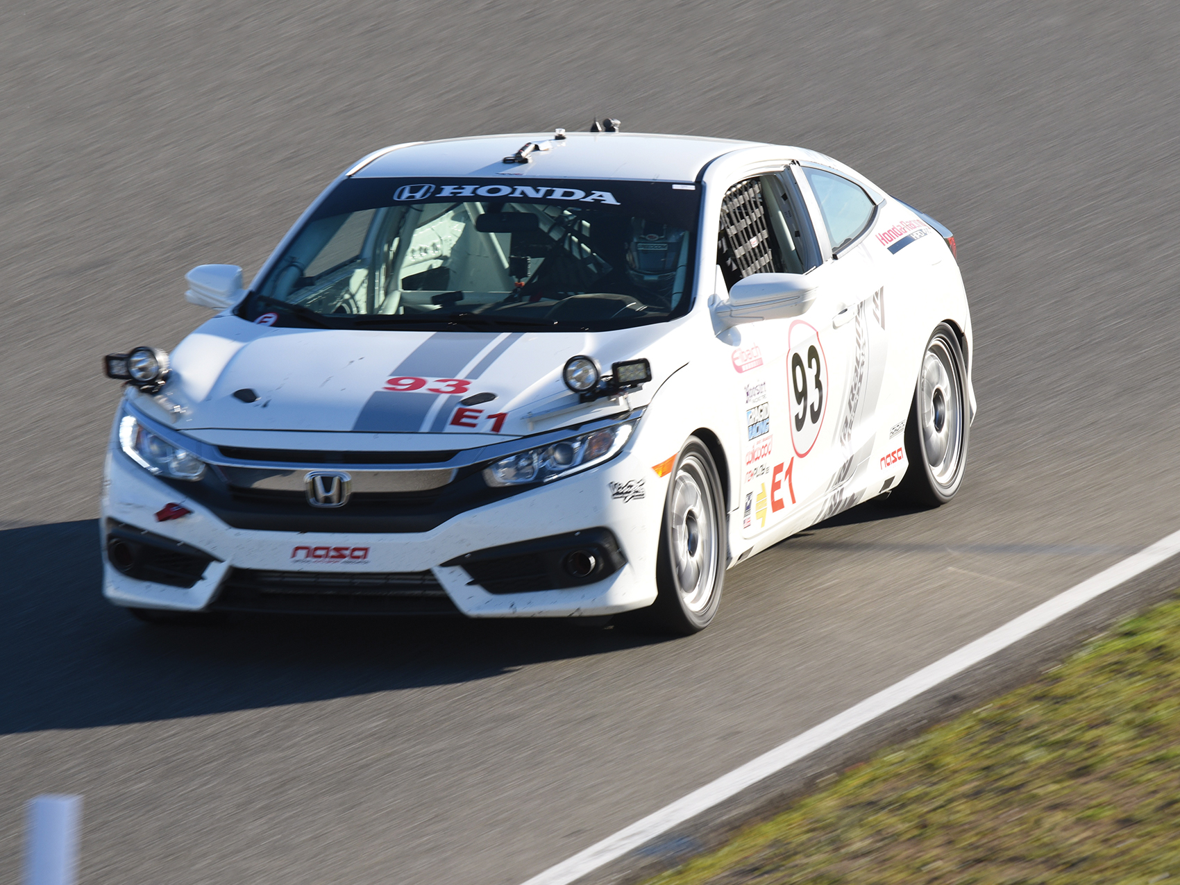 This was the 4th straight year of competition for HPDRC (Honda Performance Development Racing Club), who brought an E1 2016 Honda Civic 1.5-liter turbo coupe prepared for Pirelli World Challenge’s TCA class, and an E2 2015 Honda Civic Si coupe under NASA PTD rules. Development of both cars started late in the year and only minimal testing was done, which ultimately resulted in finding problems at the track the day before the race. We were able to recover from most of the problems prior to the race, but unfortunately, the #04 2015 Civic suffered from a broken suspension component after going off course early in the race, and the #93 2016 Civic lost a couple hours after rear ending a prototype car (driven by Al Unser Jr.) that came out of the pits without lights on during the late hours of the night. Despite the issues, the team never gave up, and was able to make the repairs and get back out on track to complete the race, finishing 12th in E1 and 5th in E2. Now that we have some time to properly develop the cars, we are optimistic for a much better result next year.