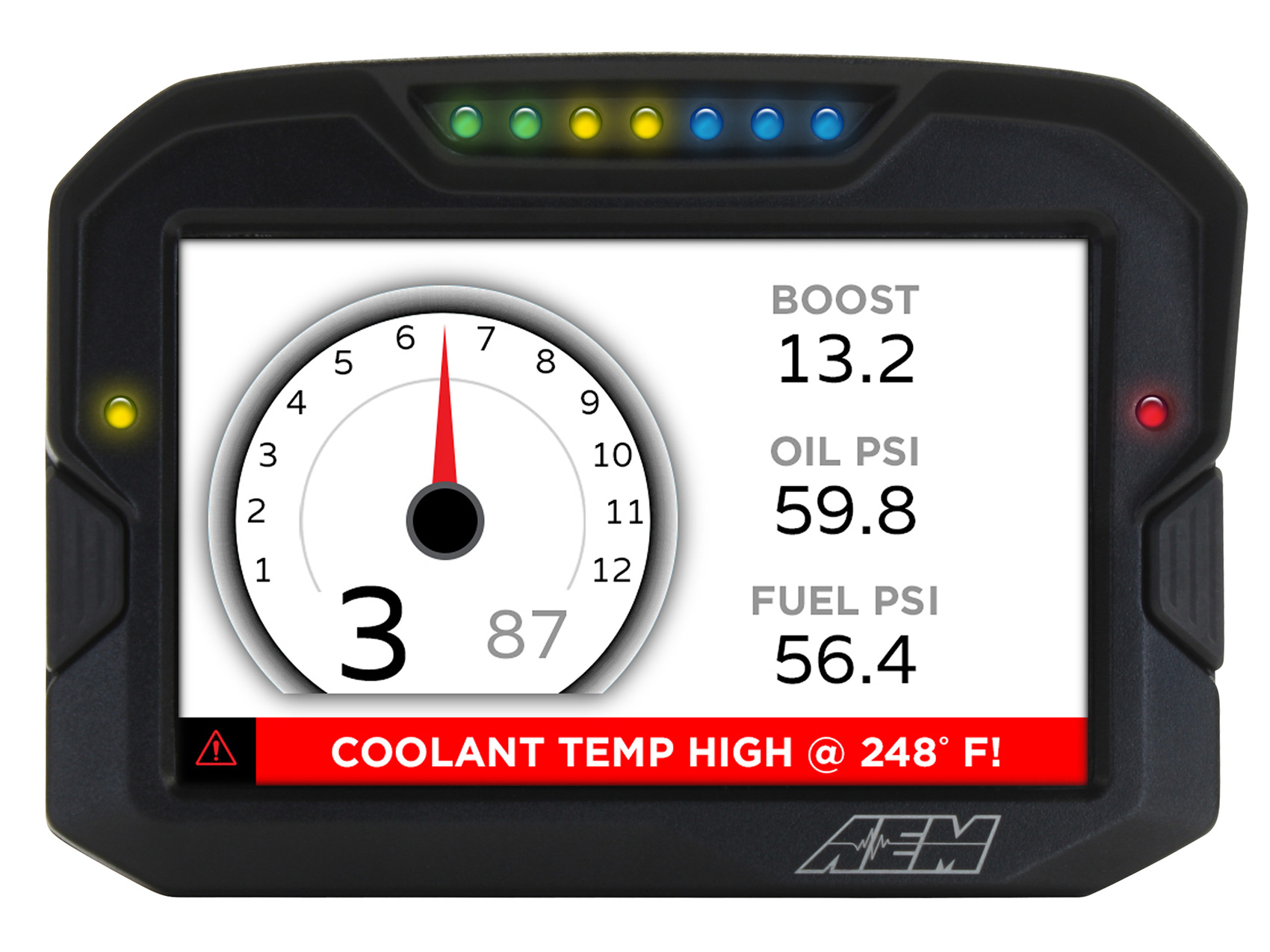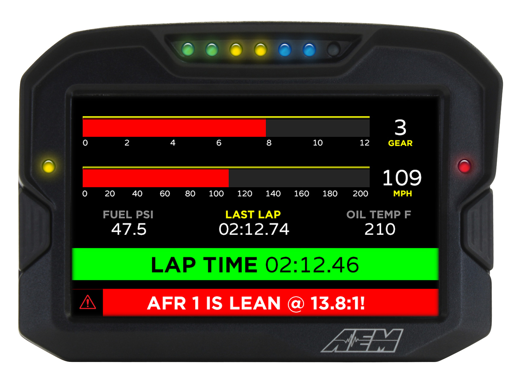 AEM’s new DashDesign Screen Editing software is free and allows users to create or customize all of the different pages in the CD-7. Users can set the channels for the supplied templates or create their own from scratch, and everything in-between! We provide multiple templates and themes to accommodate most styles including light and dark themes, high contrast, vivid color, digital and analog style displays and more. Layouts useful in drag racing, closed circuit, off road and marine elements are also included. Future templates will be added for download at no charge and users can share their designs. For racers who want to create their own custom templates, we will make the layered Photoshop files of the existing templates available so they have a road map of how to design a layout for implementation into the CD-7’s user interface. The DashDesign software is free and downloadable from the instructions tab or CD-7 product pages on our website.