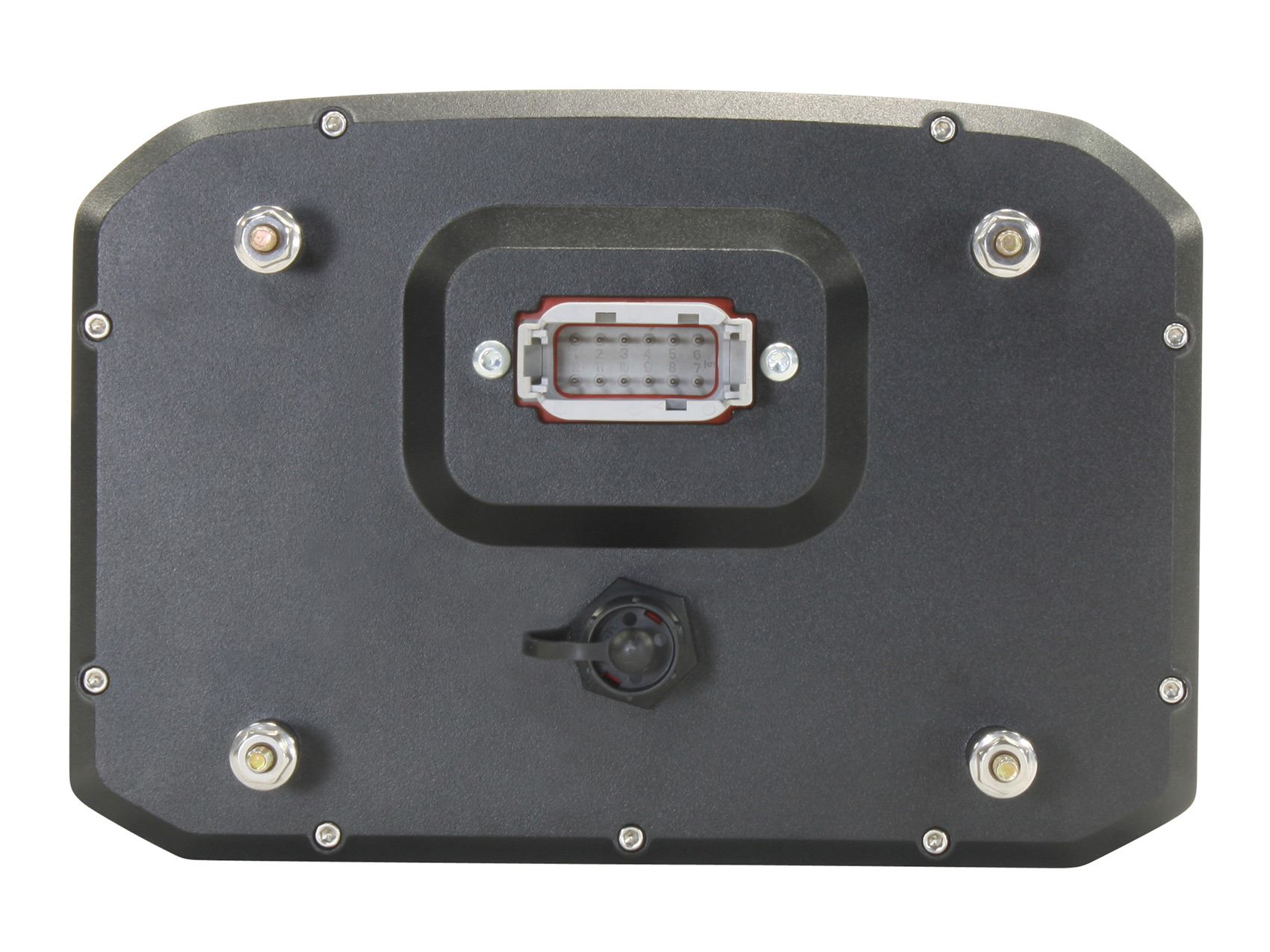 Seven ultra-bright LEDs span the top of the display housing for RPM and shift light indication. Users can program them to ascend in specific increments based on RPM range, and flash when it is time to shift. Brightness is user programmable on the fixed color LEDs. Two large buttons are included on the face of the display, allowing easy page changing and memory resetting even with driving gloves on. These button functions are also duplicated on the rear connector allowing the user to mount remote buttons on the steering wheel if desired. Two additional programmable LEDs are located above the toggle buttons on the sides of the housing.