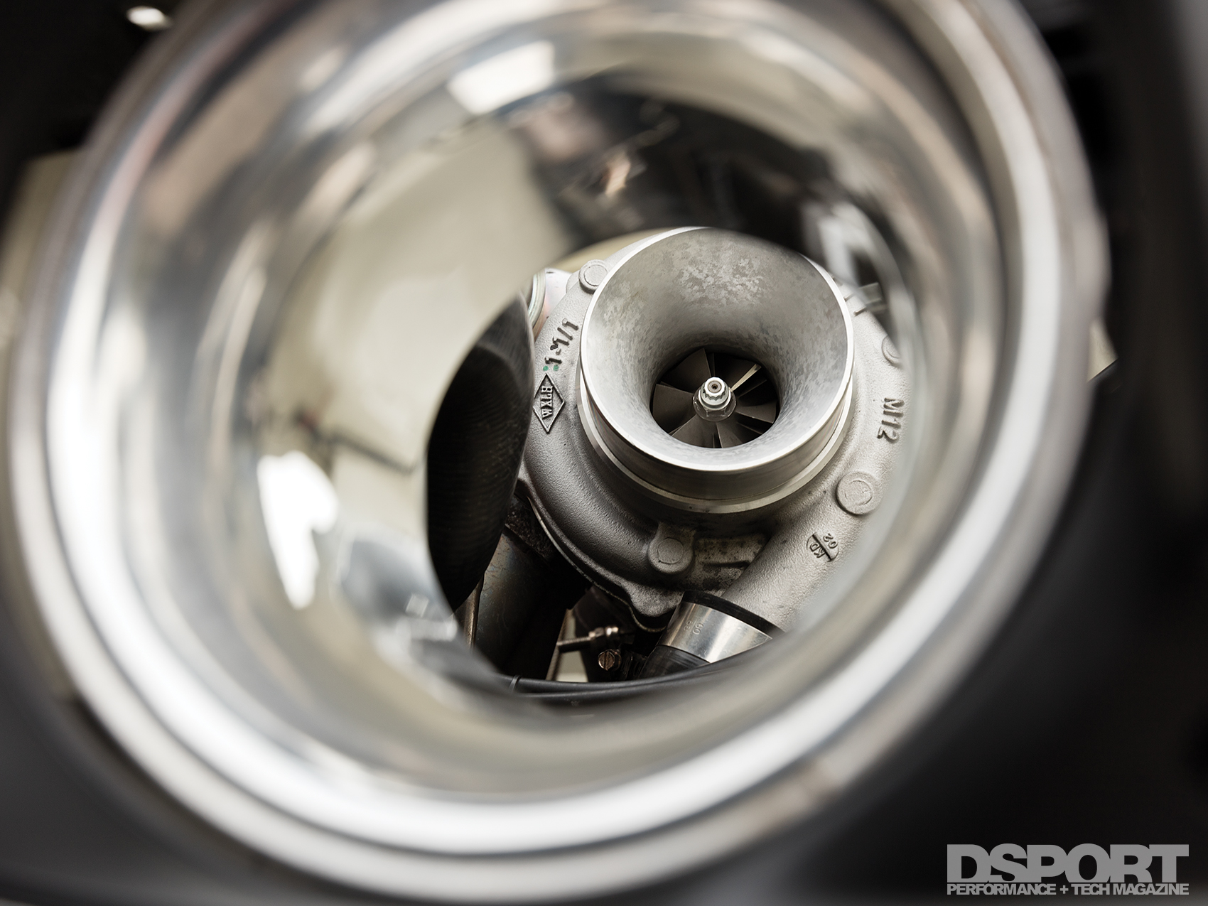 With the exhaust manifold directing exhaust gas from the ports of the cylinder head to the turbocharger, we can follow the path that the gasses take to understand how the turbo generates more power. Turbochargers have two distinct sections connected by one common shaft. On one side, a turbine section uses the energy of the exhaust gas flow to spin the shaft. On the other side, a compressor wheel within the compressor housing funnels in and compresses ambient air before directing the pressurized air charge toward the engine’s throttle body.