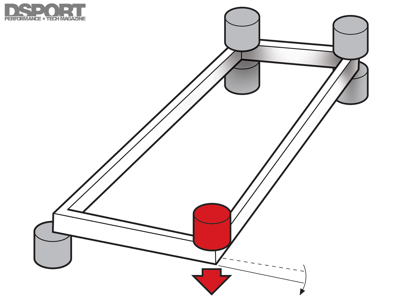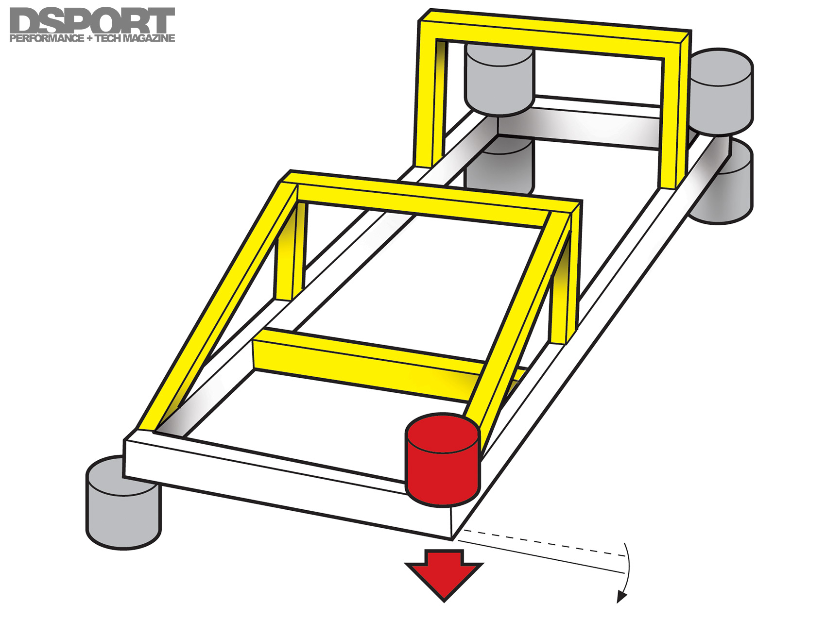 The chassis and suspension of a vehicle can be thought of as five independent sets of springs. There are the two front springs, the two rear springs and the chassis that acts as a fifth spring. If we cut a car down the middle and only look at what happens to a single spring in the front and rear along with the chassis, we are able to consider a three-spring model. When three springs are put in series, the force or load across the springs is equal. The weakest spring in the series will still deflect the most for a given load even if the other two springs are upgraded to a higher rate (stiffness). This is why some vehicles do not respond favorably to high-rate springs unless the chassis rigidity is improved first. Finally, increased torsional rigidity decreases rattles, squeaks and vibrations.