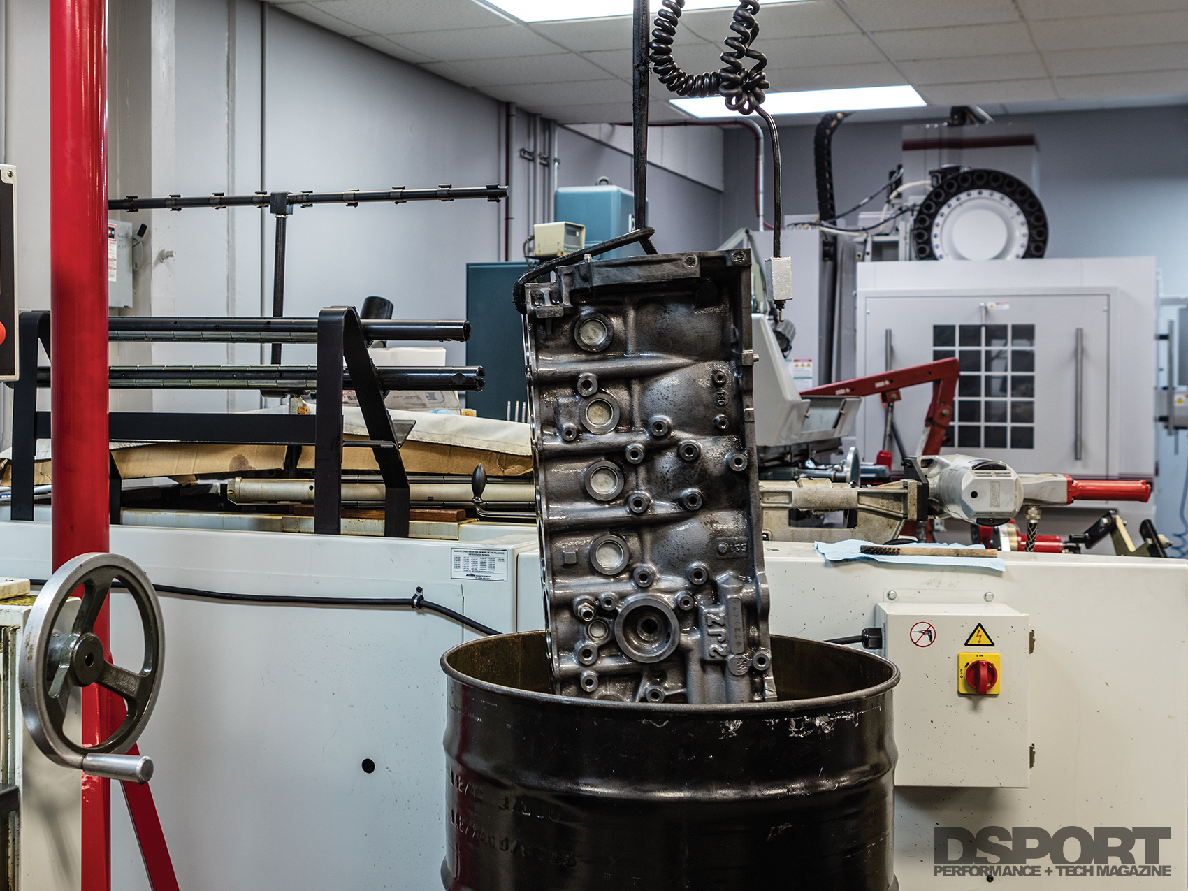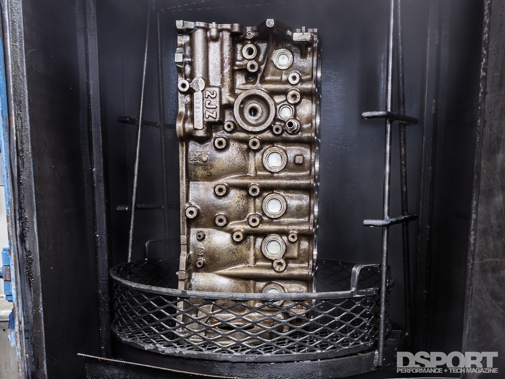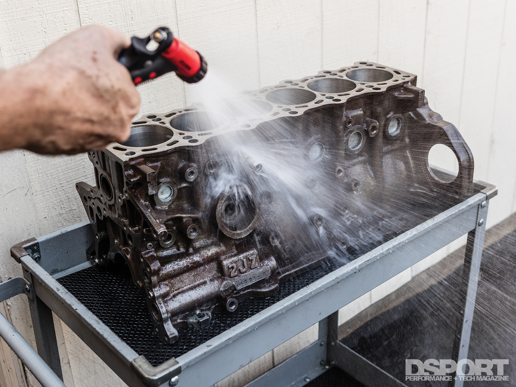 We decided to put Evapo-Rust to the test on the legendary iron block of the 2JZ-GTE engine. This engine had been recently line bored at the DSPORT machine shop and was being prepped for reassembly. Before attempting rust removal, Harris recommends a thorough cleaning of the block for best results and to ensure a long service life of the Evapo-Rust solution. To start, the block needed to be disassembled and thoroughly degreased. Once free of grease, oil and metal shavings, the engine was rinsed twice to ensure that all of the degreaser had been removed. This step is important because the alkalinity of degreasers will change the pH of Evapo-Rust, reducing its effectiveness and lifespan. After a thorough cleaning, the block was immersed in Evapo-Rust for a 16-hour period. As the block emerged from its bath, it was completely free of oxidation.