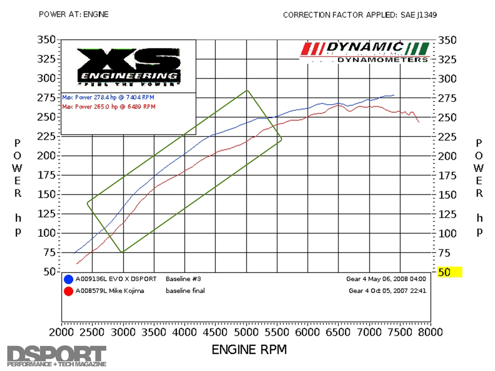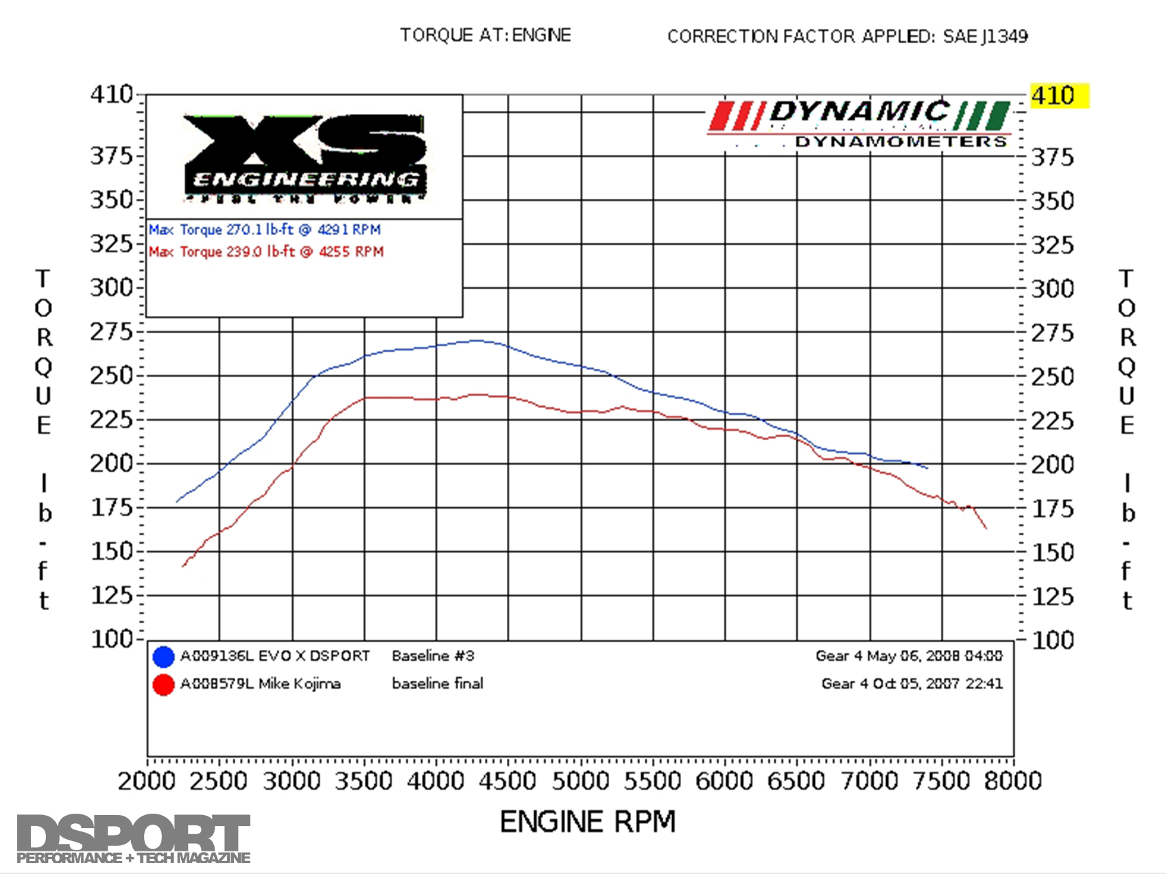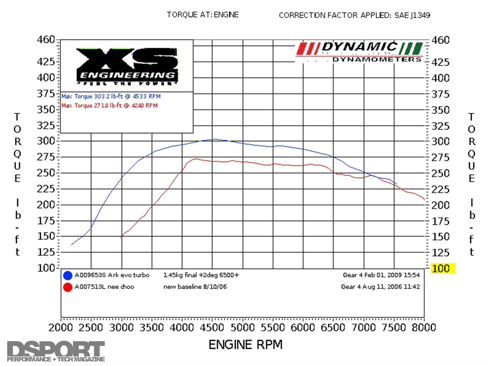 In stock trim the 4B11T engine generates substantially better low- end and mid-range power than the 4G63 engine. The 4B11 also realizes a 13.4 wheel horsepower advantage in peak power.