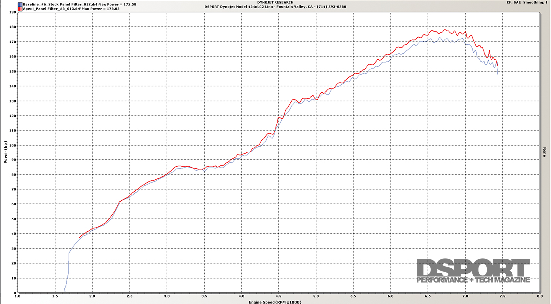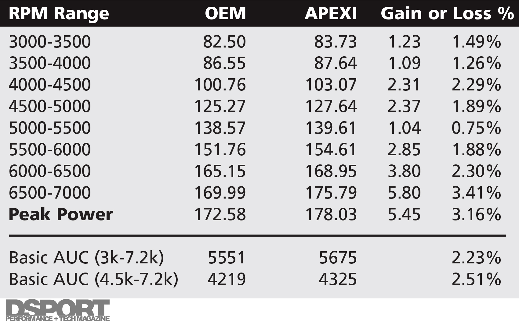 Analysis: Showing performance gains across the entire powerband, the Power Intake Filter delivered a 2.51-percent increase in the area under the power curve between 4,500 and 7,200 RPM. Peak horsepower rose 3.16 percent.