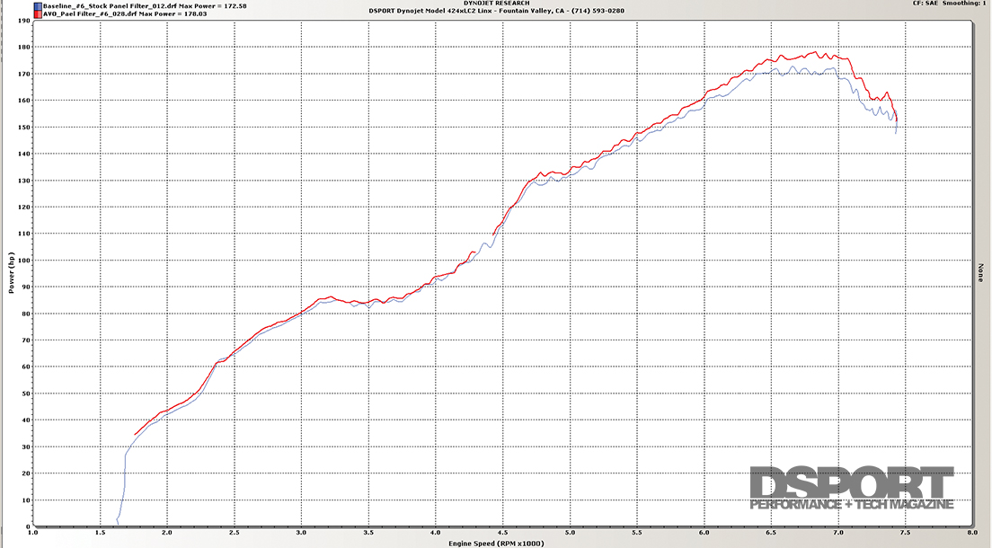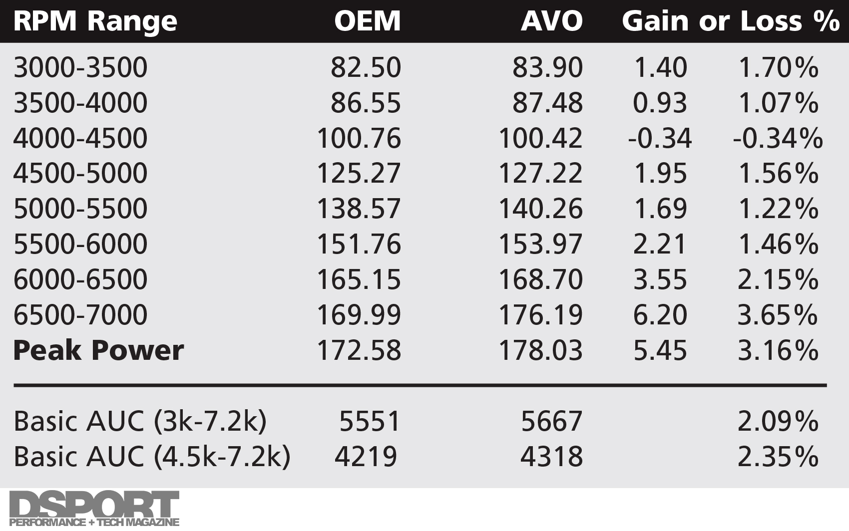 Analysis: Performance gains were realized everywhere with the exception of the 4,000-to-4,500RPM range. Peak horsepower rose by 3.16 percent while the area under the curve (between 4,500 and 7,200RPM) rose 2.35 percent.