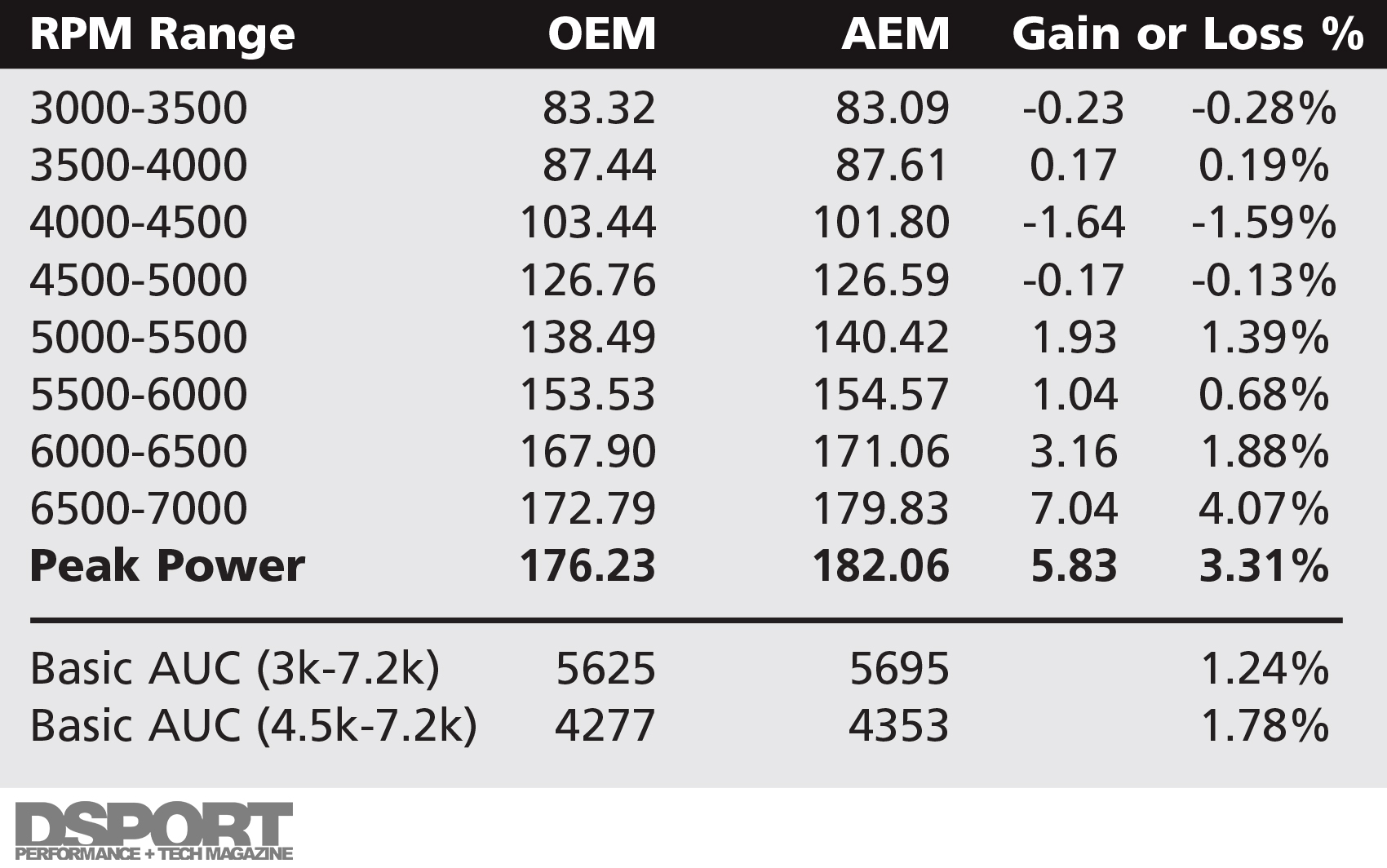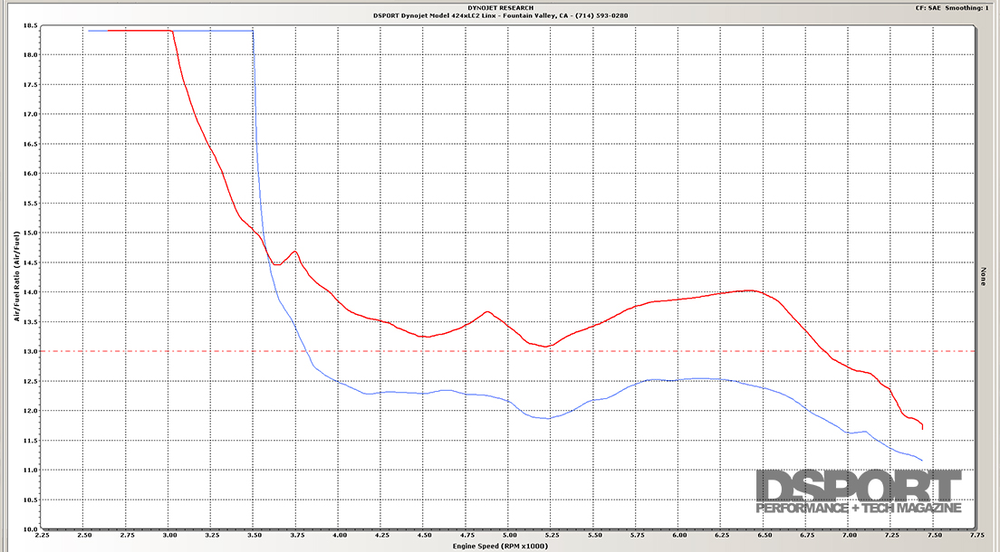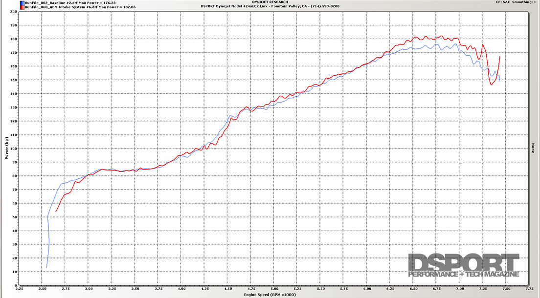 Analysis: The AEM ETI system was well engineered. Fit was exceptional and the air-fuel curve was one of the smoothest seen. Power gains were best at higher engine speeds.