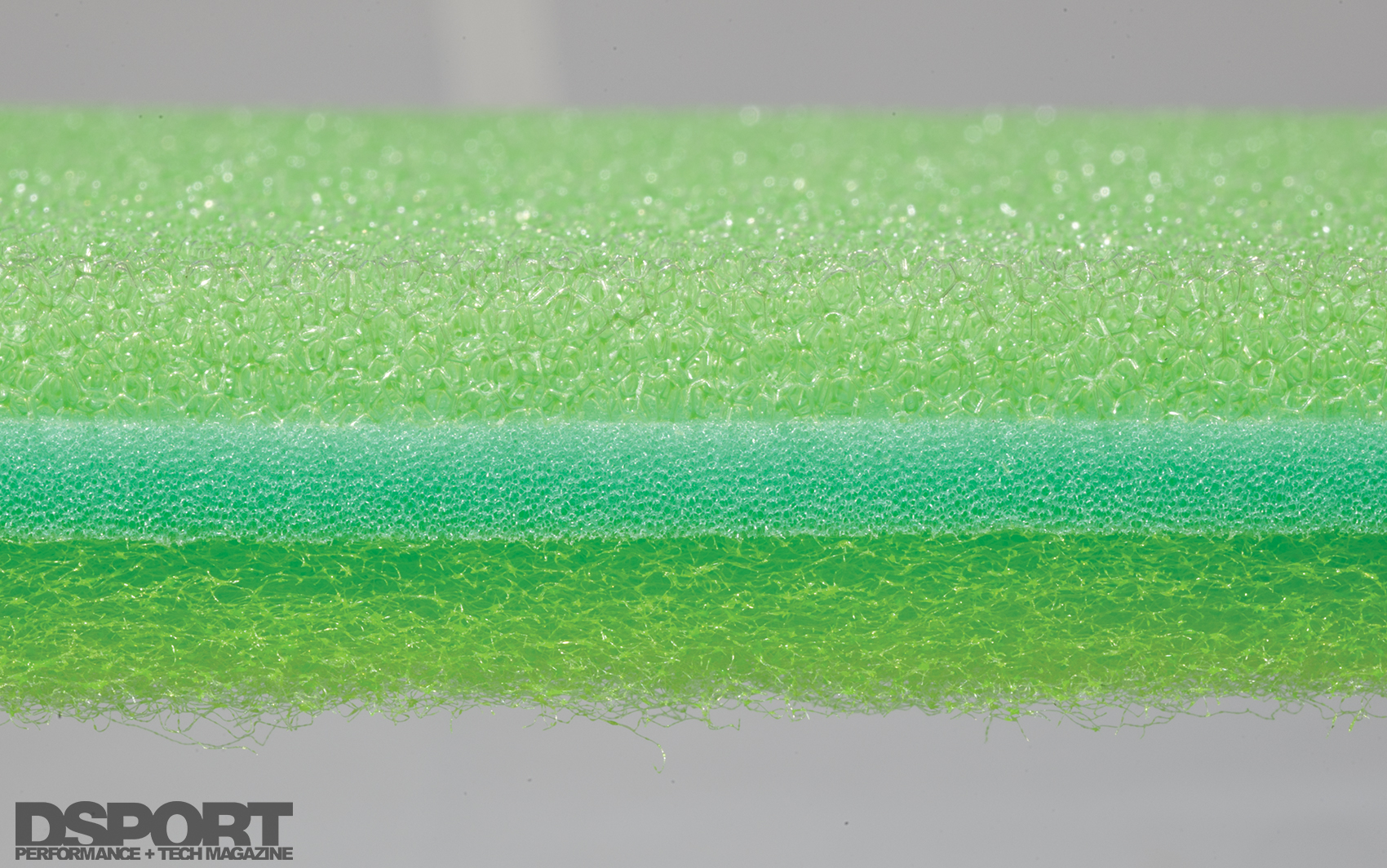 (Left) Three layers of varying density foam for maximum flow. (Right) Stainless-steel worm clamps secure the silicone hose connectors.