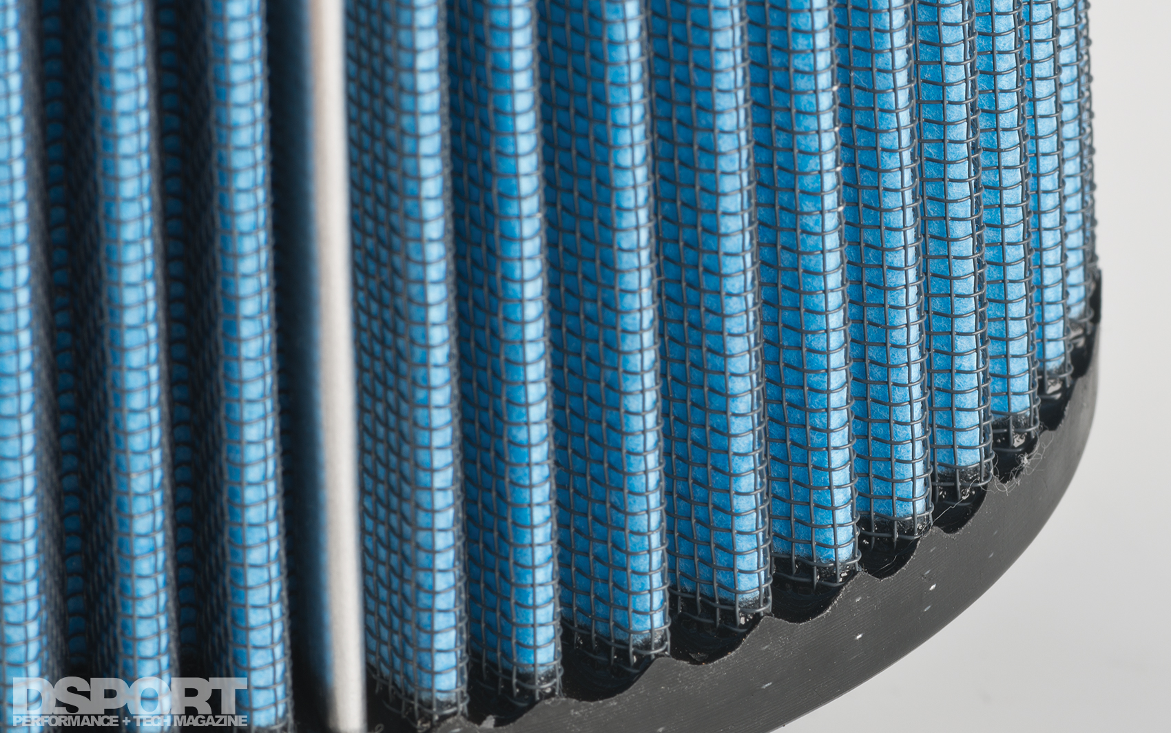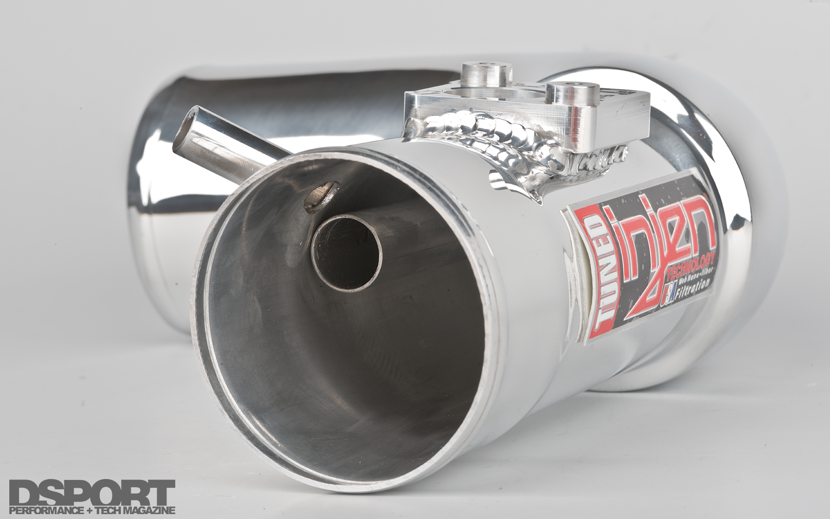 (Left) The Injen SP Intake provides a machined MAF sensor boss. (Right) The synthetic media with screen mesh