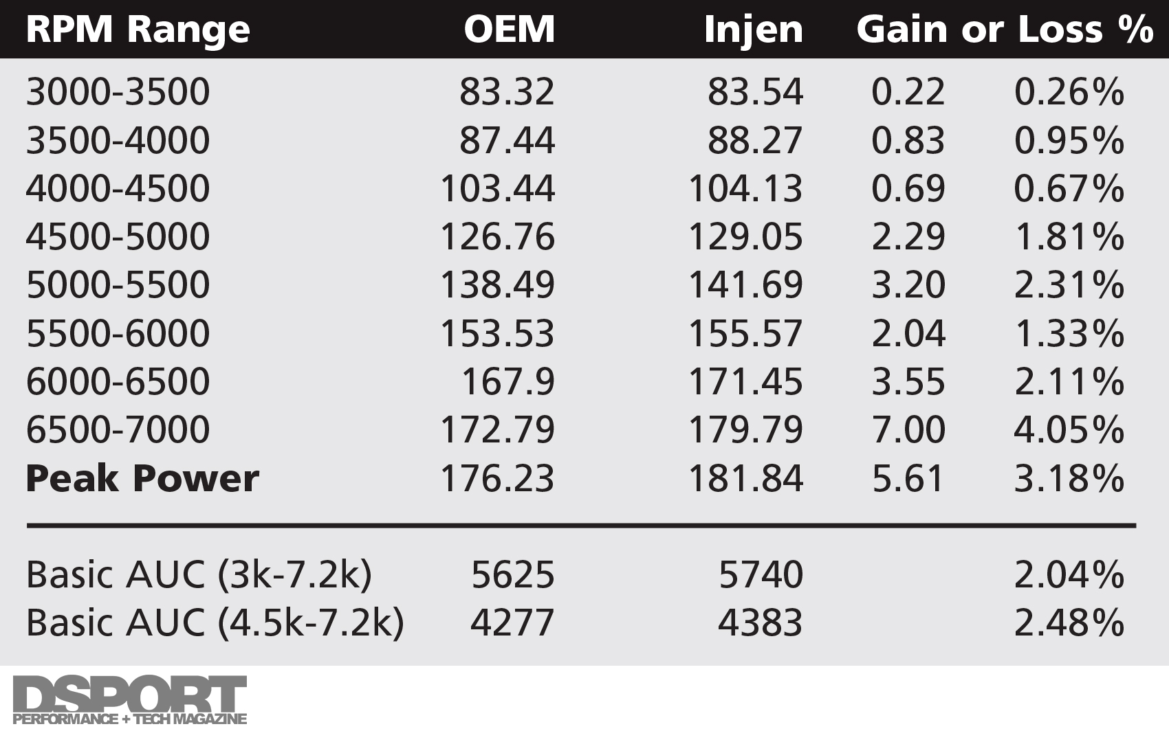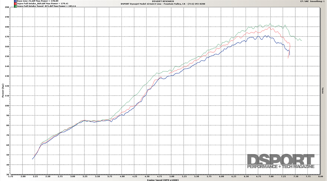 Analysis: The Injen SP Series intake system scored well from 3,500 RPM until redline. The OE mounting points are used to to secure the air box. Overall, a good fit but rubber mounts or grommets would be a nice addition.