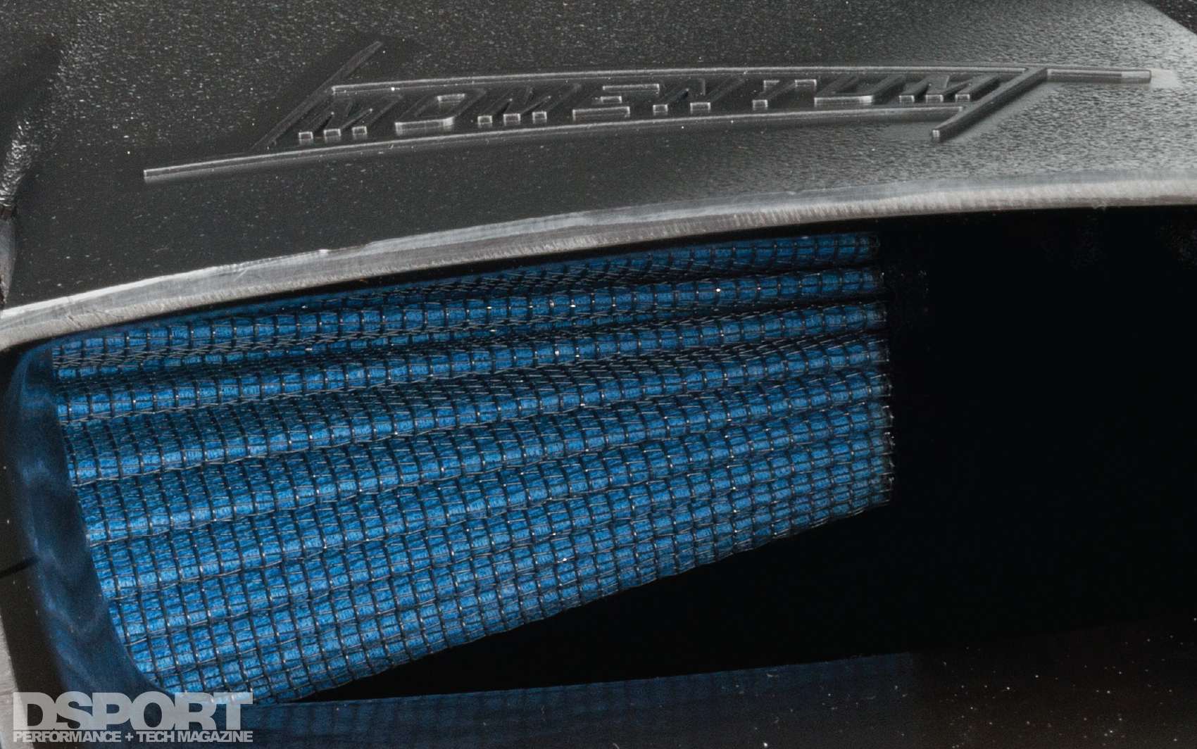 (Left) A five-layer synthetic, oiled media is used on the cone-shaped filter. (Right) This is a view of the filter through the airbox inlet.
