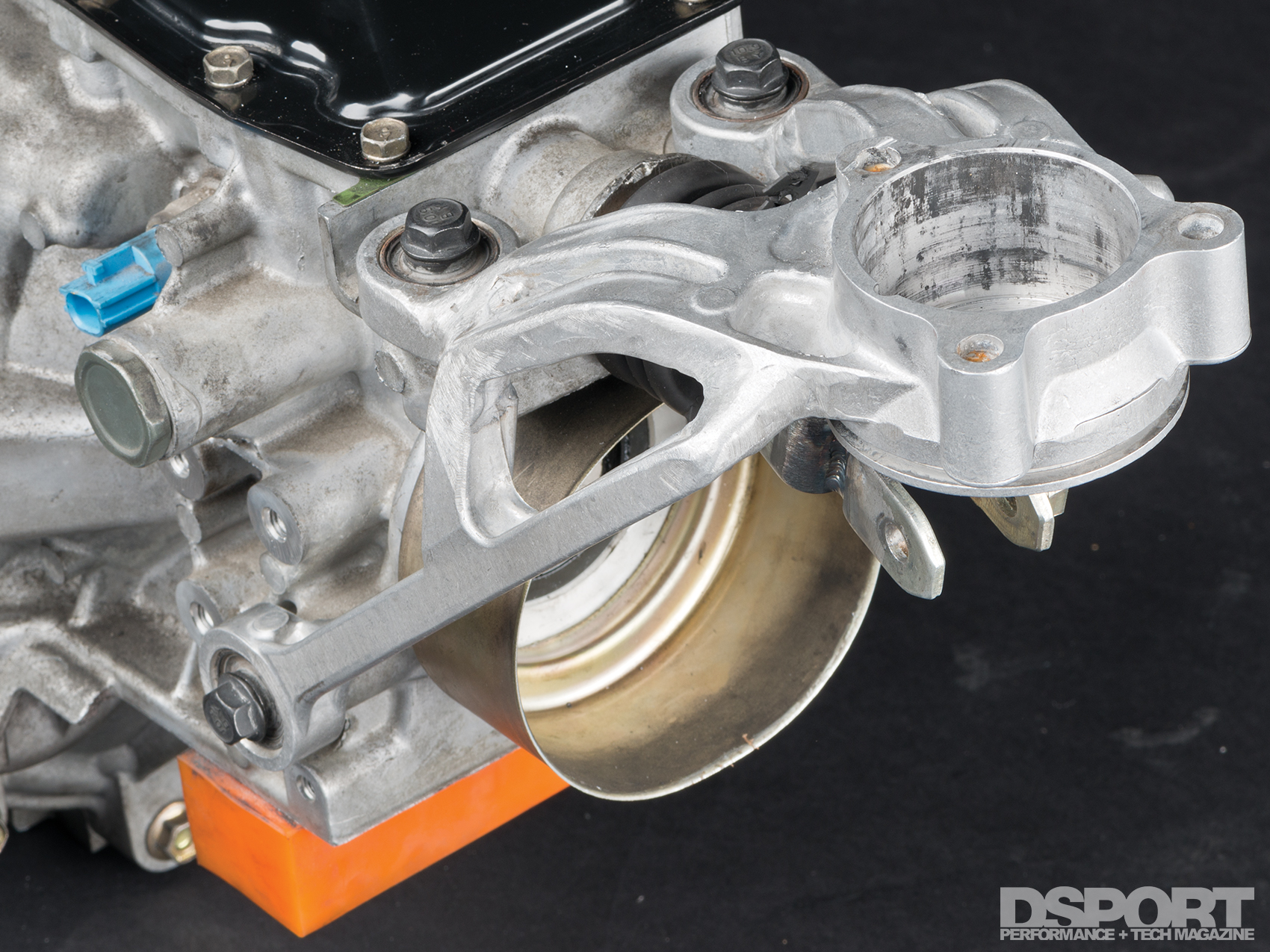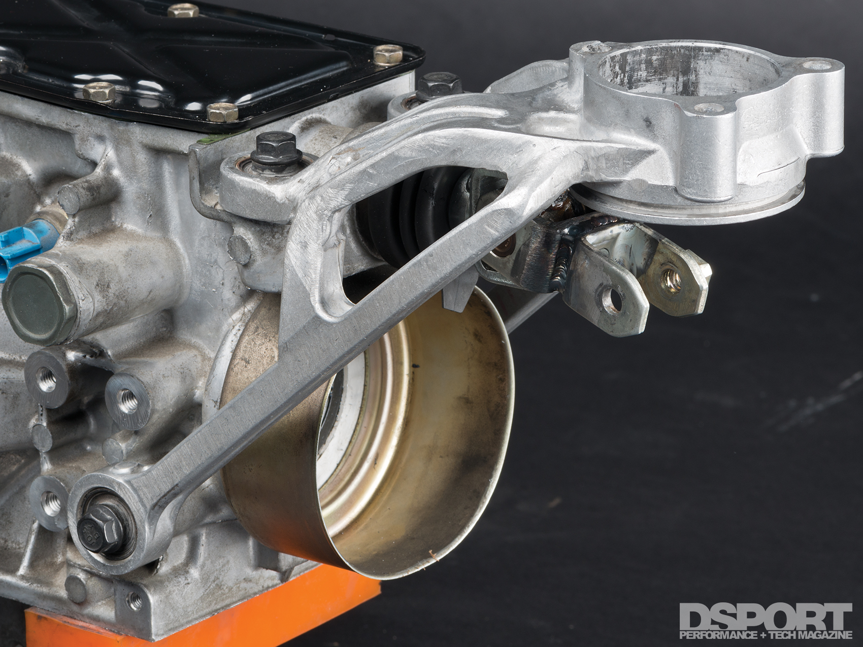 What transmission has six speeds, the potential to survive over 800 horsepower and a $1,700 street price? It’s the six-speed transmission from the Nissan 350Z. The Nissan part number 32010-CD009 transmission is the updated and improved-synchro edition of the six-speed found in the later 350Zs. While this FS6R31A transmission isn’t a simple bolt-on replacement for the original 5-speed in the 240SX, JWT has already made some of the key pieces needed to put the 350Z’s six-speed transmission on to an SR or KA engine. With the help of The Driveshaft Shop and the combined talents of our DSPORT engineering, machining and fabrication staff, we were able to perform the first-successful 6-speed transplant in a KA24/240SX S14 using the JWT bellhousing adapter and JWT clutch system.