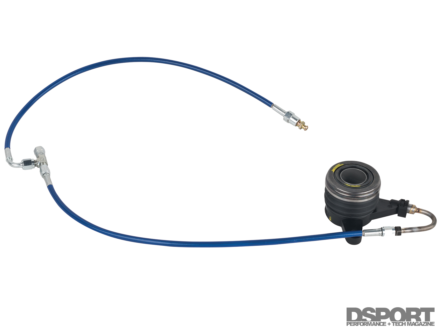 A custom braided-steel outer, Teflon inner -3AN hose mates to a brazed fitting on the modified stock hydraulic line. Mesa Hose (949.645.2661) made the custom setup for us.