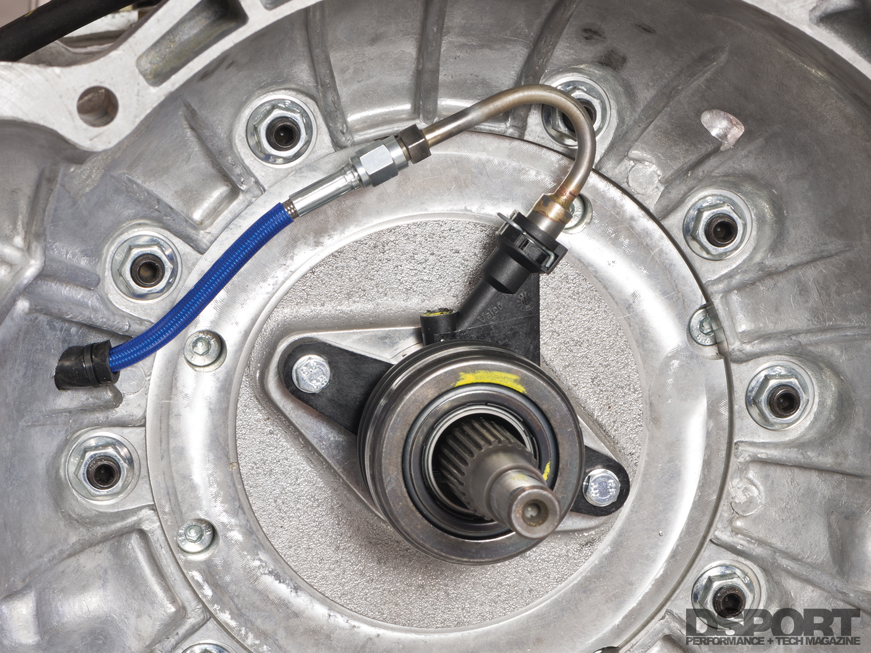 If the story stopped here, it would sound like we tackled a challenging and involved project without much incident. In fact, the transmission actually came in and out of the vehicle no less than a half-dozen times (we lost count somewhere along the way) and we annihilated three hydraulic release assemblies in the process. Fortunately, no one else will have to suffer the same since we found the solution to the issue and it has since been remedied. The hydraulic release assembly was originally positioned too far forward on the JWT adapter kit with our clutch combination. This was causing the release assembly to contact the clutch disc and immediately get wiped out. After pinpointing the issue and following up with measurements (and numerous checking installations), we solved the problem. Now, all of the JWT adapter kits provide this optimized position of the hydraulic release assembly. Since the clutch master cylinders are the same bore in both the 240SX and 350Z, the pedal adjustment can be made on the factory pedal assembly.