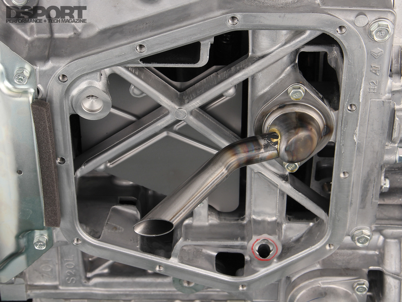 There are two oil drainback lines from the intake plenum to the sump, via the Positive Crankcase Ventilation (PCV) valve suction pipe and blow-by separator. We found this design interesting, since it is different from the conventional designs.